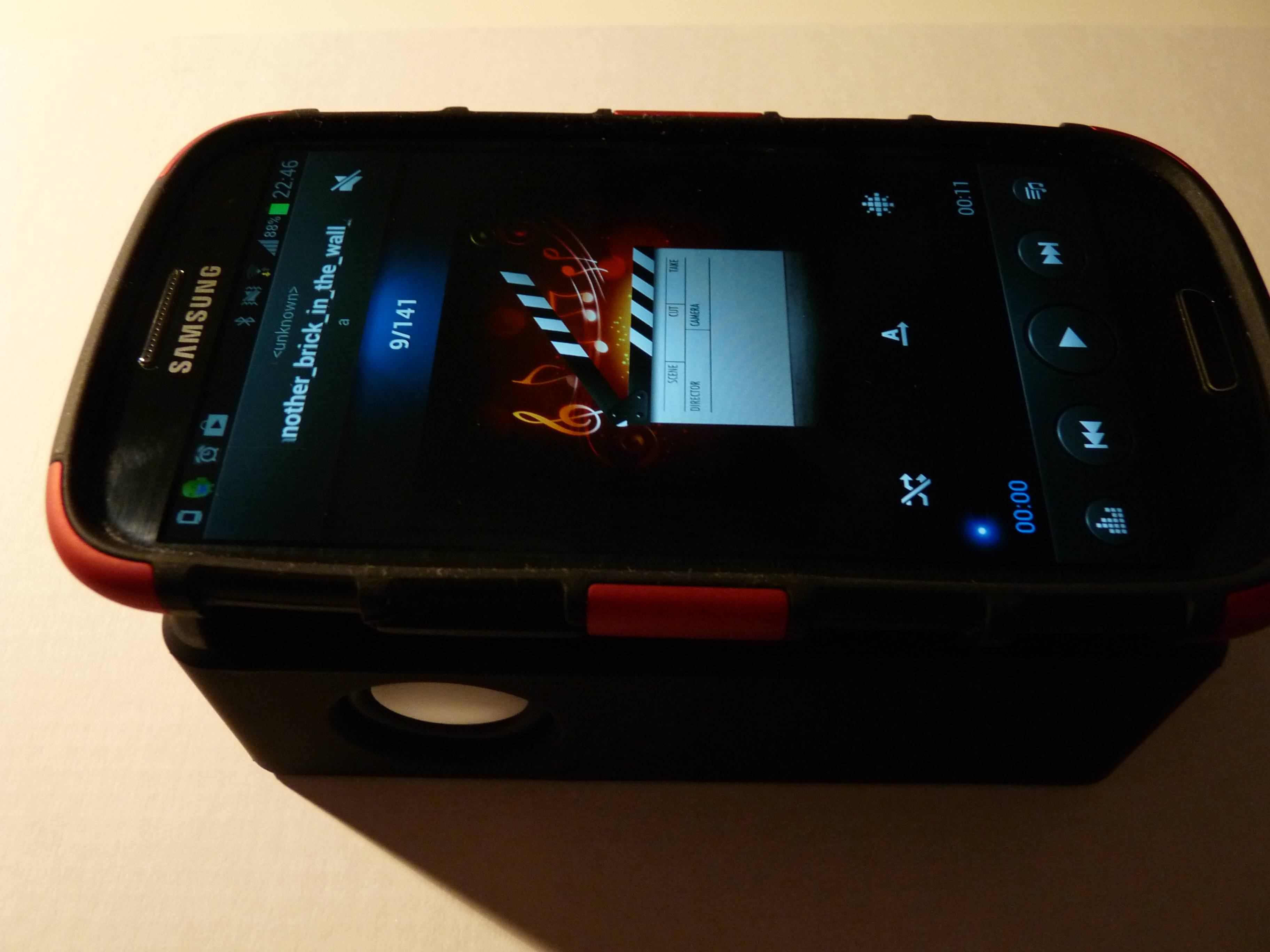 Es macht keinen Unterschied, die Musikwiedergabe über die boomer magic Box klappte in beiden Fällen. Das HTC Rhyme auf die Oberseite gelegt, Musik abgespielt… und es klappt. Beim Galaxy S3 ist der Bumper sogar recht dick und an der Unterseite mit einem Metallständer, aber selbst das machte nichts aus, auch hier funktionierte die Wiedergabe von Medien problemlos. Dabei gilt allerdings zu beachten, dass man sein Smartphone möglichst gerade auf die Oberseite der Box legt, sonst kommt es u.U. zu kleineren Verzerrungen. Ansonsten waren wir tatsächlich erstaunt, dass es tatsächlich so einfach klappt, wie es uns versprochen wurde. Keine Tricks und keine Haken sind dabei, Verkabelung ade.