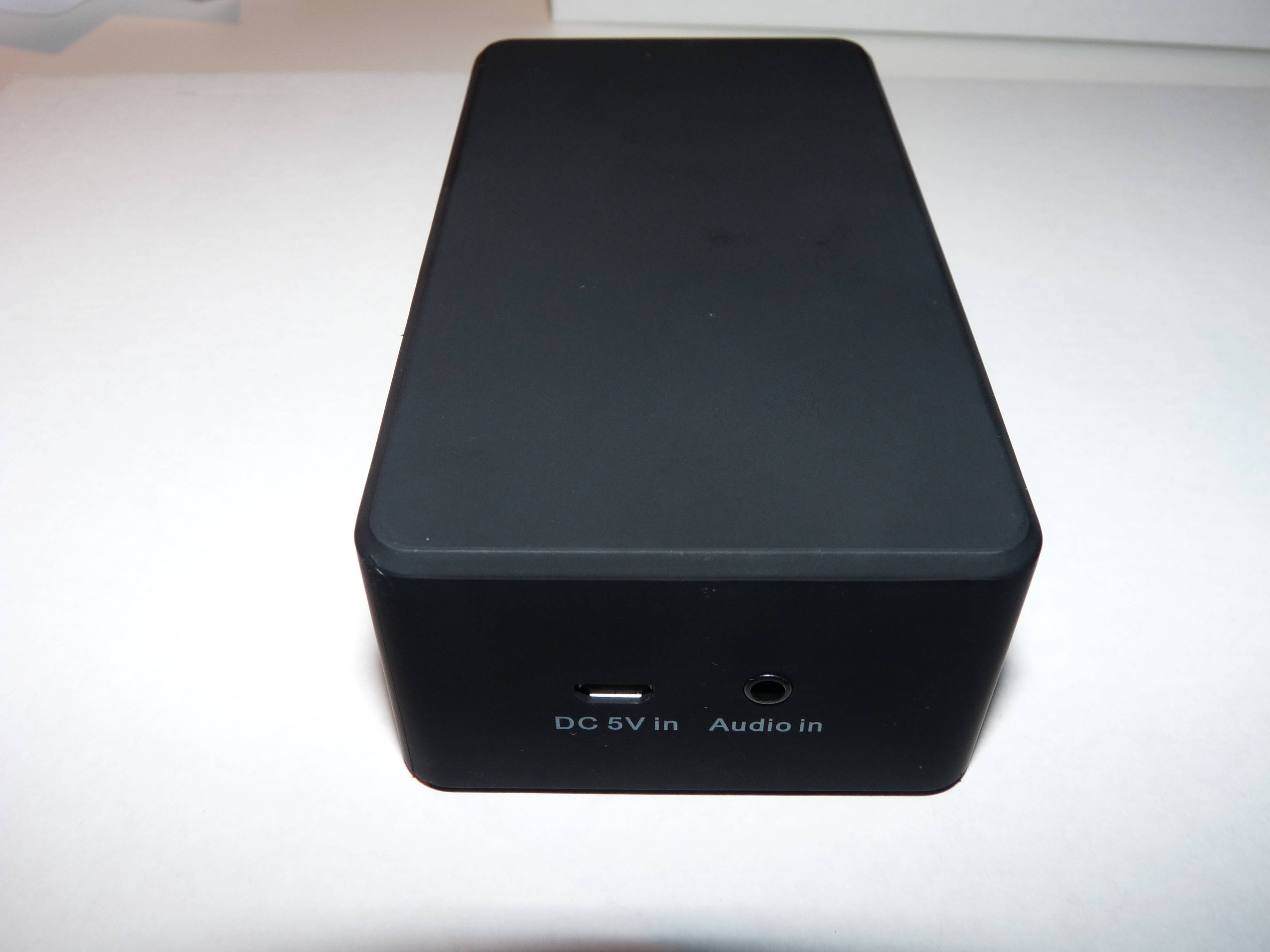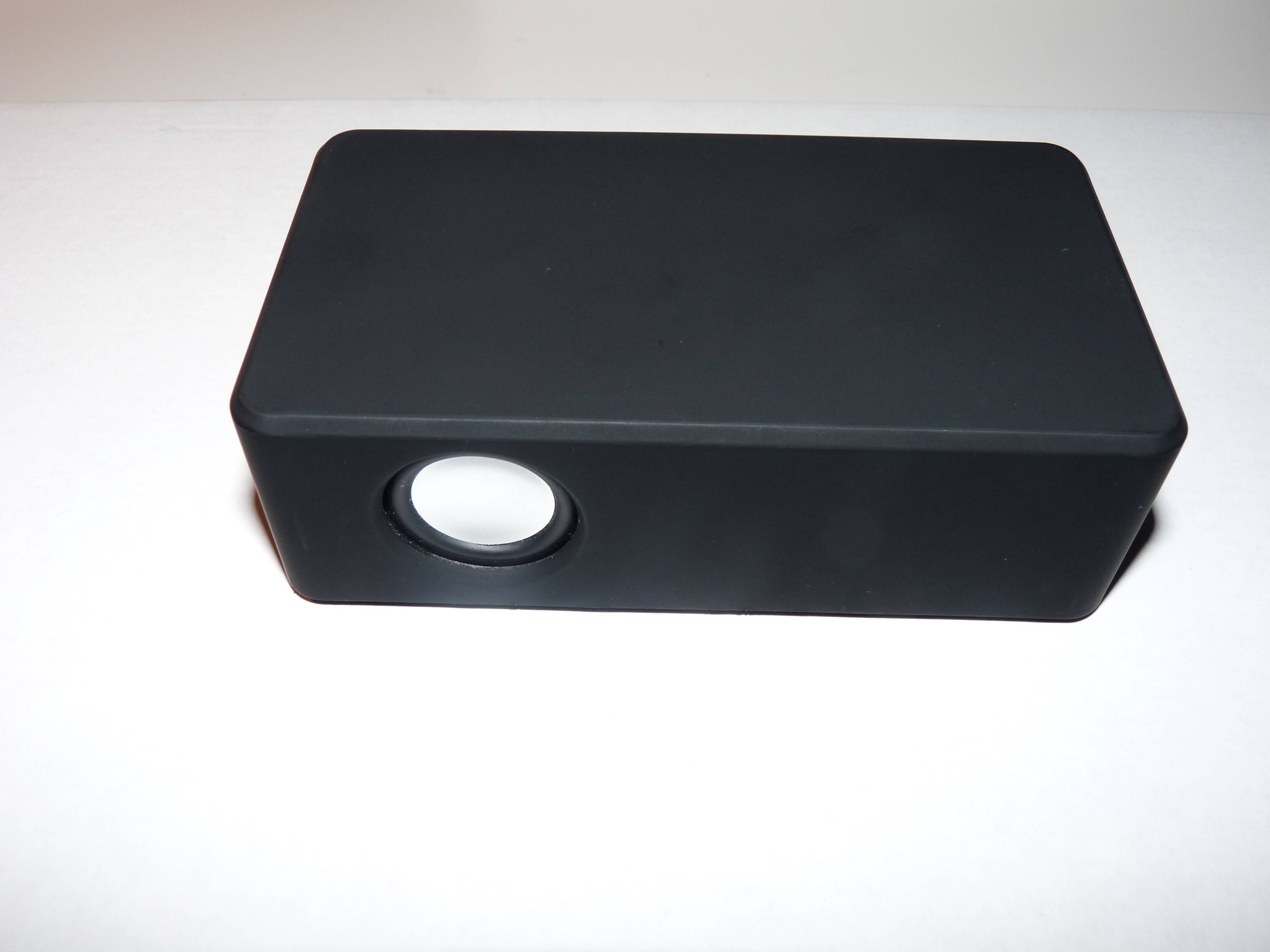 Die rechteckige Box besitzt ihre 2 Lautsprecher jeweils an der langen Seite, beide mit einer Leistung von jeweils 2 Watt. Am einen Ende sitzt der einsame On-Off Schalter, verziert mit einer Kontroll-LED. Gegenüber sitzen der bereits erwähnte Micro-USB Anschluss und ein Audio In Eingang. Alles ist klar definiert und beschriftet, Missverständnisse können gar nicht aufkommen. An der Unterseite sitzt mittig das Batteriefach, während am Rand die 4 Füßchen für einen sicheren Stand sorgen. Die Oberseite ist komplett blank, denn da soll ja später das Smartphone auch aufliegen. Die boomer magic besteht aus Plastik mit einer gummierten Oberfläche, sie liegt gut in der Hand und ist ein kleines Fliegengewicht. Die Abmaße sind 123 x 62 x 40 mm.
