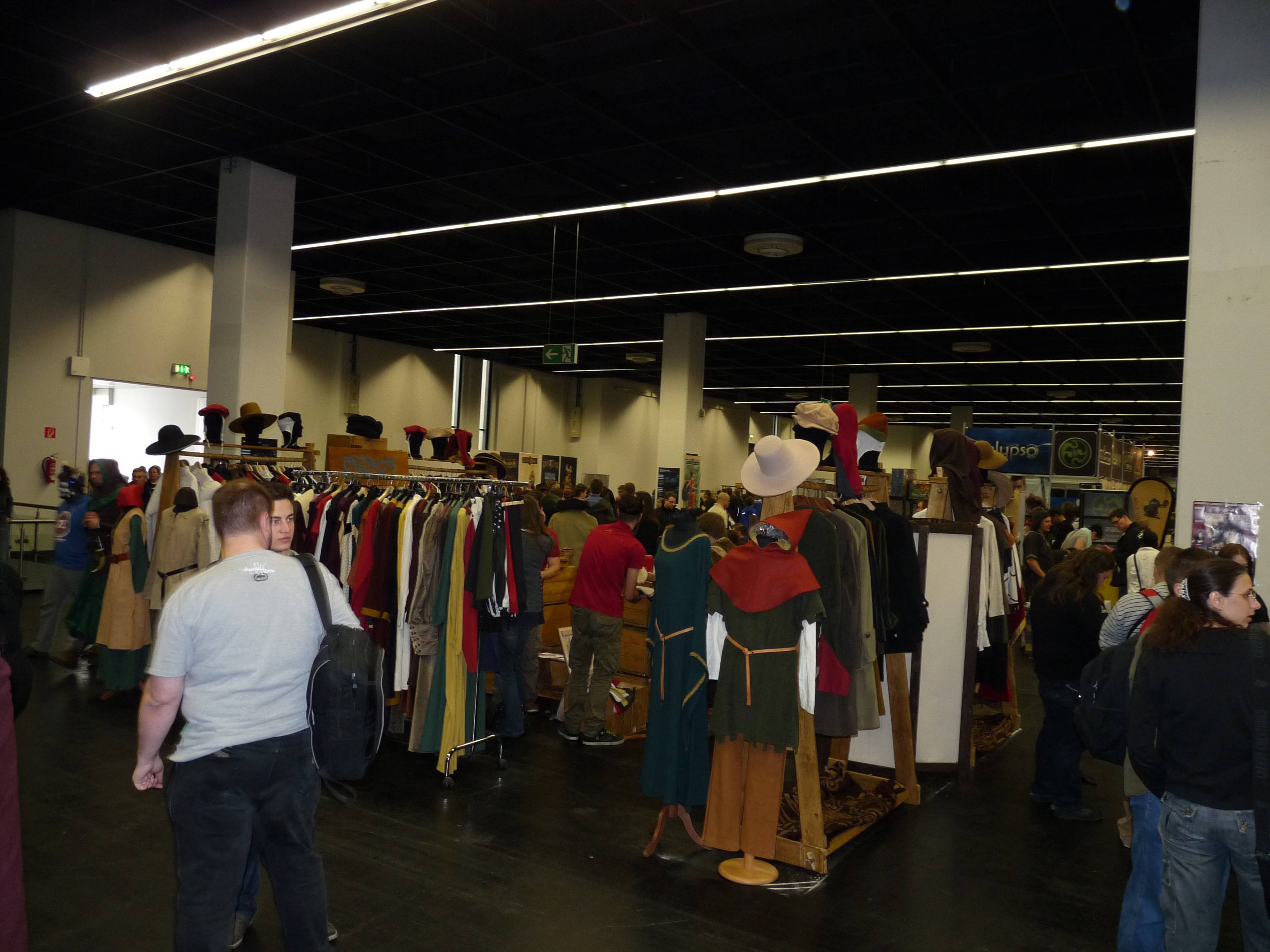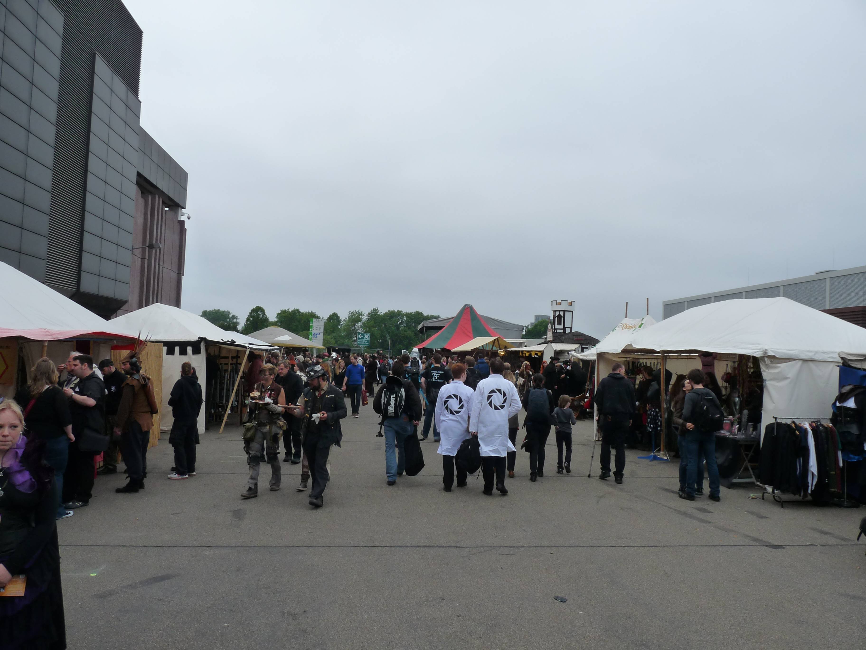Wer kein Cosplay hatte oder sich noch in die Welt voller Abenteuer stürzten wollte, der bekam auf der RPC viele Möglichkeiten, sich mit allerhand Klamotten und Rüstungen einzudecken. An unzähligen Ständen konnte man sich neue Kleidungsstücke kaufen. Stumpfe Klingen und hölzerne Bogen lagen scharenweise aus und durften fleißig ausprobiert werden. Und am Stand nebenan konnte man sich dann auch noch gleich mit den passenden Tränken für das Gelage am Abend eindecken, natürlich in optisch ansprechenden Gefäßen abgefüllt.
