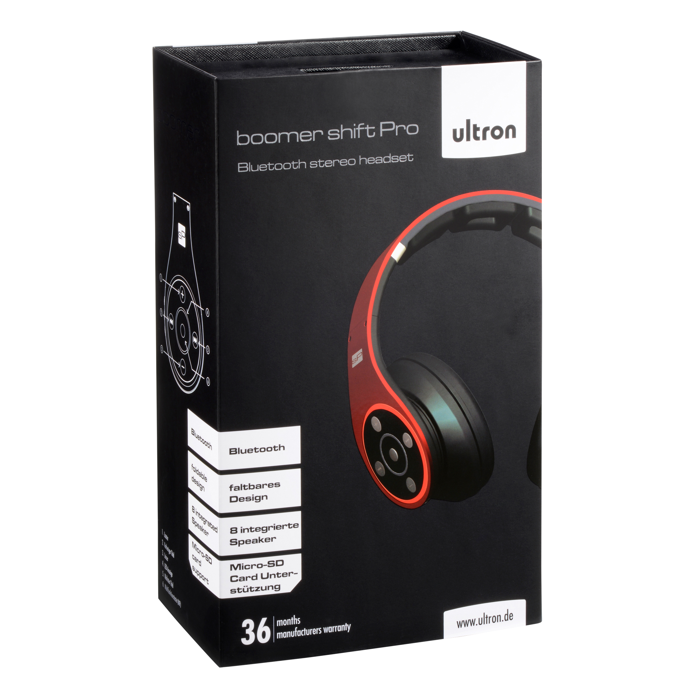 Schickes rotes Design trifft auf schnelle blaue Übertragungstechnik / Bluetooth-Kopfhörer „boomer shift Pro“ von ultron mit Micro-SD-Kartenslot, acht integrierten Lautsprechern, Freisprecheinrichtung und 23 Stunden Akkudauer.