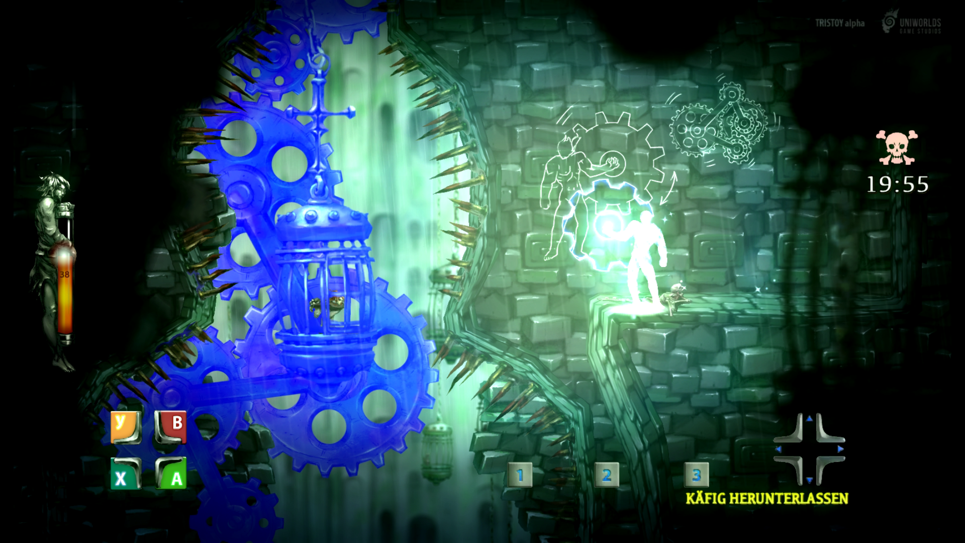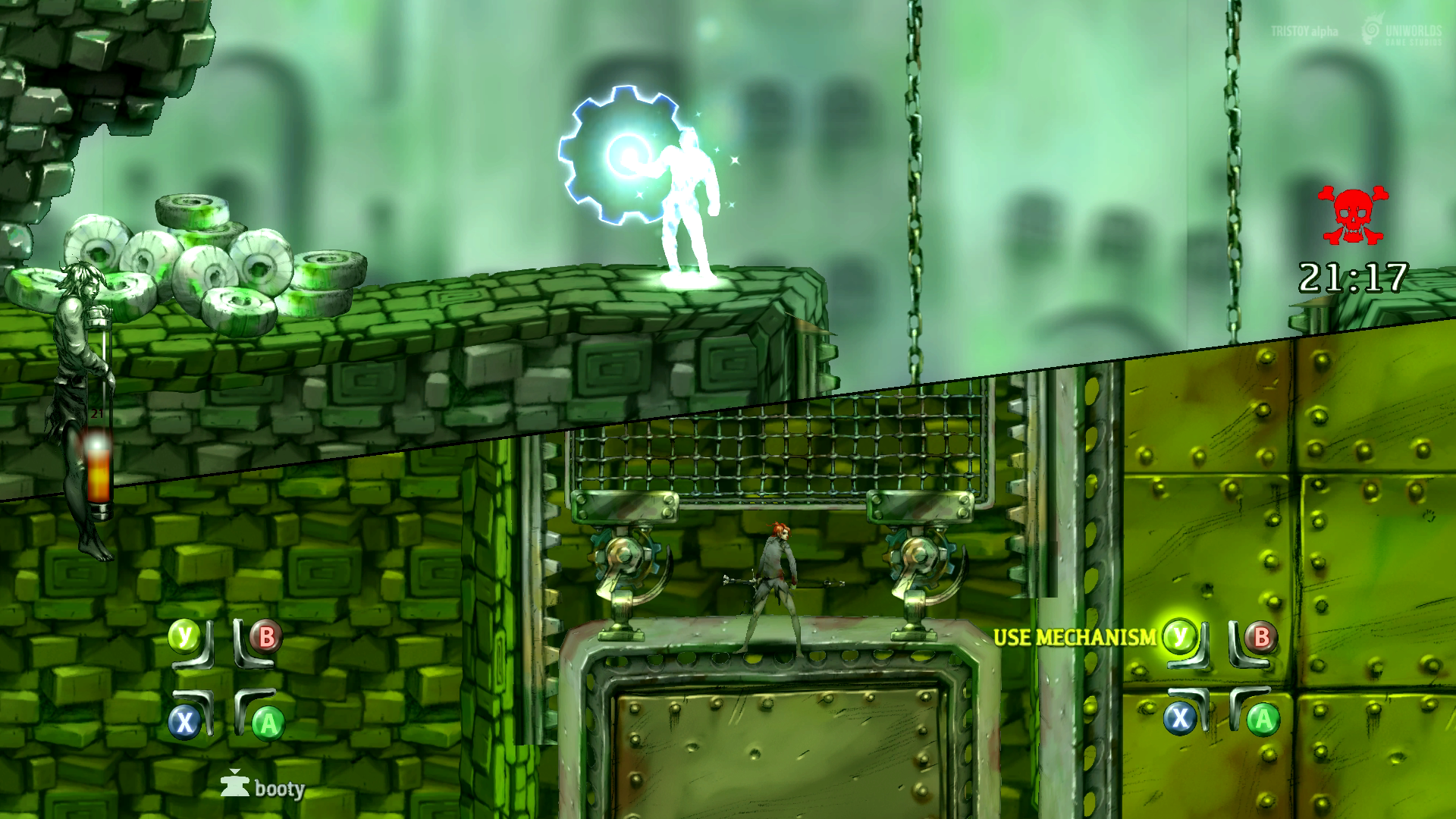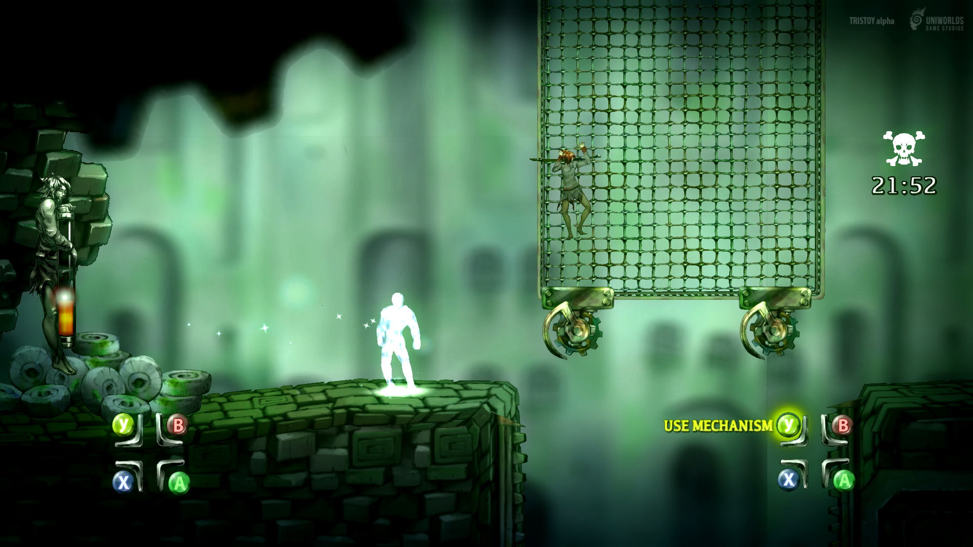 Tristoy ist ein waschechter Koop-Plattformer. Jeder Spieler übernimmt einen Charakter mit besonderen Fähigkeiten und nur in gemeinsamer Interaktion wird man die zahlreichen Level schaffen können. Interessant: Innerhalb des Spiels werden gelegentlich Dialoge mit alternativen Antwortmöglichkeiten eingeblendet. Je nach Entscheidung sollen so mehrere Spielwege eingeschlagen werden können. In der uns gezeigten Demo wurde gerade ein Blondling (dessen Namen wir leider vergessen haben) von einem Geist ( dessen Namen wir ebenfalls verschwitzt haben) gerettet und beide versuchen einer Art Gefängnis zu entfliehen. Dabei nutzt der Geist seine übersinnlichen Fähigkeiten und hilft der verwundeten Dame, die allerdings auf Knopfdruck ordentlich mit ihren scharfen Klingen umher wirbelt. Durchdacht wirkt die Ansicht im Splitscreen, denn die dynamische Sicht visualisiert immer, wo sich euer Mitspieler befindet und wird zu einem Bild, sobald beide nahe beieinander stehen. Freuen wir uns gegen Ende des Jahres auf knifflige Rätsel und spannende Stunden im Koop.