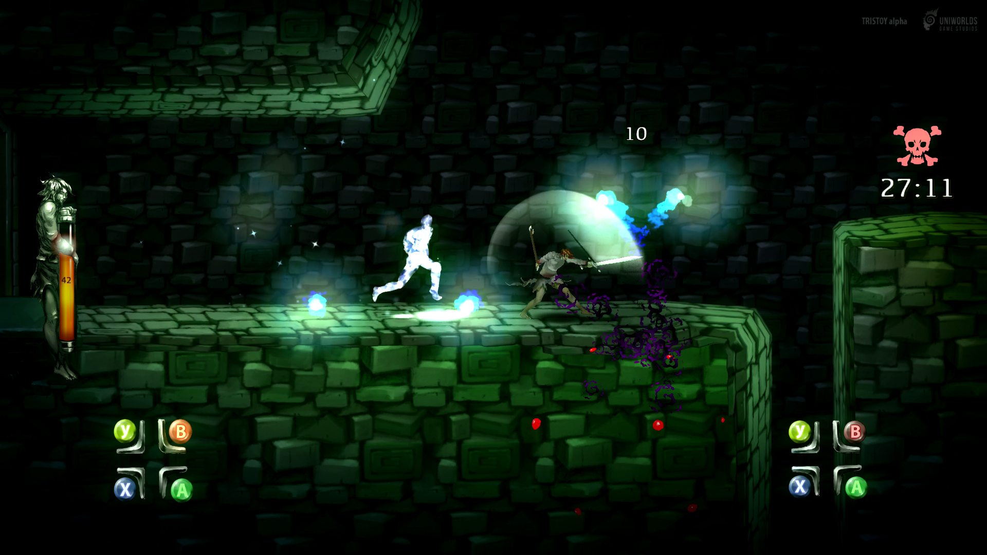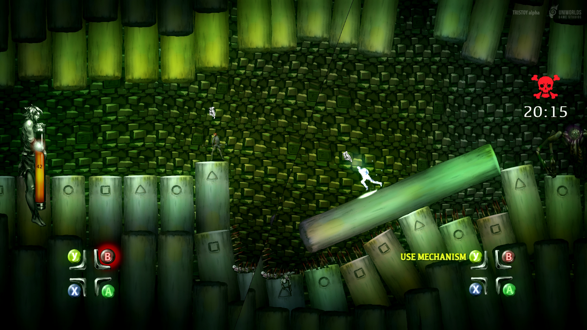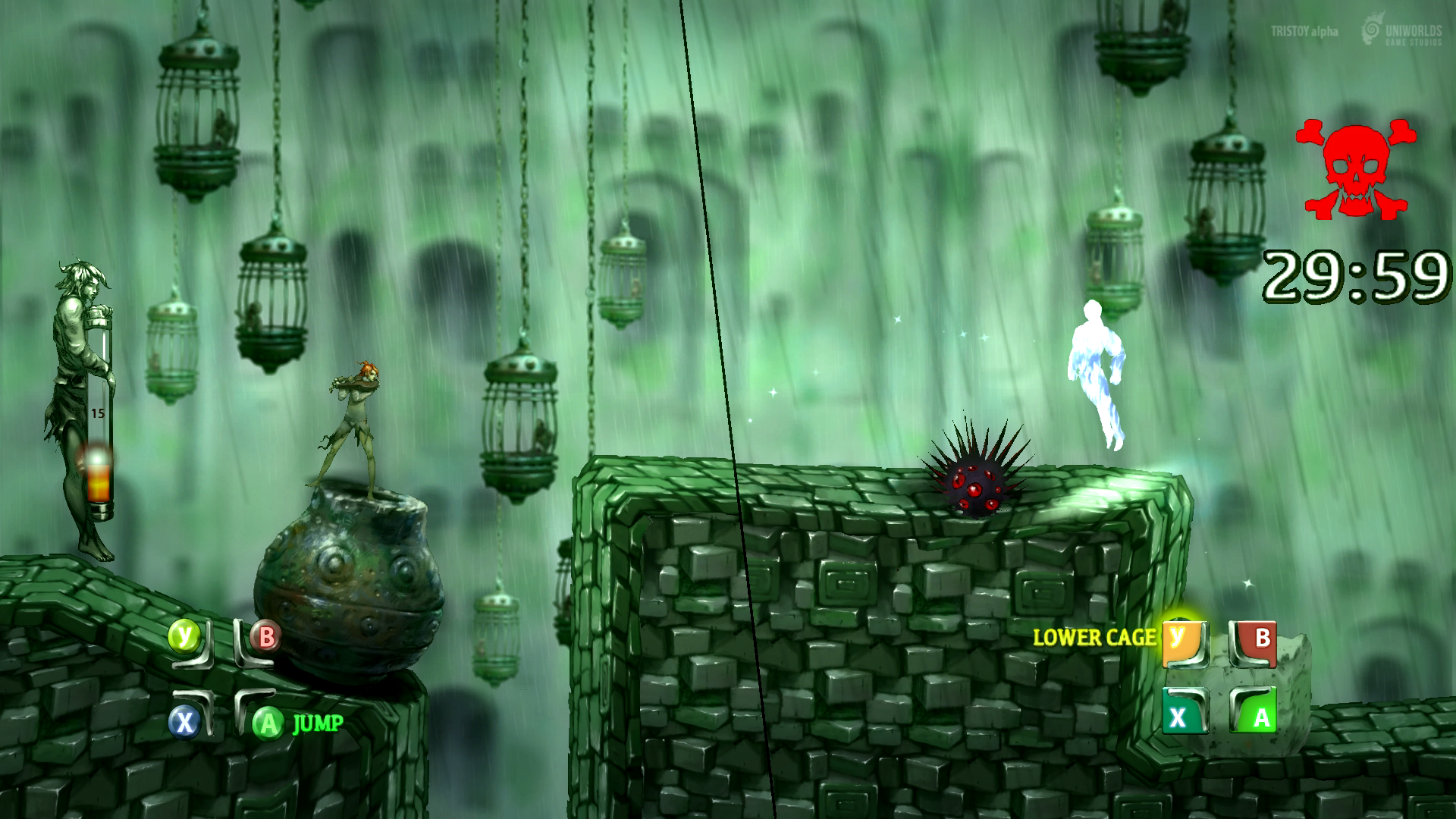 Tristoy ist ein waschechter Koop-Plattformer. Jeder Spieler übernimmt einen Charakter mit besonderen Fähigkeiten und nur in gemeinsamer Interaktion wird man die zahlreichen Level schaffen können. Interessant: Innerhalb des Spiels werden gelegentlich Dialoge mit alternativen Antwortmöglichkeiten eingeblendet. Je nach Entscheidung sollen so mehrere Spielwege eingeschlagen werden können. In der uns gezeigten Demo wurde gerade ein Blondling (dessen Namen wir leider vergessen haben) von einem Geist ( dessen Namen wir ebenfalls verschwitzt haben) gerettet und beide versuchen einer Art Gefängnis zu entfliehen. Dabei nutzt der Geist seine übersinnlichen Fähigkeiten und hilft der verwundeten Dame, die allerdings auf Knopfdruck ordentlich mit ihren scharfen Klingen umher wirbelt. Durchdacht wirkt die Ansicht im Splitscreen, denn die dynamische Sicht visualisiert immer, wo sich euer Mitspieler befindet und wird zu einem Bild, sobald beide nahe beieinander stehen. Freuen wir uns gegen Ende des Jahres auf knifflige Rätsel und spannende Stunden im Koop.