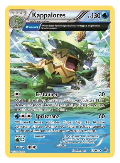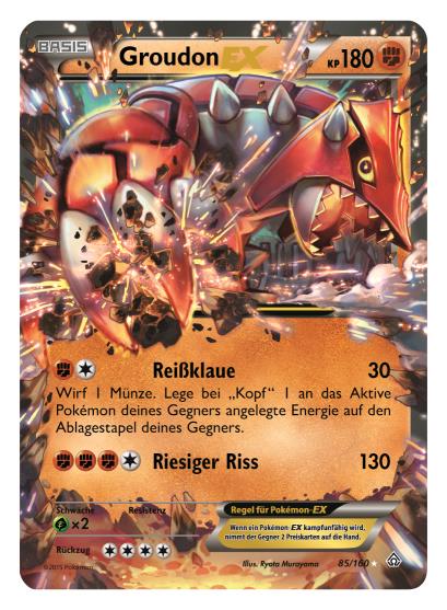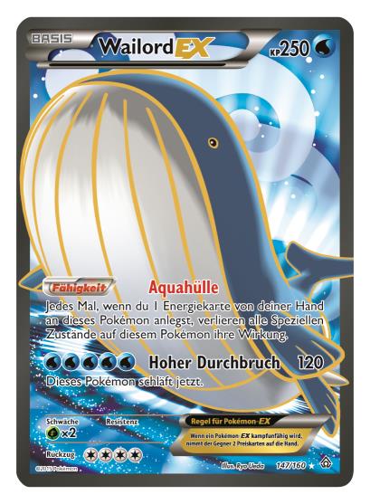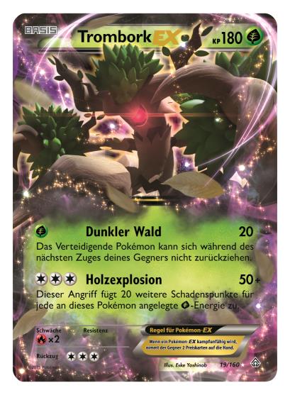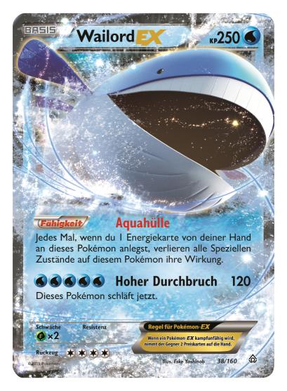 - 12 neue Pokémon-EX-Karten, von denen es auch jeweils eine ultraseltene Version mit überdimensionaler Illustration gibt: Die neuen Pokémon-EX-Karten beinhalten Tohaido-EX, Trombork-EX, Wailord-EX, Camerupt-EX und zwei neue Mega-Entwicklungs-Pokémon, Mega-Stolloss-EX und Mega-Guardevoir-EX.