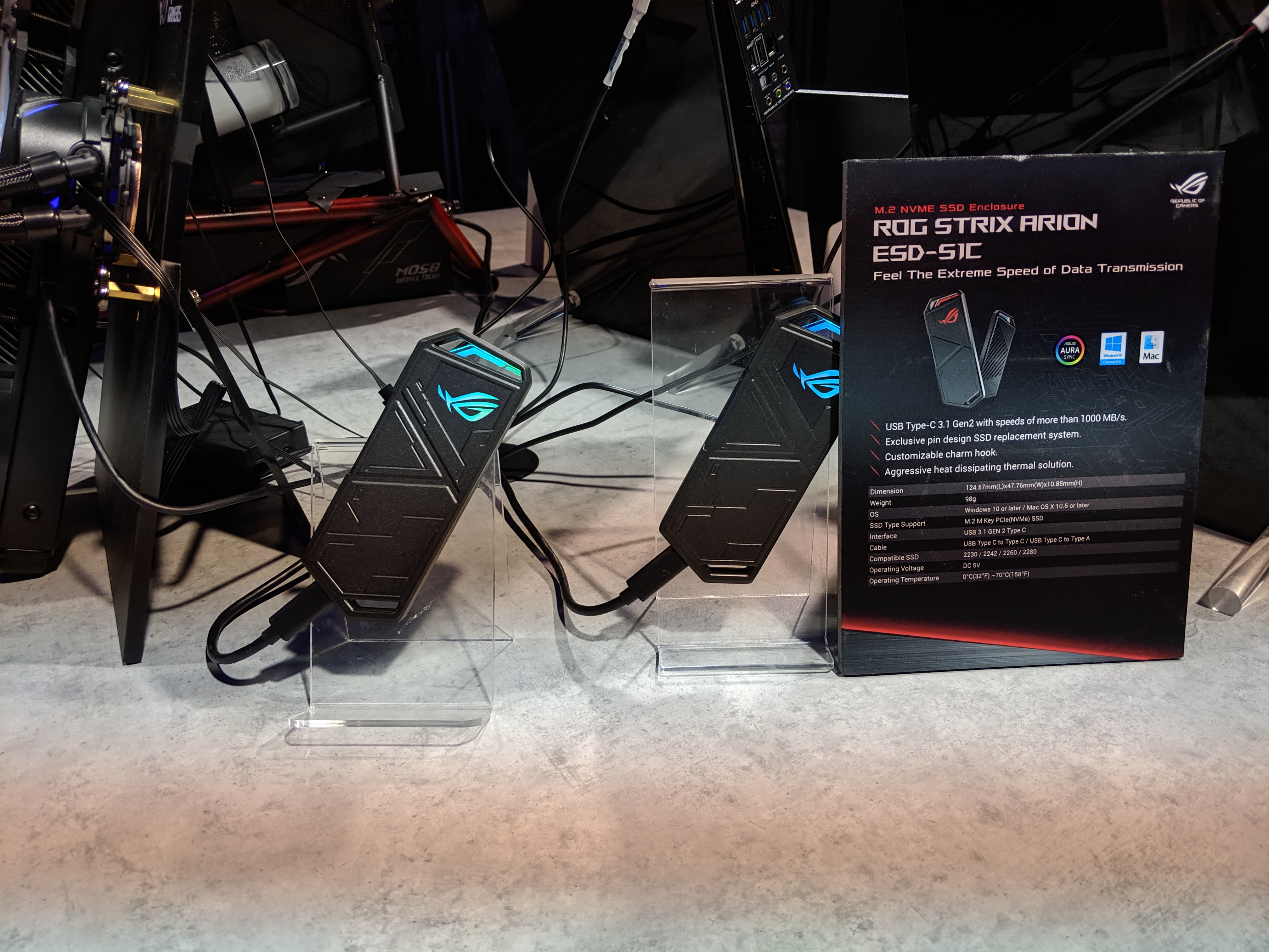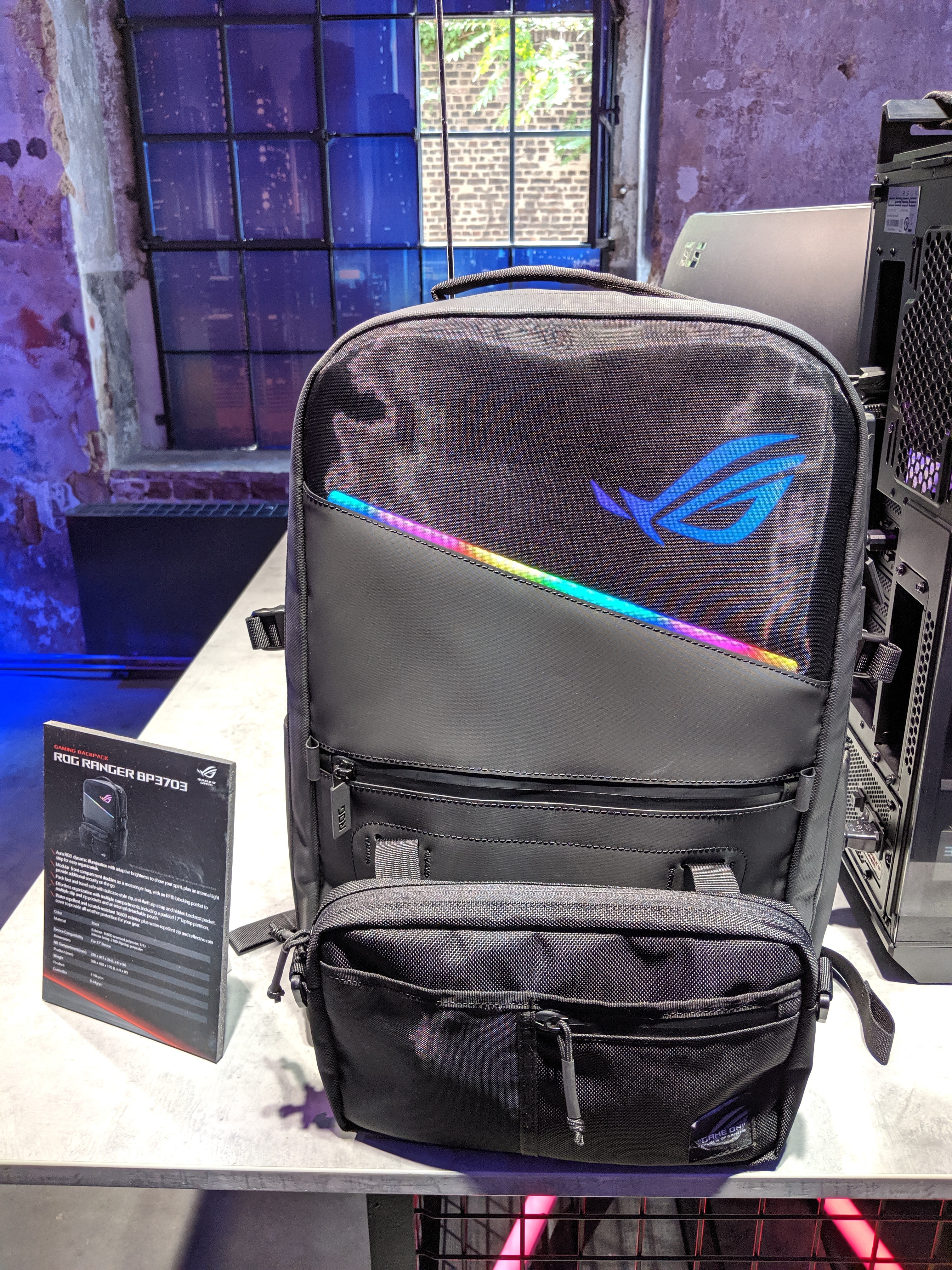 Desweiteren zeigt man uns auch ein Gehäuse für M.2-SSDs für den externen Einsatz als portabler Speicher über USB-C. Natürlich mit Asus Aura RGB. Doch es gab nicht nur Computer-Hardware zu sehen. Asus ROG präsentierte auch seine Wear-Artikel zum Anziehen sowie einen ROG-Rucksack mit RGB-Beleuchtung.