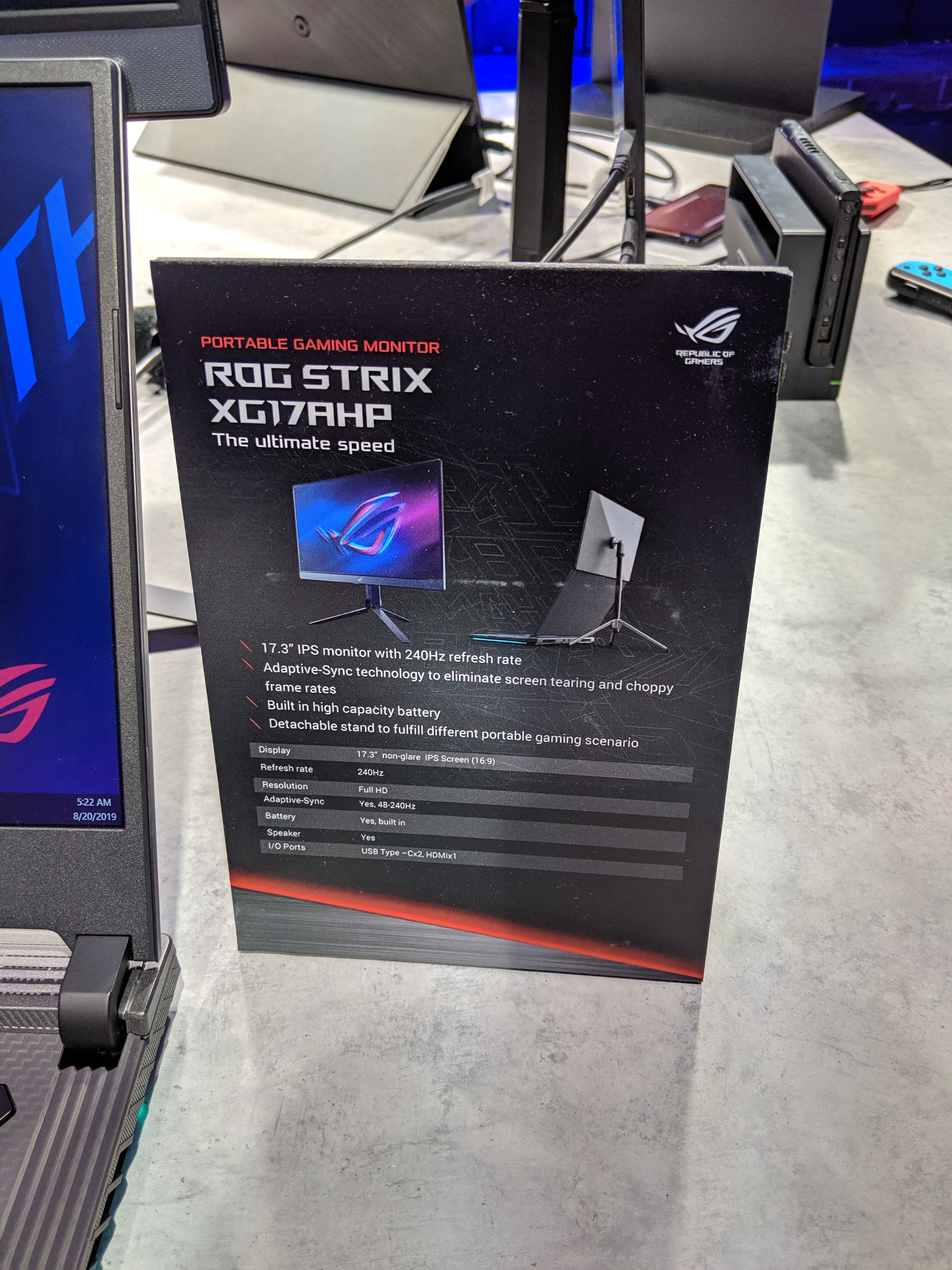 Als kleinsten Monitor mit 17″ und FullHD-Auflösung hatte Asus den ROG Strix XG17AHP als portables Display für unterwegs ausgestellt. Das Display besitzt eine Bildwiederholfrequenz von 240 Hz und wird entweder über USB-C oder HDMI angeschlossen. Darüber hinaus besitzt der Monitor einen Akku, sodass die Bildquelle (Notebook, Computer oder auch Nintendo Switch) das Display nicht zusätzlich mit Strom speisen muss. Der Monitor kommt mit abnehmbaren und einklappbaren Standfuß sowie einem Stand.