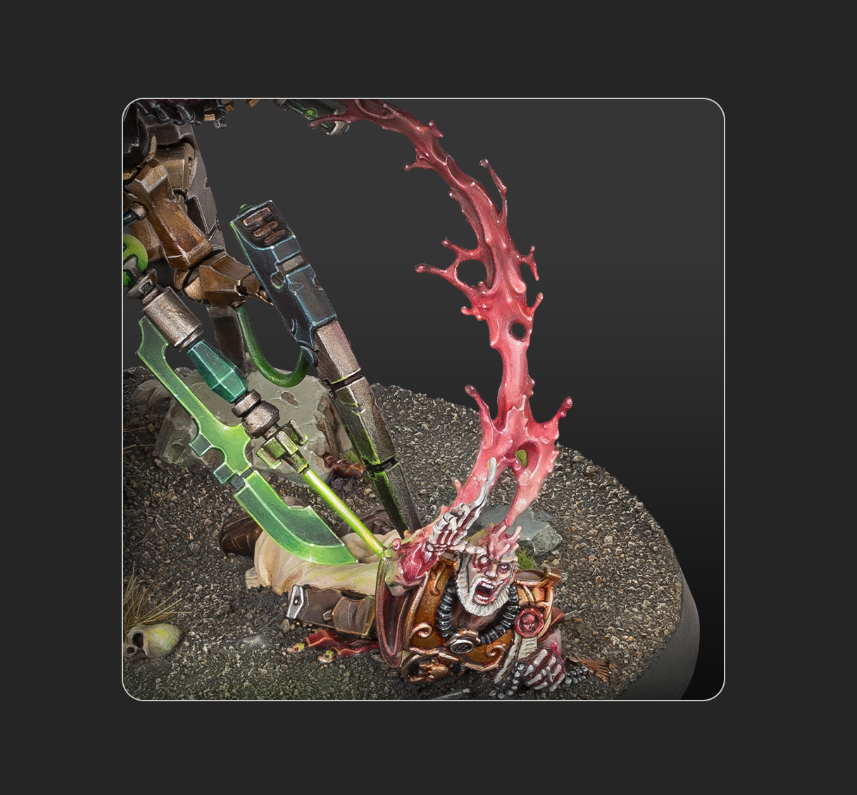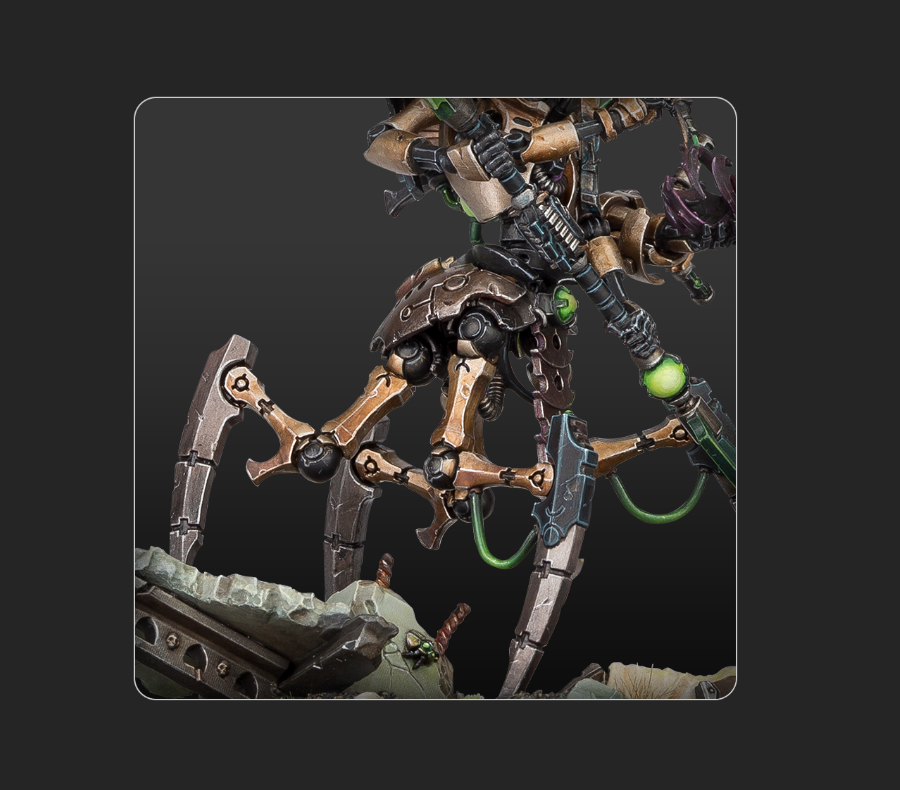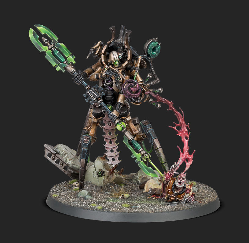 Was für ein Modell! Über die Jahre hinweg hat Games Workshop hier wirklich gute Arbeit geleistet, dass muss man ihnen, an aller negativer Kritik in anderen Bereichen, echt lassen! Die Basegröße allein, aber auch in Kombination mit dem Opfer zu seinen, nun ja, nennen wir sie „Beinen“, lässt auf eine Gesamtgröße im Vergleich zu Guilliman spekulieren. Ein riesiges Model! Aber auch die Menge an Details macht dieses Modell sehr schön. Egal ob es um Extraanbauten an seinen Arbeitshänden geht, zusätzlichen Werkzeugarmen, einer Extrapanzerung, der doppelseitigen Waffen oder wie die Haut seines Opfers verflüssigt und eingesaugt wird. Eine Figur, die Necronspielern wieder Hoffnung geben kann!