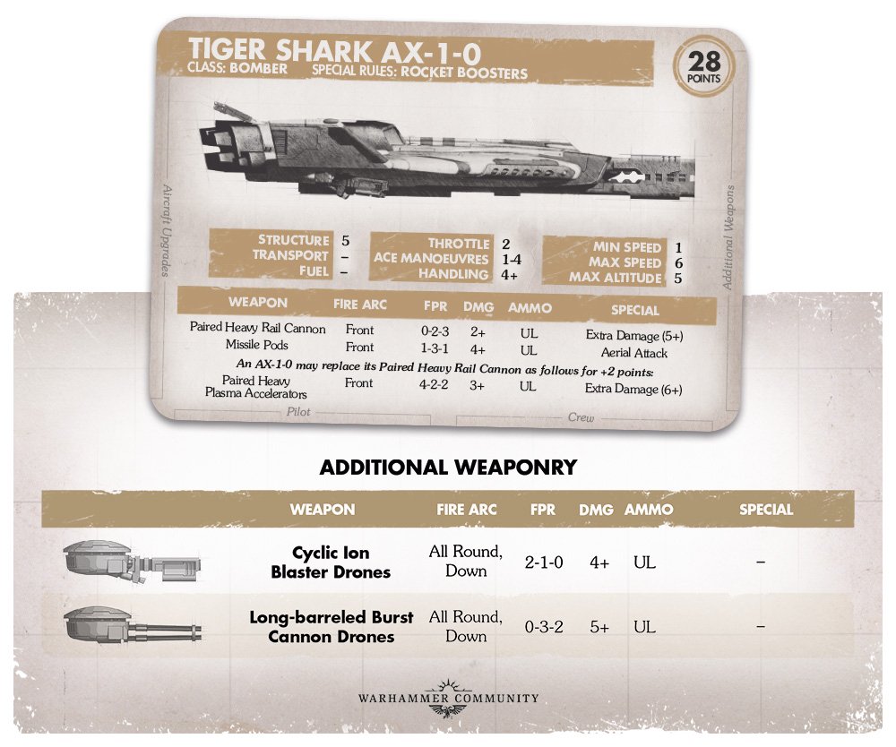 Für das Imperium kommt der Avanger Strike mit einem neuem Datasheet aus den Werften, während die Tau ihren Tiger Shark AX-1-0 vorstellen!