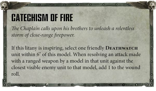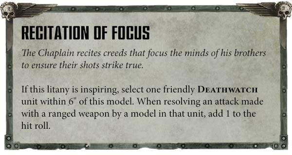 Im übrigen dürften Chaplains vermutlich auch bald einen höheren Stellenwert bekommen, denn ihre neuen Litaneien sind alles andere als unwichtig! Wer hätte nicht gern +1 hit und +1 wound – im Fernkampf!