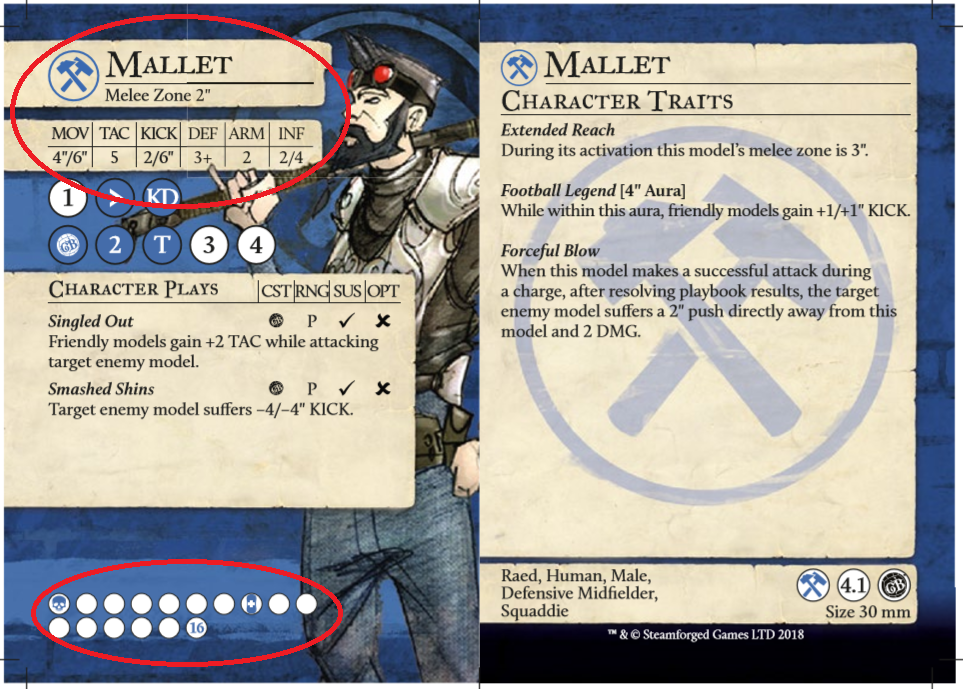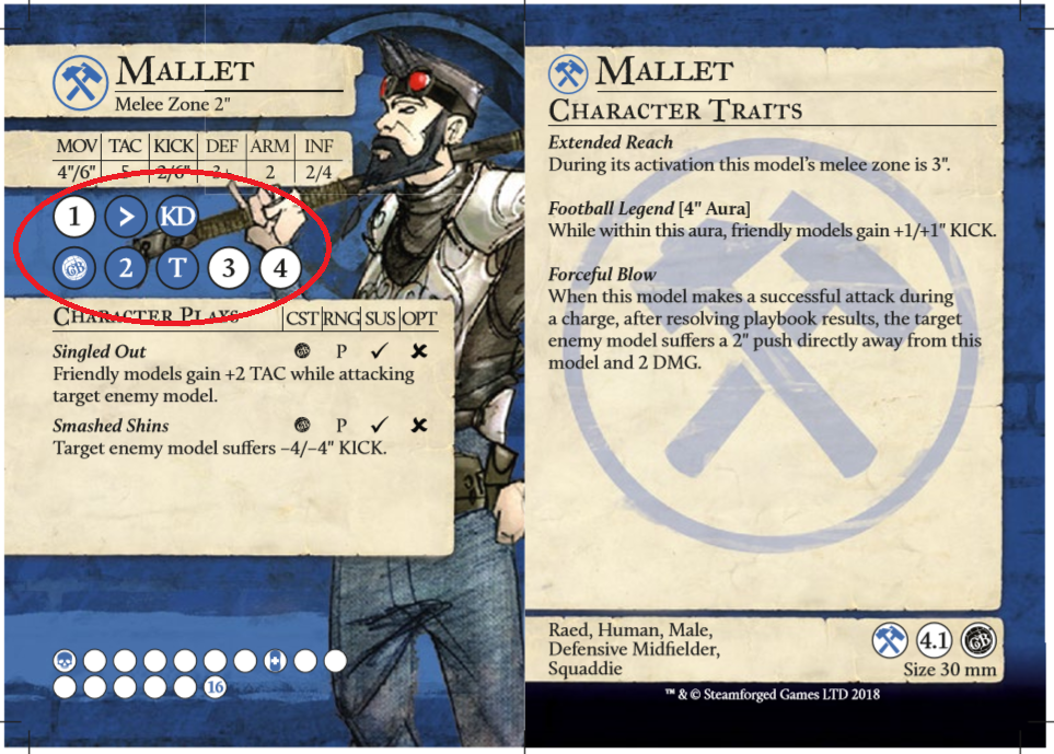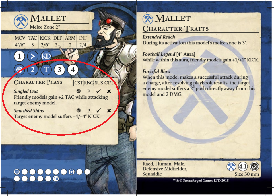 - Würde Mallet einen Gegner angreifen und mit seinen fünf TAC Würfeln drei Erfolge haben, so könnte er in seinem Playbook ein Ergebnis aus den ersten drei Säulen (6 Aktionen) wählen. Dies währen entweder 1 Schaden oder er könnte eines seiner Character Plays (aktive Fähigkeiten) aktivieren / bezahlen (Symbol beachten). Alternativ könnte er auch den Gegner 1″ wegstoßen, 2 Schaden machen, ihm mit einem Tackle (T) den Ball abnehmen oder mit einem Knock down (KD) zu Boden bringen. Gerade letzteres hätte zur Folge, dass der Gegner sich schlechter wehren kann und sein DEF Wert verschlechtert wird.