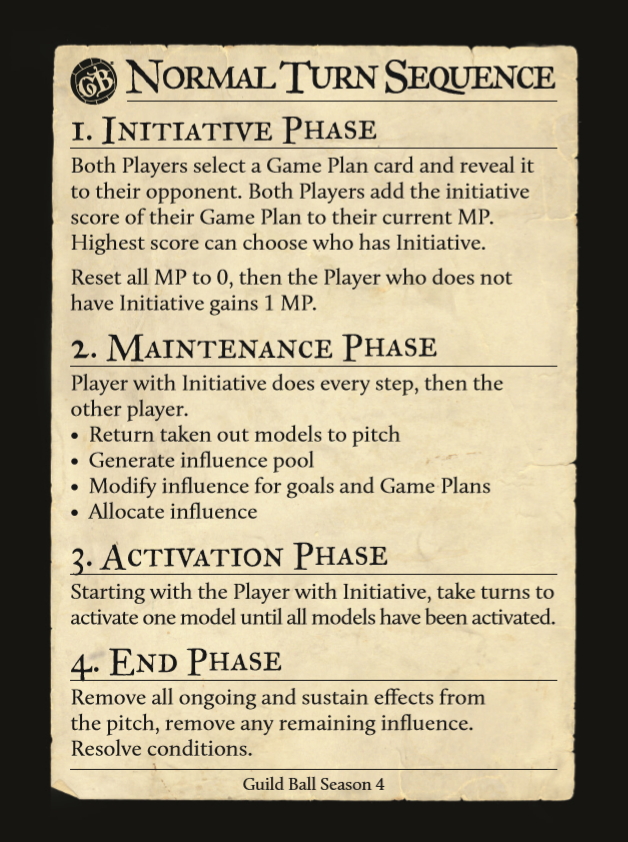 Der Kicker schießt den Ball ins Feld (ähnlich American Football). Dadurch hat der empfangende Spieler automatisch die Initiative für die erste Runde, doch der Kicker-Spieler bekommt einen Momentum Punkt (MP). Von hier an läuft das Spiel in vier Phasen ab, bis es endet.