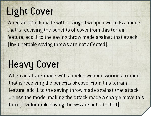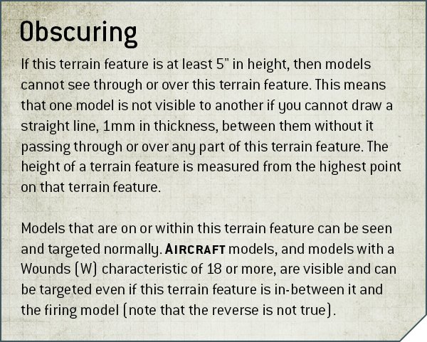 Light Cover gibt euch zum Beispiel den Cover Bonus, wenn ihr mit Fernkampfwaffen beschossen werdet, während Heavy Cover euch einen Bonus gegen Nahkampfwaffen bietet. Obscuring gibt es erst, wenn das Geländestück mindestens 5″ hoch ist. Dann kann man nicht mehr durch dieses hindurchschauen. Ein Fahrzeug dahinter, kann also nicht anvisiert werden, weil man keine direkte Sichtlinie (LOS, Line of Sight), ziehen kann. Flugzeuge und Modelle mit 18 oder mehr Lebenspunkten, sind von dieser Regelung ausgenommen.