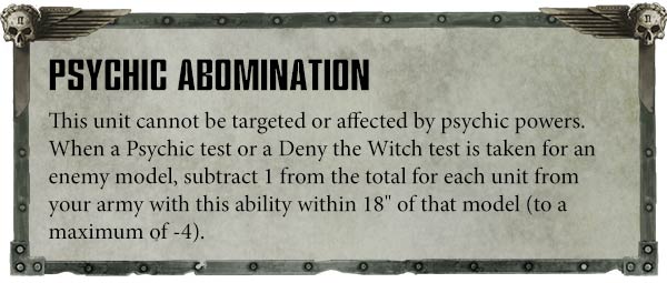 Die Schwestern sind eine (die?) Anti-Psycher Einheit des Imperiums. Ihr könnt sie in jede Imperiumsarmee integrieren und das beste: Ihr zerschießt euch nicht eure Fraktionsboni. Die Schwestern kommen in einem eigenständigem Vanguard Detachment daher (Elite) und benötigt keine HQ Modelle. Und das sie ihren Job verstehen, zeigt sich an ihrem Trait „Psychic Abomination„. Mit -1 pro Modell der Schwestern innerhalb von 18“ um den feindlichen Psyker, wird selbst ein Magnus oder Eldrath Probleme bekommen seine Kräfte zu aktivieren. Reicht euch das noch nicht, dann nehmt doch einfach noch ein Stratagem für 1 CP zur Hand, womit ihr eine Psykraft auf eine 3+ schlichtweg aushebelt. Simpel und effektiv. Das so etwas nur ein menschlicher Psyker kann verstehe ich zwar nicht ganz, aber vermutlich sind Tyraniden oder Asuryani einfach keine „echten“ Psyker, wie diese…