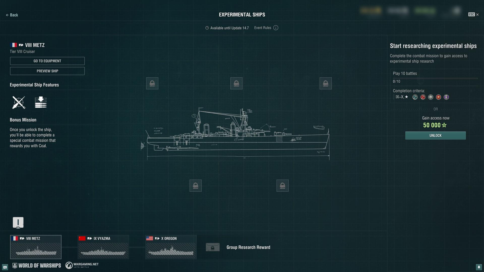 Ab dem 5. März haben die Spielenden die Möglichkeit, drei neue experimentelle Schiffe zu testen: den französischen schweren Kreuzer Metz (Stufe VIII), den sowjetischen Kreuzer Vyazma (Stufe IX) und das amerikanische Schlachtschiff Oregon (Stufe X). Diese Schiffe sind für erfahrene Spielende konzipiert und starten die Schlacht mit einem Teil ihrer Trefferpunkte, die sich im Verlauf des Kampfes langsam regenerieren. Wer besonders mutig ist, kann eine spezielle Missionskette annehmen, um sich Kohle zu verdienen.