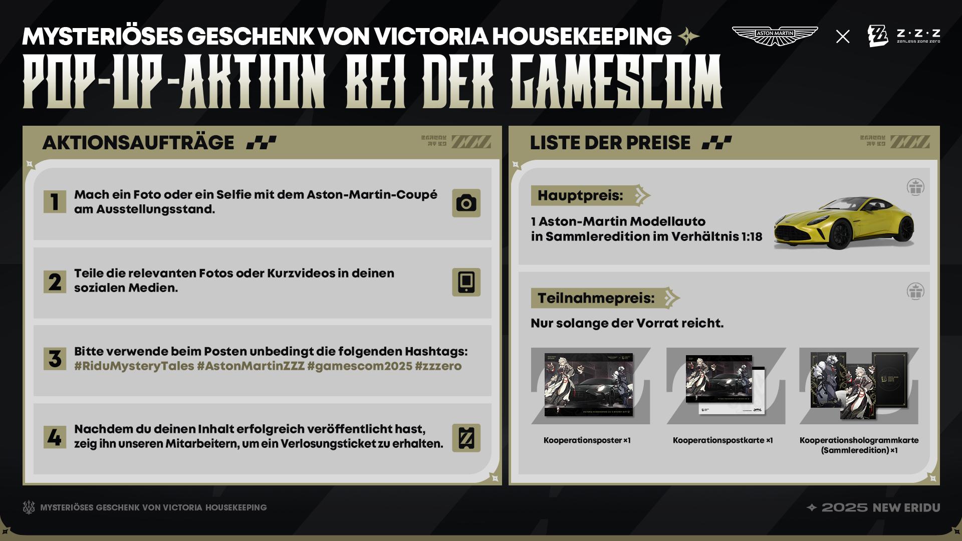 Besucher des Zenless Zone Zero-Stands können an besonderen Aufgaben teilnehmen und exklusive Preise gewinnen, darunter als Hauptpreis ein 1:18‑Modell des Aston Martin Vantage. Solange der Vorrat reicht, gibt es für alle Teilnehmer Kooperationsposter, Postkarten oder eine seltene Hologrammkarte (Sammleredition).