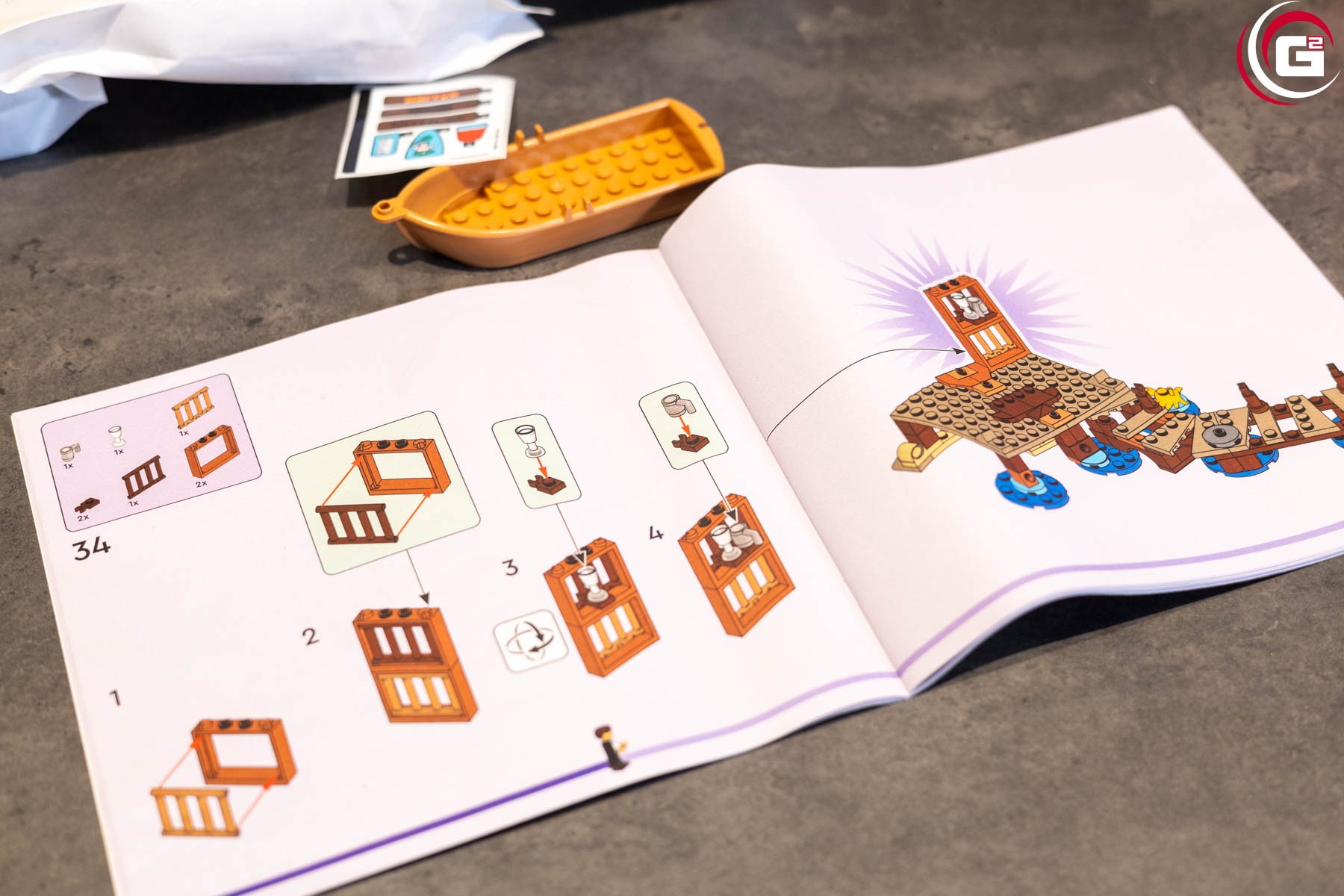 In der Verpackung findet sich die gedruckte Bauanleitung, ein kleiner Stickerbogen, das Boot und drei Papiertüten (1-3) mit den LEGO-Steinen. Bereits vor ein paar Monaten ist LEGO auf die Verwendung von Papiertüten statt der sonst üblichen Folienbeutel für die Baugruppen umgestiegen. So wird bei der Verpackung auf Einwegplastik verzichtet.