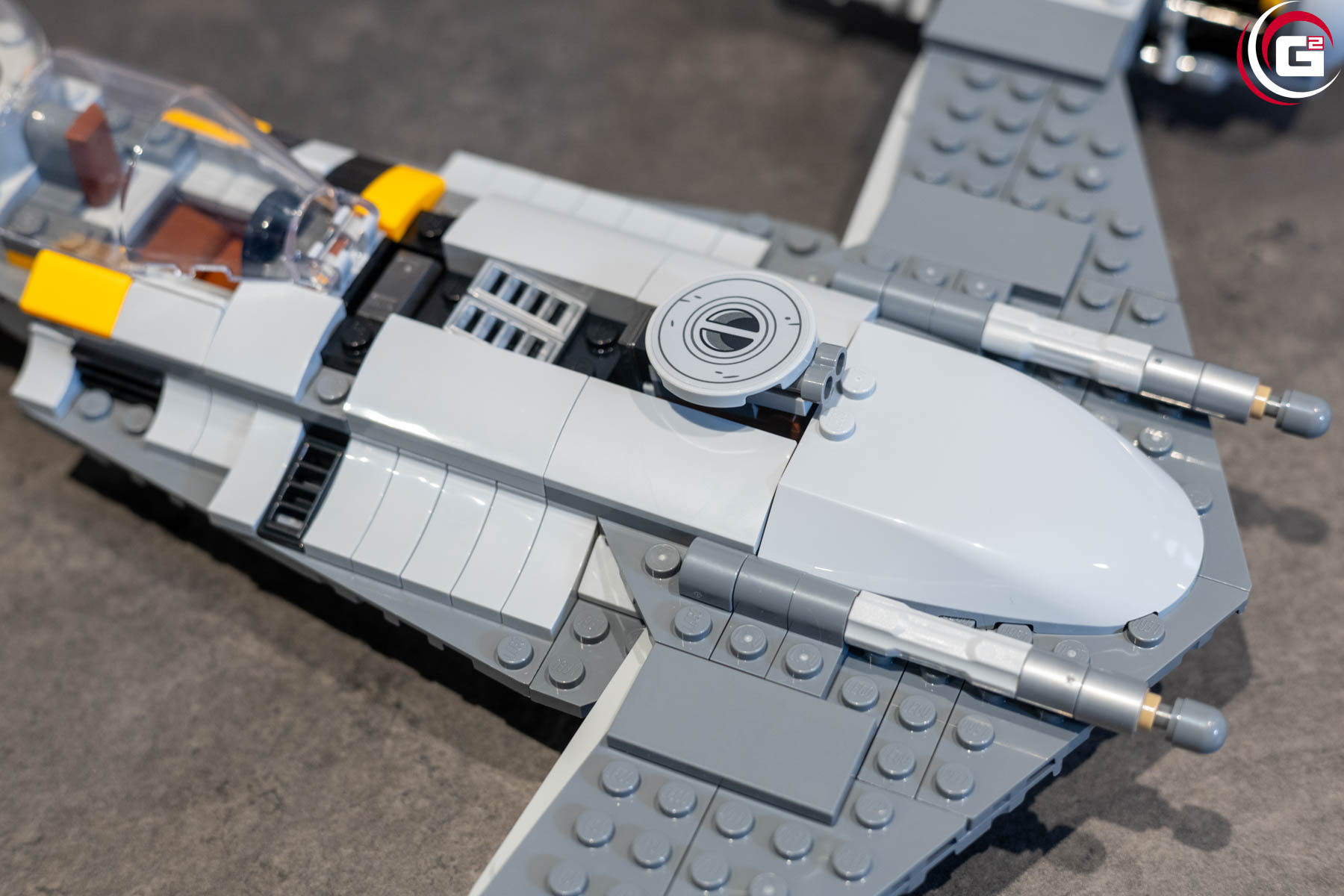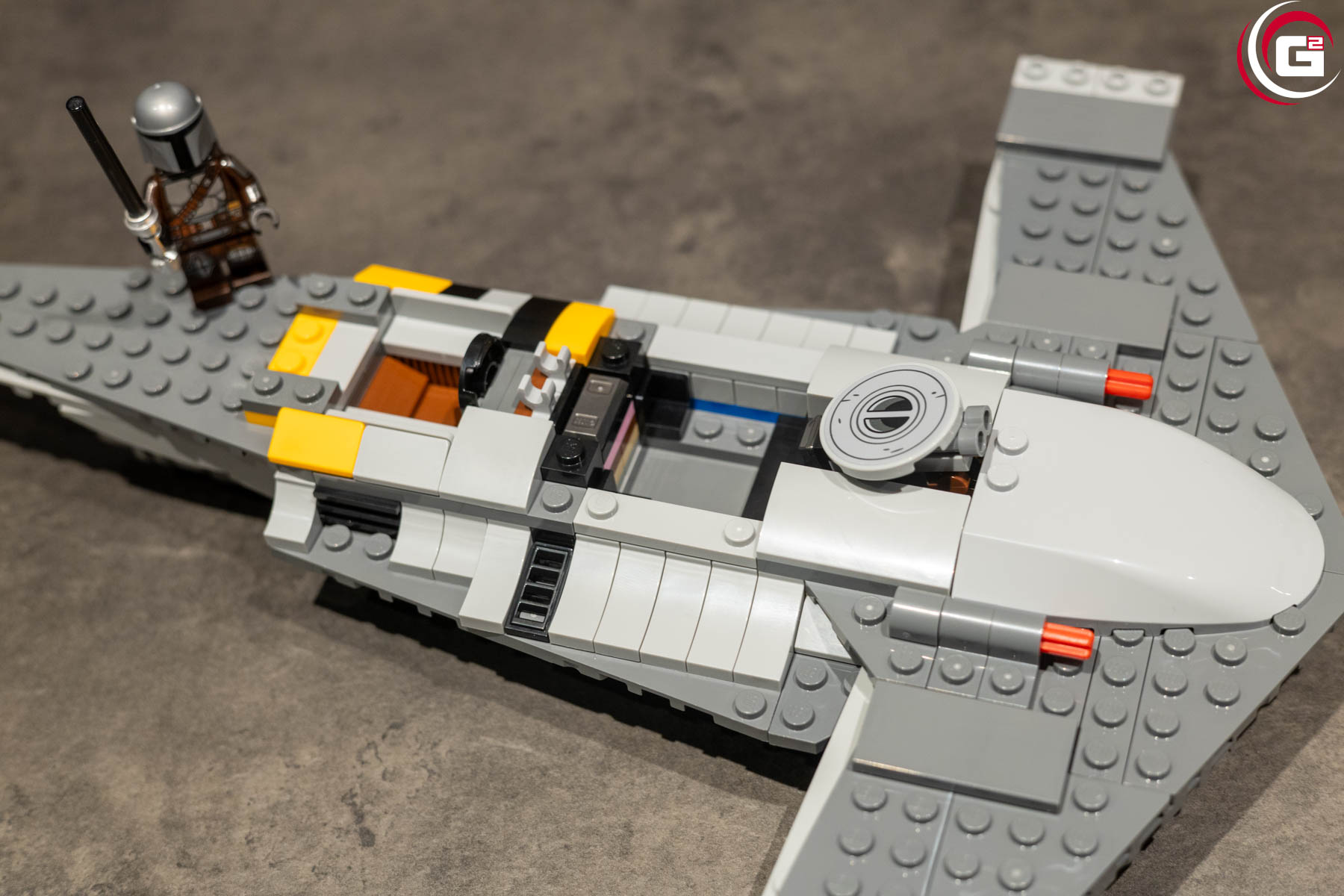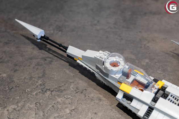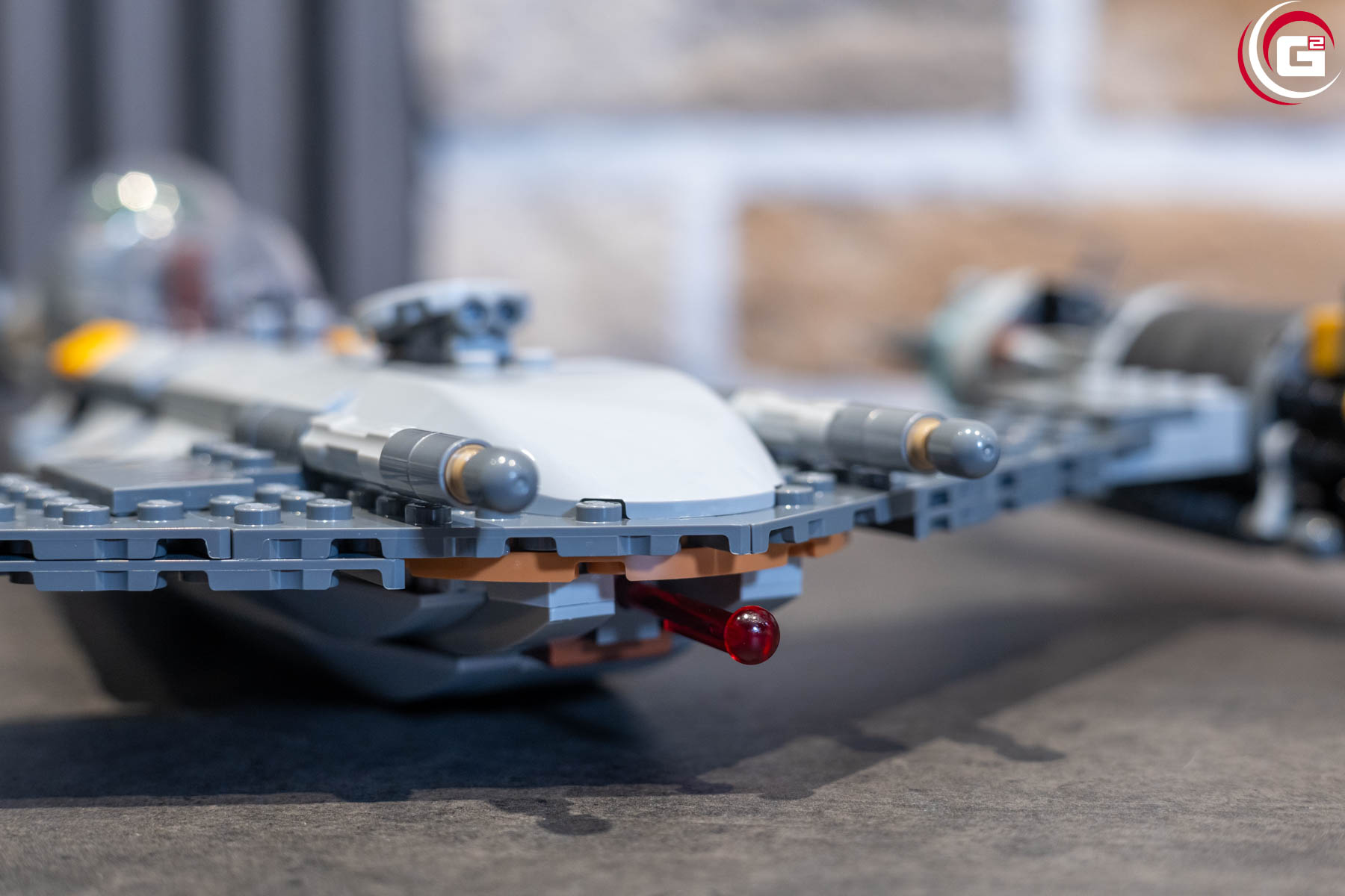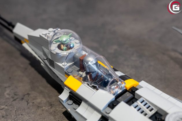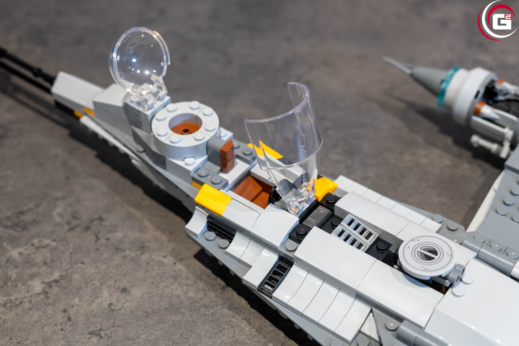 Auch das Set LEGO Star Wars 75325 – Der N-1 Starfighter des Mandalorianers verfügt wieder über einige interaktive Details. So lassen sich die beiden Cockpits öffnen und schließen, sodass Mando und Grogu im Fighter Platz nehmen können. Das Raketenpack von Mando kann man in einem versteckten Laderaum verstauen. Ein tolles Feature ist auch der Shooter mit Federmechanismus. Die „Laserprojektile“ steckt man dort einfach ein und dann kann man auf der Oberseite drücken und die Projektile werden abgeschossen. Die Kraft ist überraschend groß und man kann problemlos zwei Meter weit schießen. Hier sollte man tatsächlich aus nächster Nähe mit den Augen vorsichtig sein.