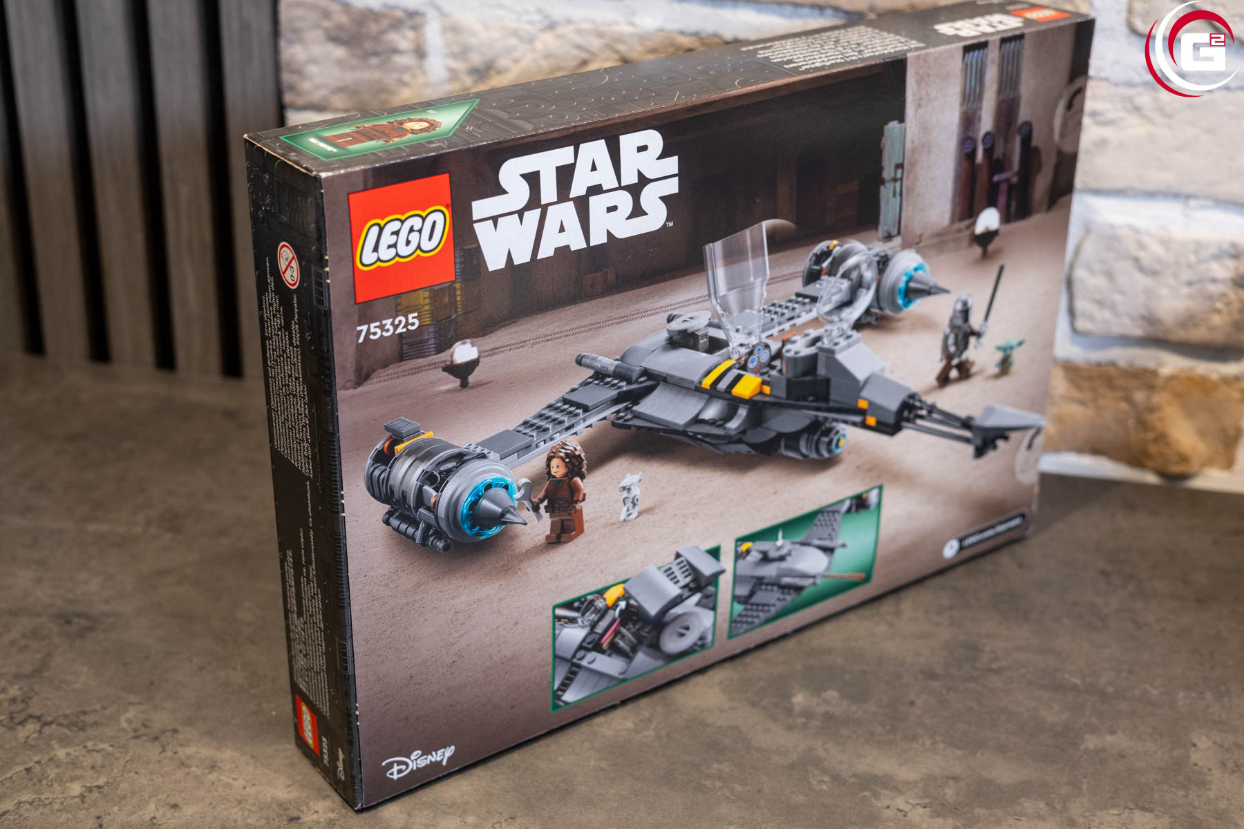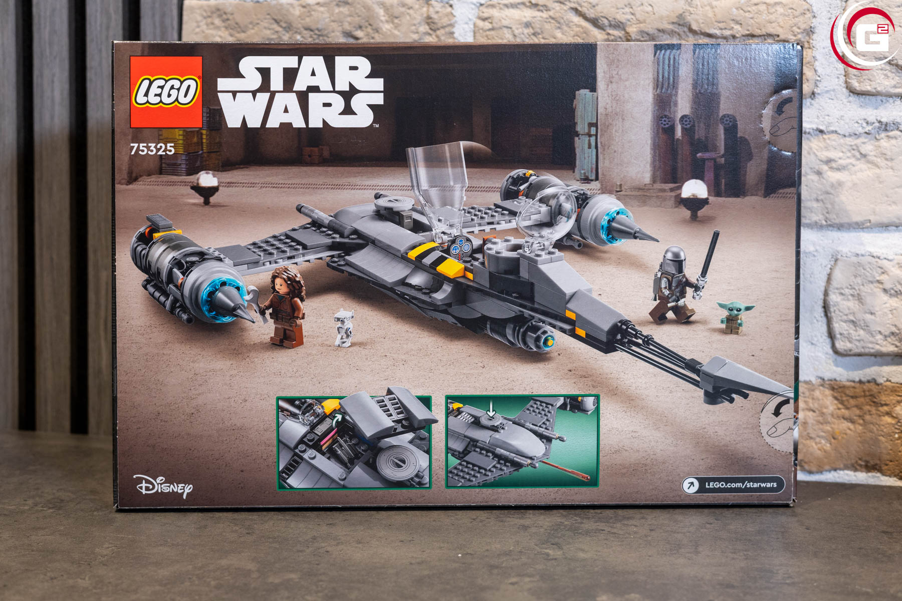 Das Set LEGO Star Wars 75325 – Der N-1 Starfighter des Mandalorianers kommt in einer Umverpackung im charakteristischen LEGO-Star-Wars-Design. Auf der Vorderseite wird eine Action-Darstellung des aufgebauten LEGO-Modells, das mit einem passenden Hintergrund in Szene gesetzt wurde, gezeigt. Auf der Rückseite findet sich eine Darstellung des geöffneten Modells gepaart mit Detailaufnahmen, die den Shooter und den versteckten Laderaum zeigen.