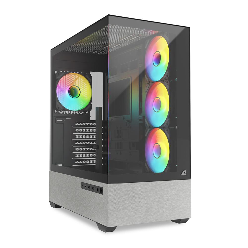 Das MK7 ARGB setzt auf das gleiche Design, nur in einer kompakteren Ausführung. Die Front aus gehärtetem Glas bringt deine Hardware wirkungsvoll zur Geltung, während der Stoffeinsatz an der Unterseite auch hier dem Gehäuse einen modernen, hochwertigen Charakter verleiht. Trotz seines platzsparenden Formats ist für eine starke Kühlung gesorgt: Drei bereits verbaute 120-mm-ARGB-PWM-Lüfter, zwei davon saugen Frischluft seitlich ins Innere, schaffen eine effiziente Luftzirkulation. Insgesamt können bis zu acht Lüfter untergebracht werden, sodass auch bei leistungsstarker Ausstattung ein stabiler Airflow gewährleistet bleibt.