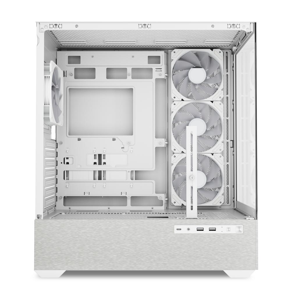 Die moderne Anschlussvielfalt umfasst USB-C- und TRRS-Ports, während die integrierte RGB-Steuerung den Betrieb von bis zu vier LED-Elementen und vier PWM-Lüftern ermöglicht. Für leistungsstarke Hardware ist reichlich Platz vorhanden: Grafikkarten dürfen bis zu 41 cm lang sein und werden durch einen gummierten Halter zusätzlich stabilisiert, CPU-Kühler können eine Höhe von bis zu 17 cm erreichen und Netzteile eine Länge von bis zu 23,5 cm. Außerdem finden bis zu zwei 3,5″-HDDs oder vier 2,5″-SSDs im Gehäuse Platz.