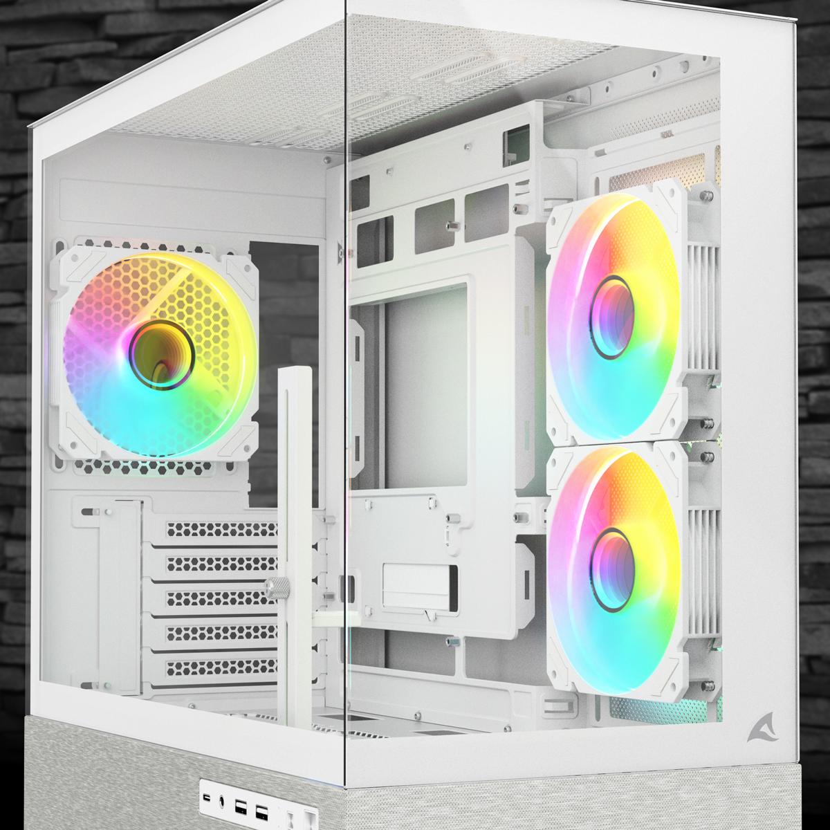 Das AK7 ARGB kombiniert eine elegante Glasfront mit einem stilvollen Stoffüberzug an der Unterseite und verleiht deiner Gaming-Hardware so eine besonders edle Note. Vier vorinstallierte 120-mm-ARGB-PWM-Lüfter, von denen drei invertiert arbeiten und Frischluft seitlich ins Gehäuse ziehen, sorgen bereits ab Werk für einen optimalen Airflow. Insgesamt lassen sich bis zu neun Lüfter verbauen, sodass auch bei leistungsstarker Hardware jederzeit eine effiziente Kühlung gewährleistet ist.