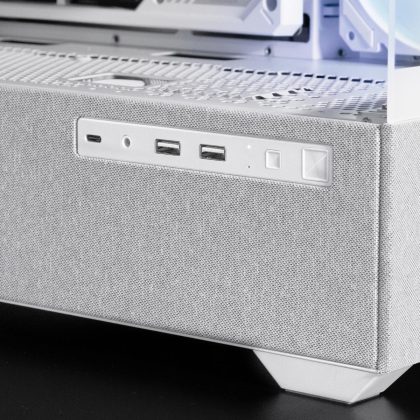 Die Anschlussmöglichkeiten sind hier ebenso zeitgemäß und vielseitig. Mit USB-C- und TRRS-Ports sowie einer integrierten RGB-Steuerung, die bis zu vier LED-Elemente und vier PWM-Lüfter anbindet, ist das Gehäuse technisch auf dem neuesten Stand. Trotz seiner kompakten Maße bietet es reichlich Platz für leistungsstarke Komponenten: Grafikkarten dürfen bis zu 41 cm lang sein und werden durch einen gummierten Halter stabilisiert, CPU-Kühler können bis zu 17 cm hoch und Netzteile bis zu 23,5 cm lang sein. Für Datenträger stehen zwei Schächte für 3,5″-HDDs oder drei für 2,5″-SSDs zur Verfügung.