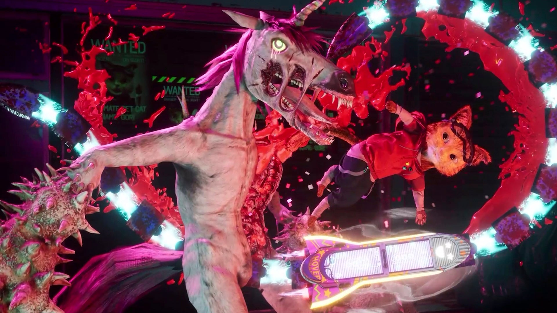 In einer Welt, in der die Menschheit ausgelöscht wurde, spielen wir die Katze Gori, die mithilfe des intelligenten Hoverboards F.R.A.N.K. und dem mürrischen KI Begleiter CH1-P zusammen die Welt vor der bösen Armee schützen muss. Die böse Armee besteht aus lebendigen Spielzeugen, wie Einhörnern oder Ähnlichem, die man mit Kombos oder brutalen Finishern zerhackstückeln muss.