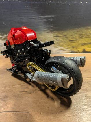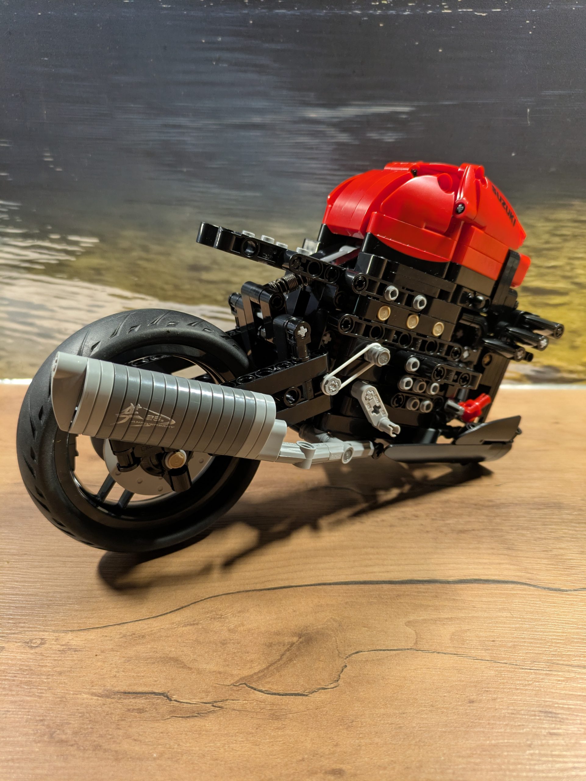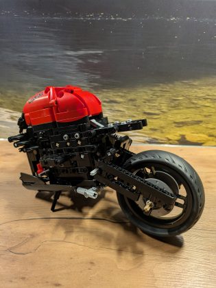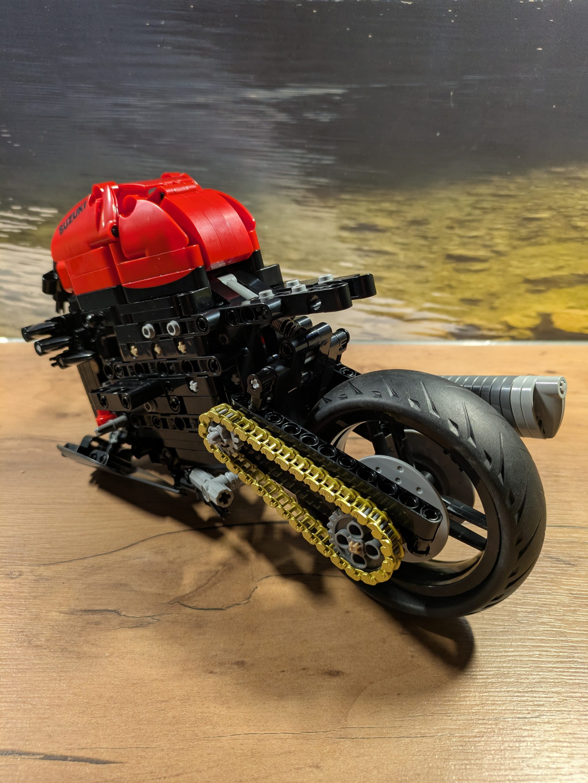 Technisch überzeugt das Set mit einem funktionsfähigen 3-Gang-Schaltgetriebe, einer beweglichen Vierzylinder-Simulation, funktionaler Lenkung und einer arbeitenden Federung vorne und hinten. Der goldene Antrieb der Kette ist nicht nur optisch ein Hingucker, sondern vermittelt auch beim Drehen des Hinterrads ein realistisches Gefühl von Kraftübertragung. Ein kleines Manko sind die Vordergabeln, die beim Drücken etwas Spiel haben und leicht wackeln, funktional, aber nicht ganz so präzise wie beim Original. Ebenso wäre eine abnehmbare Tankverkleidung schön gewesen, um den Motor noch besser präsentieren zu können.