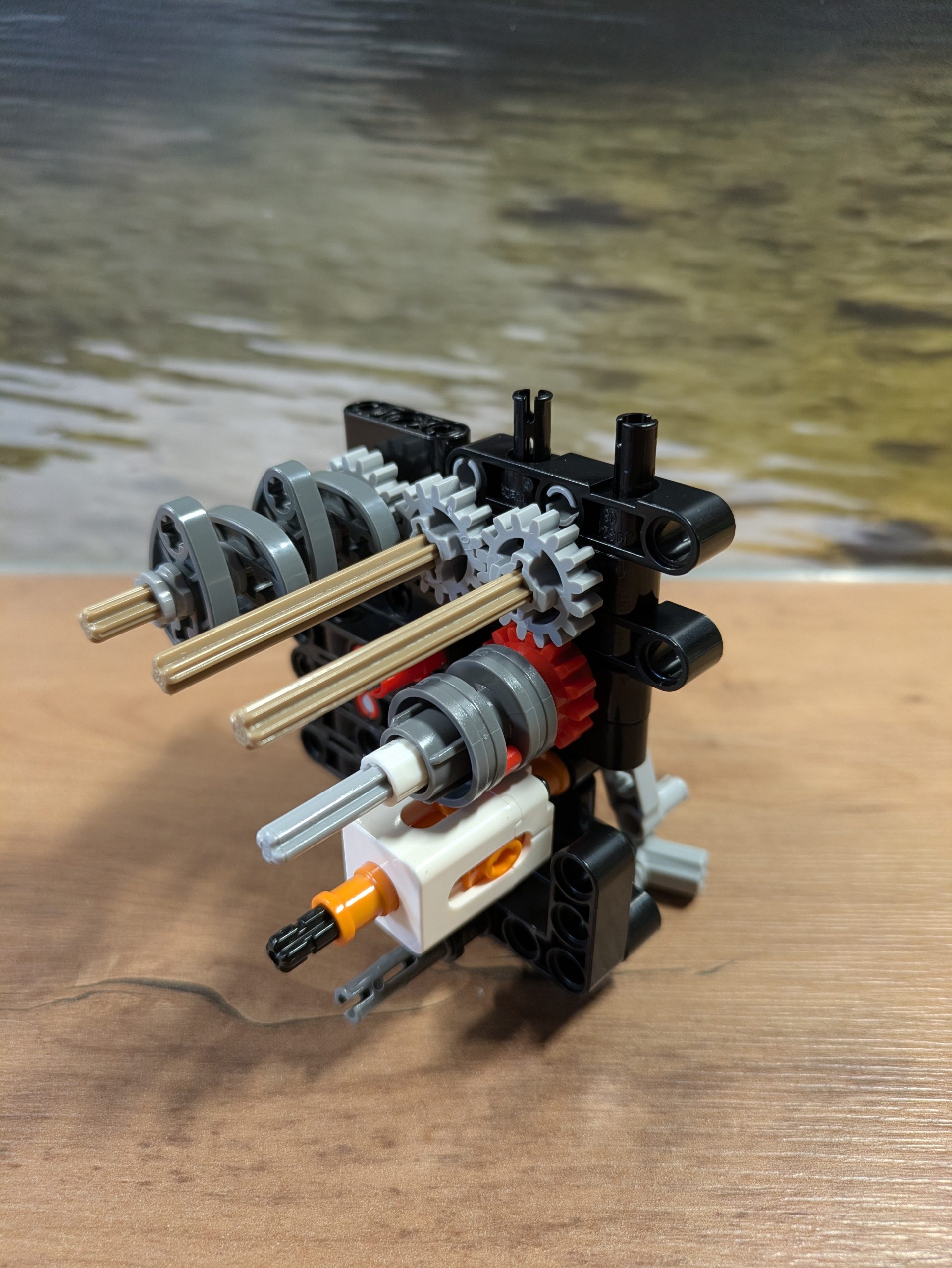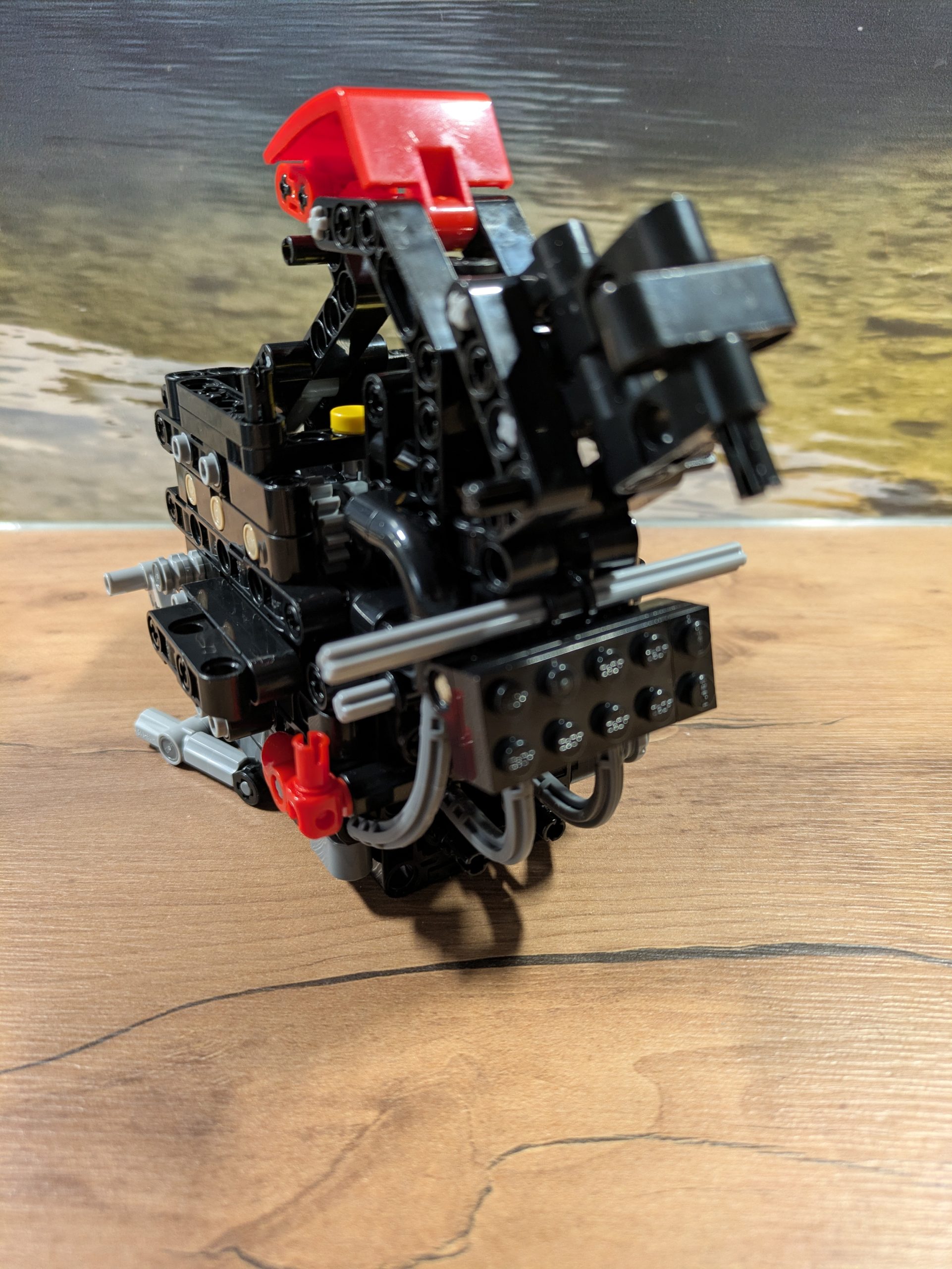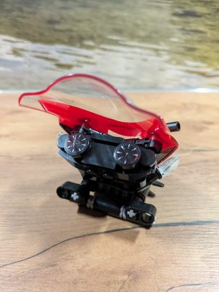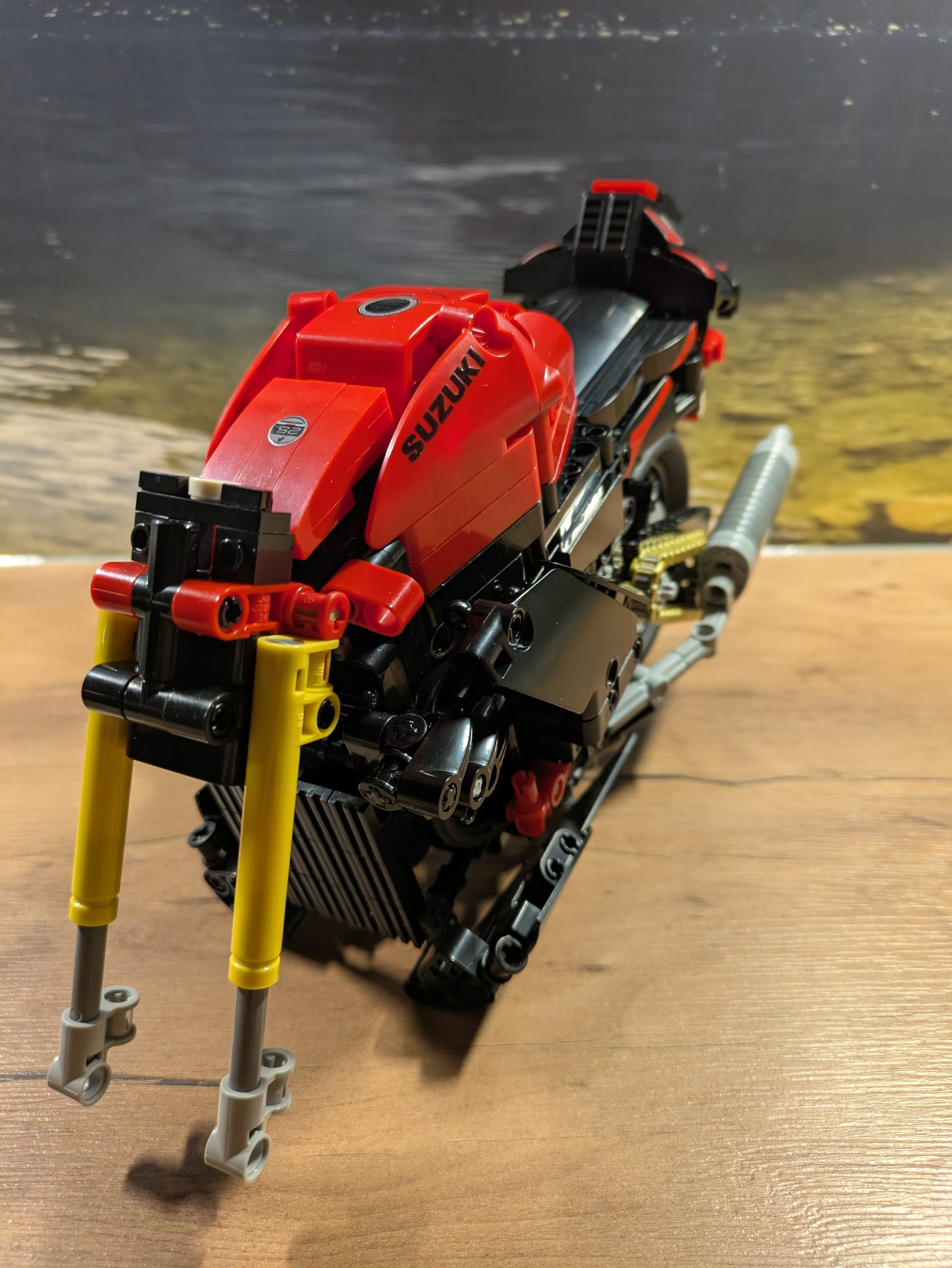 Technisch überzeugt das Set mit einem funktionsfähigen 3-Gang-Schaltgetriebe, einer beweglichen Vierzylinder-Simulation, funktionaler Lenkung und einer arbeitenden Federung vorne und hinten. Der goldene Antrieb der Kette ist nicht nur optisch ein Hingucker, sondern vermittelt auch beim Drehen des Hinterrads ein realistisches Gefühl von Kraftübertragung. Ein kleines Manko sind die Vordergabeln, die beim Drücken etwas Spiel haben und leicht wackeln, funktional, aber nicht ganz so präzise wie beim Original. Ebenso wäre eine abnehmbare Tankverkleidung schön gewesen, um den Motor noch besser präsentieren zu können.