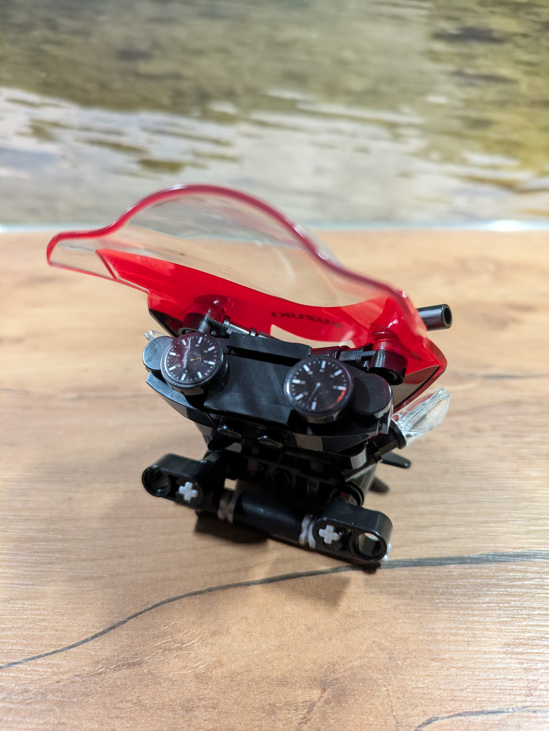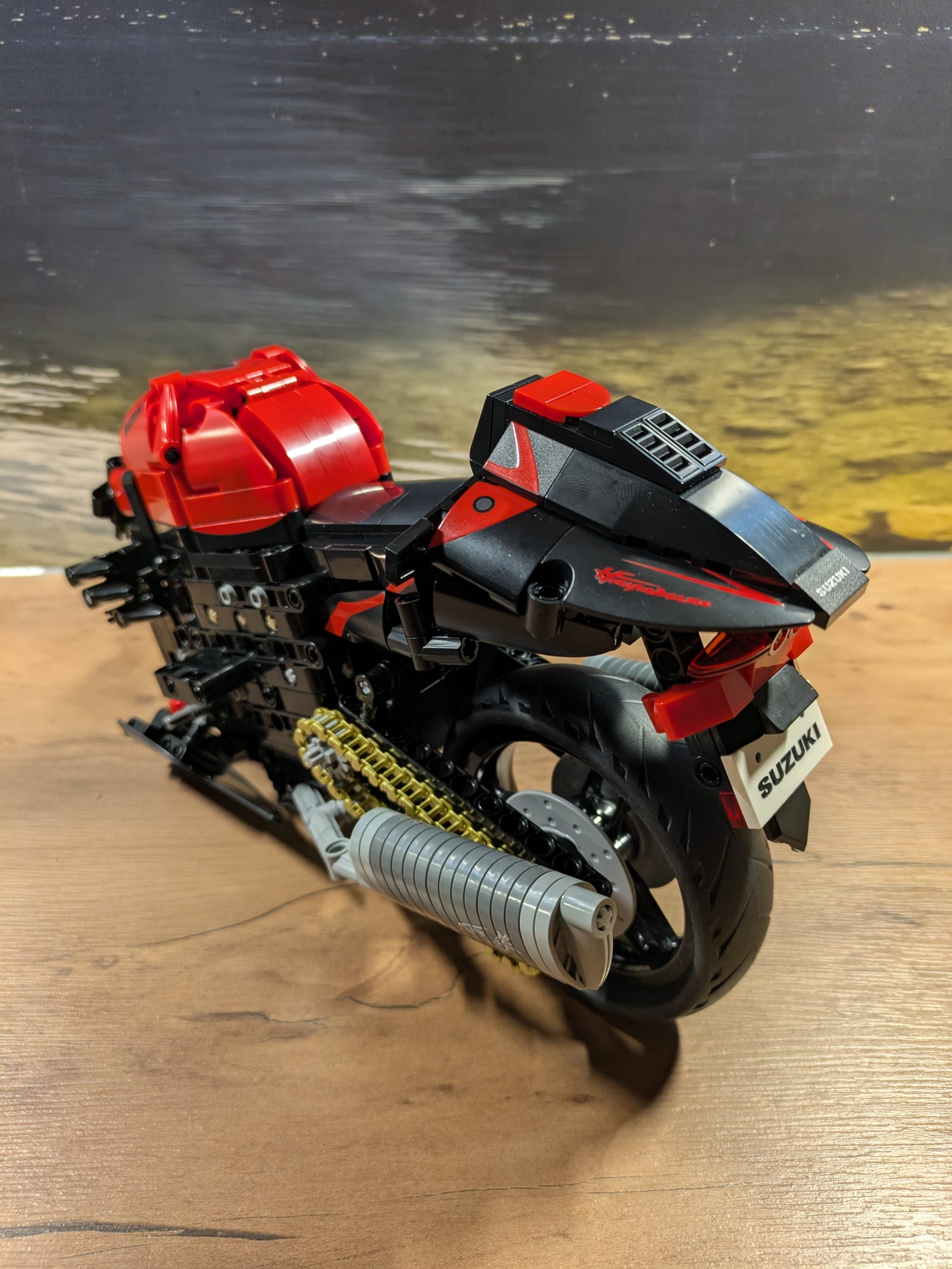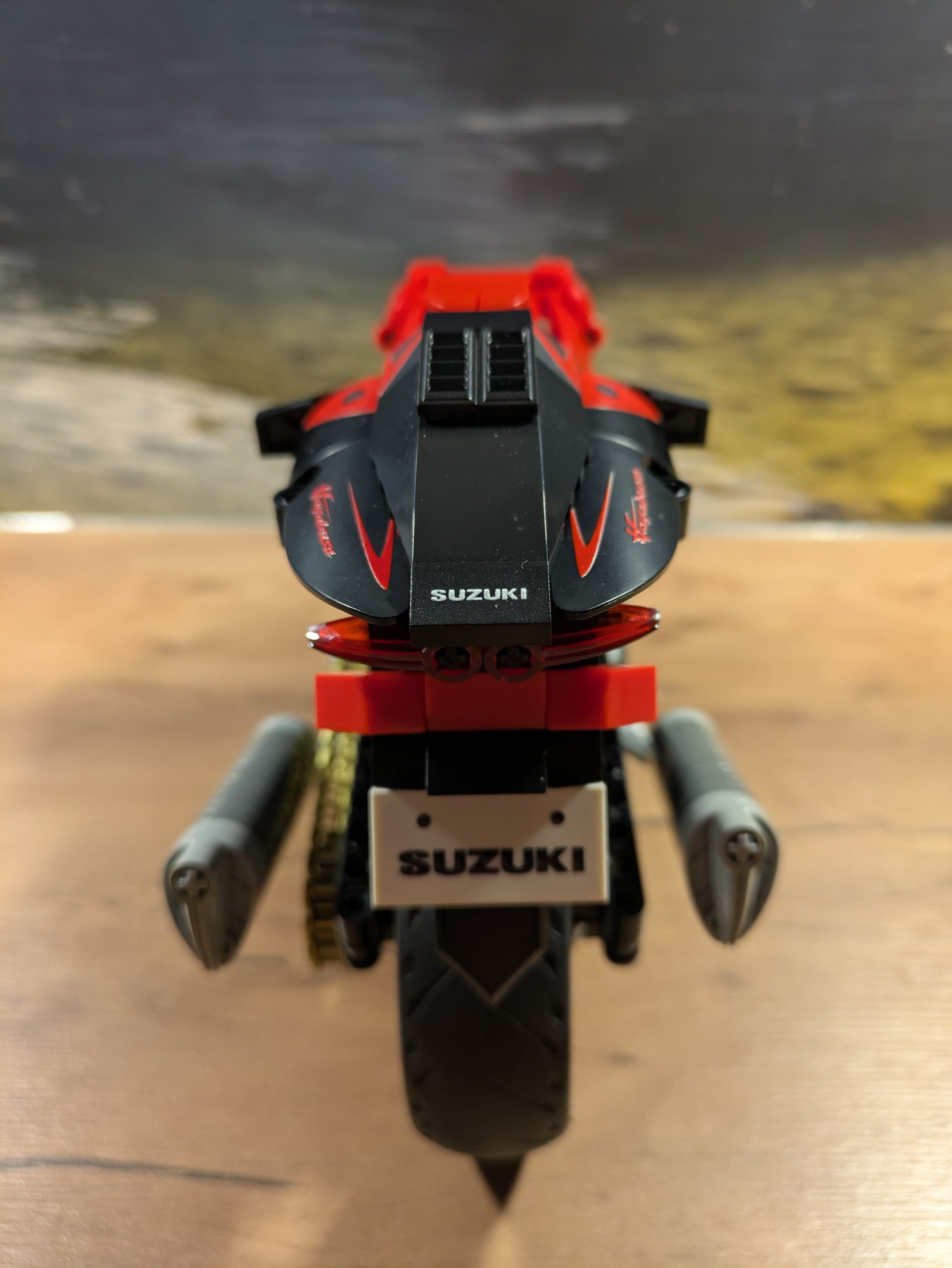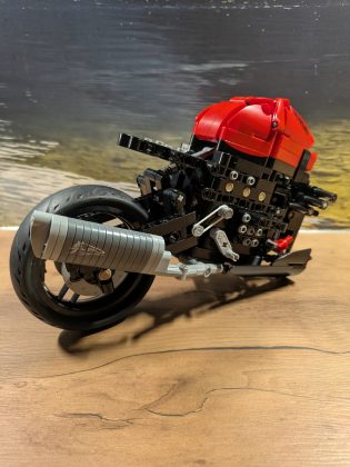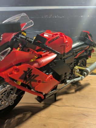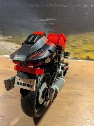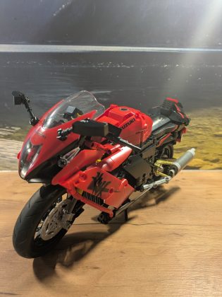 Die Hayabusa ist in der realen Welt bekannt für ihre fließenden Linien und aggressiv geschwungene Verkleidung und genau das gelingt CaDA hier auf beeindruckende Weise. Die Formgebung der Verkleidungselemente ist organisch und elegant, ohne an Stabilität zu verlieren. Der Kern des Modells ist extrem solide konstruiert; jedes Teil greift ineinander, wodurch kaum etwas wackelt oder nachgibt. Das Modell basiert auf der 25th Anniversary Edition der echten Hayabusa, die in „Glass Blaze Orange“ und „Glass Sparkle Black“ lackiert ist. Leider hat CaDA sich für ein klassisches Rot entschieden, optisch stark, aber eben nicht ganz so edel wie das Original. Die Auspuffanlage ist in Grau gehalten; hier hätte eine verchromte oder „verbrannte“ Optik den Realismus nochmals erhöht.