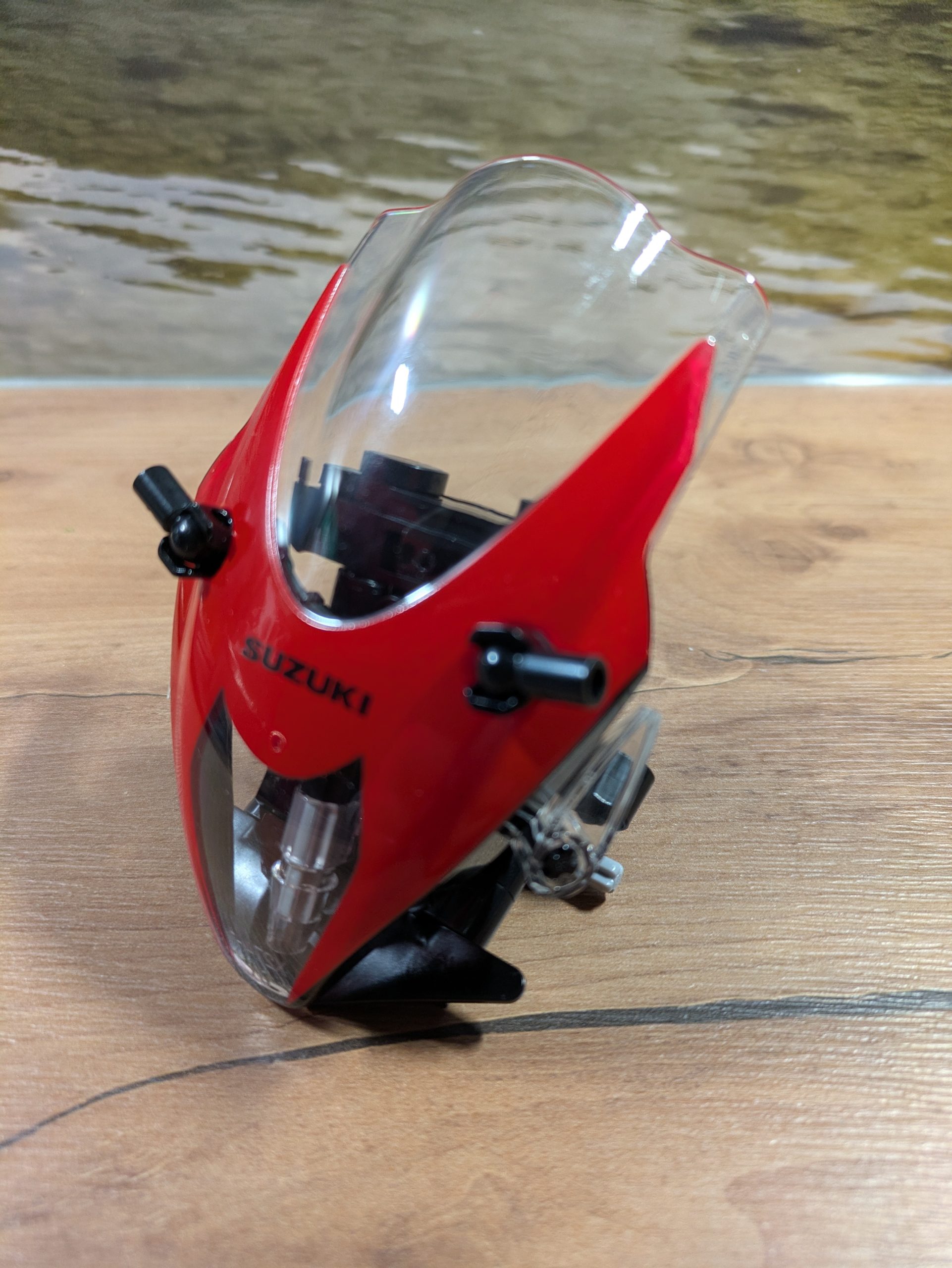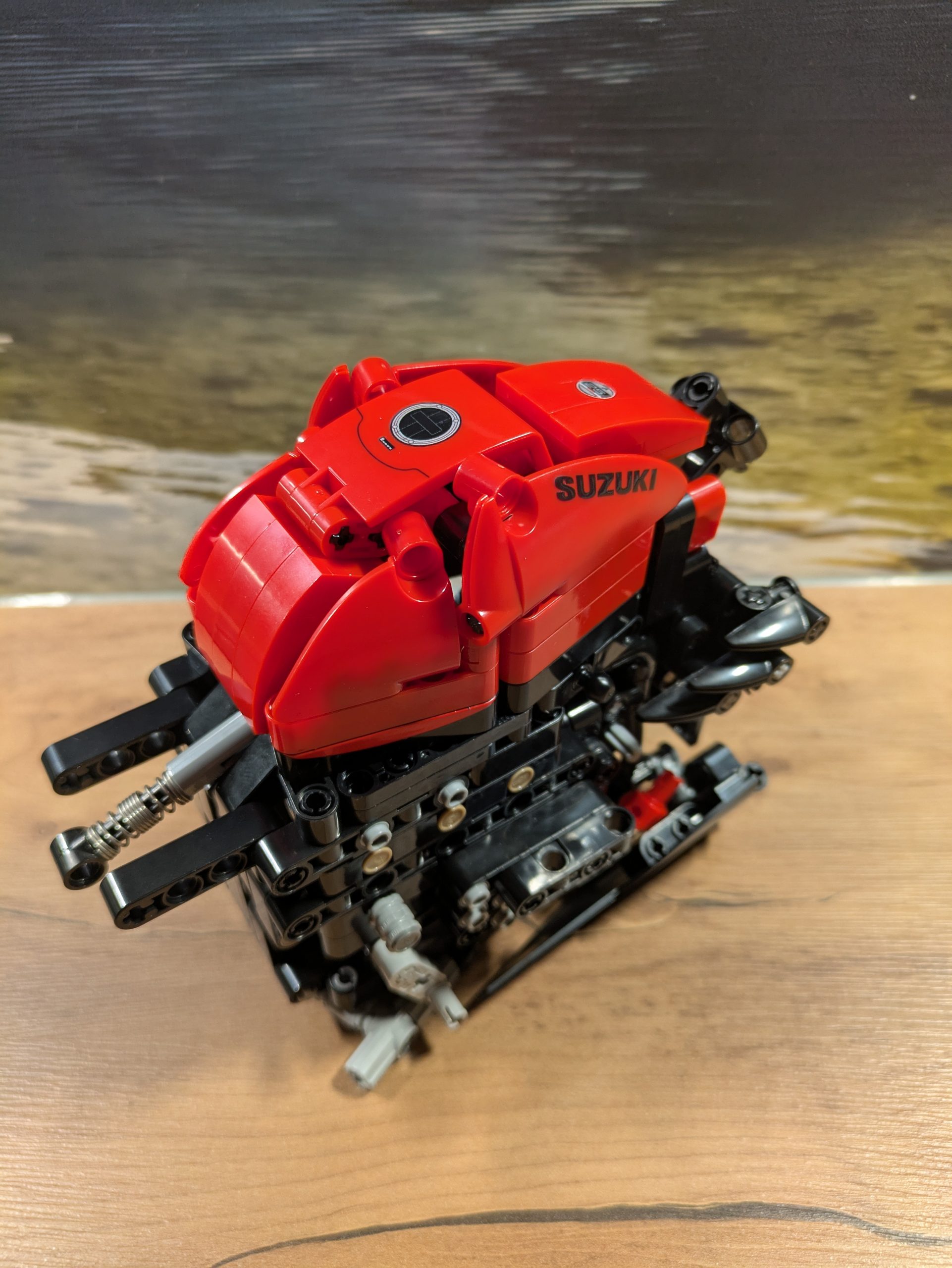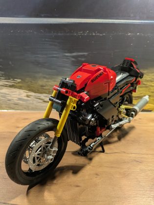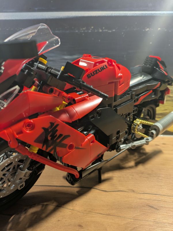 Die Hayabusa ist in der realen Welt bekannt für ihre fließenden Linien und aggressiv geschwungene Verkleidung und genau das gelingt CaDA hier auf beeindruckende Weise. Die Formgebung der Verkleidungselemente ist organisch und elegant, ohne an Stabilität zu verlieren. Der Kern des Modells ist extrem solide konstruiert; jedes Teil greift ineinander, wodurch kaum etwas wackelt oder nachgibt. Das Modell basiert auf der 25th Anniversary Edition der echten Hayabusa, die in „Glass Blaze Orange“ und „Glass Sparkle Black“ lackiert ist. Leider hat CaDA sich für ein klassisches Rot entschieden, optisch stark, aber eben nicht ganz so edel wie das Original. Die Auspuffanlage ist in Grau gehalten; hier hätte eine verchromte oder „verbrannte“ Optik den Realismus nochmals erhöht.