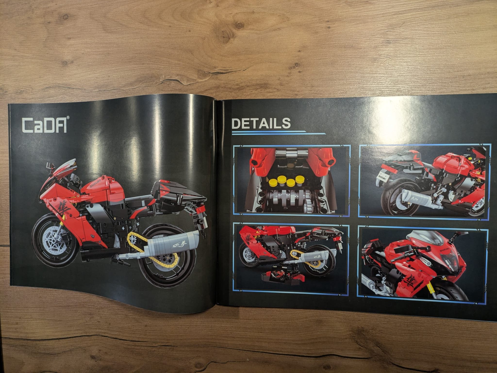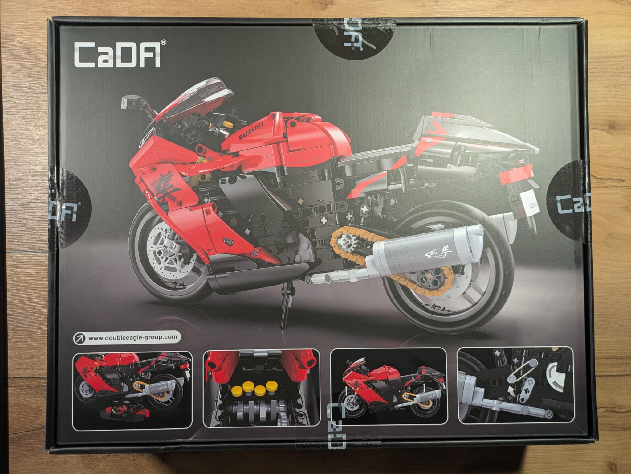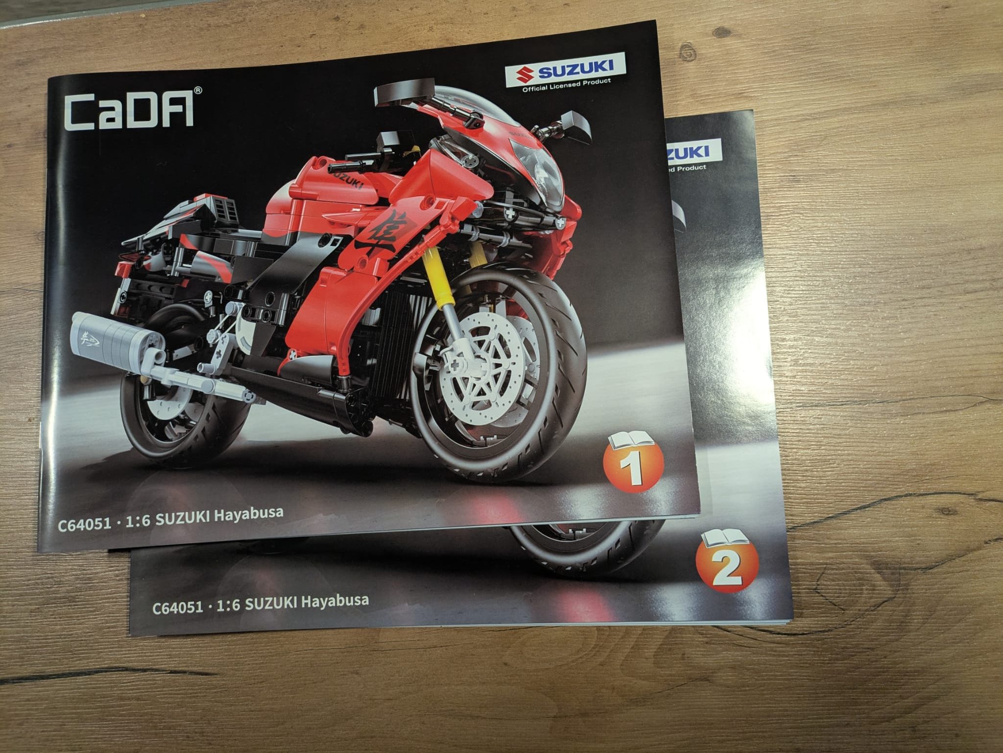 Das Set kommt in einer edlen, schwarzen Klappbox mit Hochglanzdruck und offiziellen Suzuki-Lizenzelementen. Auf der Vorderseite ist das fertige Modell in voller Pracht zu sehen, flankiert von Logo, technischen Infos und der ikonischen Silhouette des echten Motorrads. Schon beim Öffnen merkt man, dass CaDA hier auf Premium-Qualität setzt: Die einzelnen Teile sind in 16 nummerierten Tüten verpackt, dazu kommen zwei separate Beutel mit Spezialteilen wie der Windschutzscheibe und den flexiblen Stangen. Zwei gebundene Bauanleitungen mit insgesamt 103 Seiten liegen in einem separaten Umschlag bei. Am Ende findet sich, wie bei CaDA üblich, ein vollständiges Teileverzeichnis mit Teilenummern. Ein kleiner, aber feiner Unterschied zu LEGO: Die Reifen und Felgen sind lose beigelegt und nicht separat verpackt. Das unterstreicht den Fokus auf Authentizität, hier wird gebaut wie an einer echten Maschine.