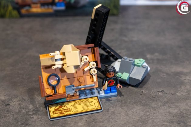 Als Erstes bauen wir den Modellständer samt kleiner Ausgrabungsstätte. Hier kommen Technic-Bausteine und -verbinder zum Einsatz, um für die notwendige Stabilität zu sorgen. Auch die Minifigur eines Kindes im Jurassic-Park-Pullover findet sich in dieser Baustufe.