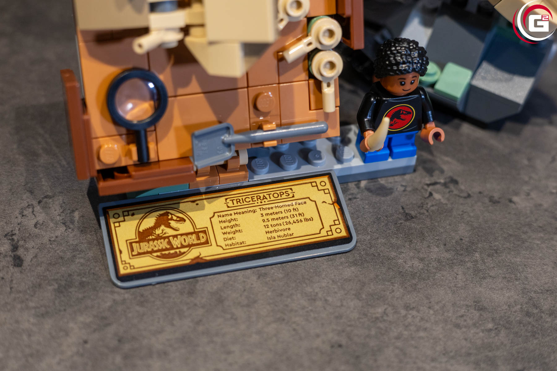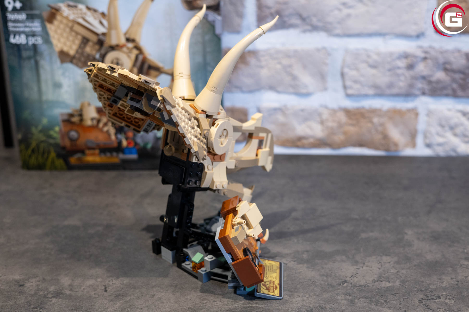 Wie man es von LEGO kennt, ist die Qualität der Bausteine und die Passgenauigkeit hervorragend, hier besteht für Kinder manchmal eher das Problem, dass sie etwas Hilfe zum richtigen Festdrücken benötigen. Gestaltung und Detaillierung sind sehr gut gelungen und es entsteht ein sehr echt wirkendes Modell eines Triceratops-Schädels, ohne dabei zu groß zu werden. Eine geschickte Bausteinkombination ermöglicht die passende Darstellung der gewölbten Schädelplatten und auch die Form der Hörner ist gut umgesetzt. Durch die zusätzlichen Elemente bringt der Modellständer weitere Details mit sich, die dem Modell noch stärker einen musealen Charakter geben. Statt des Aufklebers wäre eine bedruckte Sockelplatte schön gewesen, jedoch ist dieser so gut gefertigt, dass der Unterschied kaum auffällt.