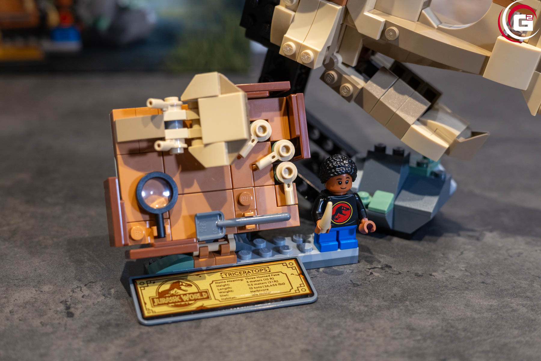 Das Set LEGO Jurassic World 76969 – Dinosaurier-Fossilien: Triceratops-Schädel ist ein detailliertes Abbild des Schädels eines der bekanntesten Dinosaurier. Er besitzt einen aufklappbaren Kiefer und ist mit Schädelplatte und Hörnern realistisch gestaltet. Am Fuß des Modellständers befindet sich ein Schild mit einigen Detailangaben zu diesem Dinosaurier. Ein Modell einer Ausgrabungsstelle verleiht dem Ständer weitere Details.