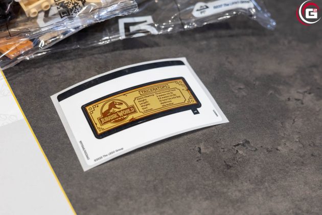 Wie wir es aus anderen Serien bereits kennen, besitzt auch LEGO Jurassic World ein eigenes Design für die Umverpackungen. Der Hintergrund ist hier eher silbern gehalten und mit Abdrücken von Skeletten dekoriert. Neben dem LEGO-Logo findet sich das ikonische Jurassic-World-Logo. Auf der Vorderseite wird ein Bild des aufgebauten LEGO-Modells, dass mit einem passenden Hintergrund in Szene gesetzt wurde, gezeigt. Auf der Rückseite finden sich neben der Zeichnung eines Triceratops-Skeletts eine bemaßte Abbildung und ein Bild, das den Schädel gewissermaßen als Fossil im Boden zeigen soll.