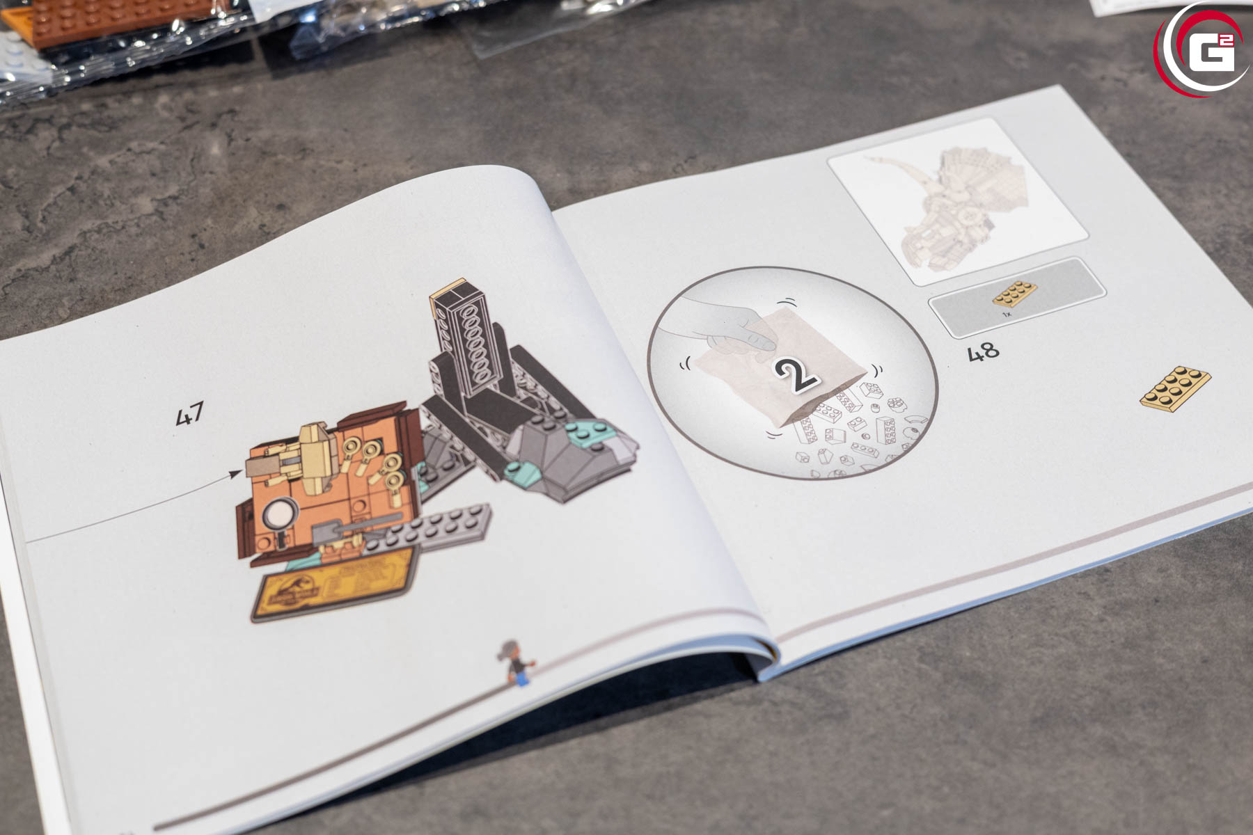 In der beiliegenden Bauanleitung wird der Aufbau des Sets LEGO Jurassic World 76969 – Dinosaurier-Fossilien: Triceratops-Schädel wie gewohnt sehr detailliert dargestellt und kleinschrittig beschrieben. Darüber hinaus kann man auch auf die LEGO-Builder-App (iOS und Android) zurückgreifen. Hier finden sich noch detaillierte Anleitungen, in denen man auch jede Ansicht beliebig drehen kann.