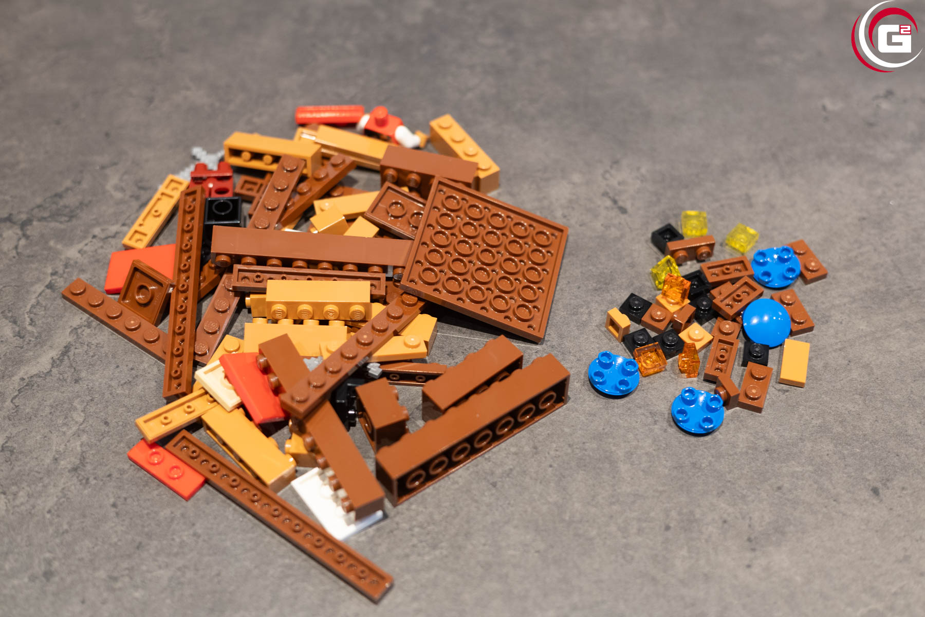 In der Verpackung finden sich neben der gedruckten Bauanleitung zwei Papiertüten mit den Einzelteilen. In beiden findet sich jeweils eine weitere kleine Papiertüte mit den besonders kleinen Steinen. Zur Verbesserung der Nachhaltigkeit hat LEGO Ende letzten/Anfang dieses Jahres mit dem Wechsel von Plastik- zu Papiertüten begonnen.