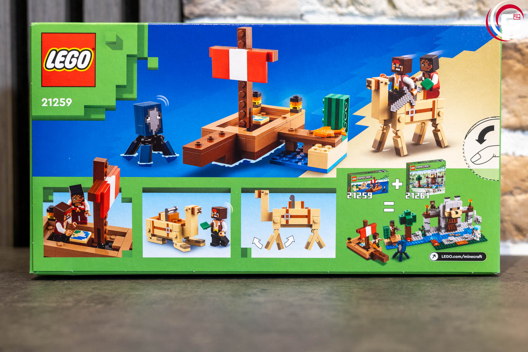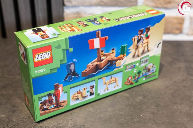 Das Set LEGO Minecraft 21259 – Die Piratenschiffreise kommt in einer Umverpackung im charakteristischen LEGO-Minecraft-Design. Auf der Vorderseite wird ein Bild des aufgebauten LEGO-Modells, dass mit einem passenden Meeres-Hintergrund in Szene gesetzt wurde, gezeigt. Auf der Rückseite finden sich Detaildarstellung des Modells, die den Spielwert etwas aufzeigen sollen.