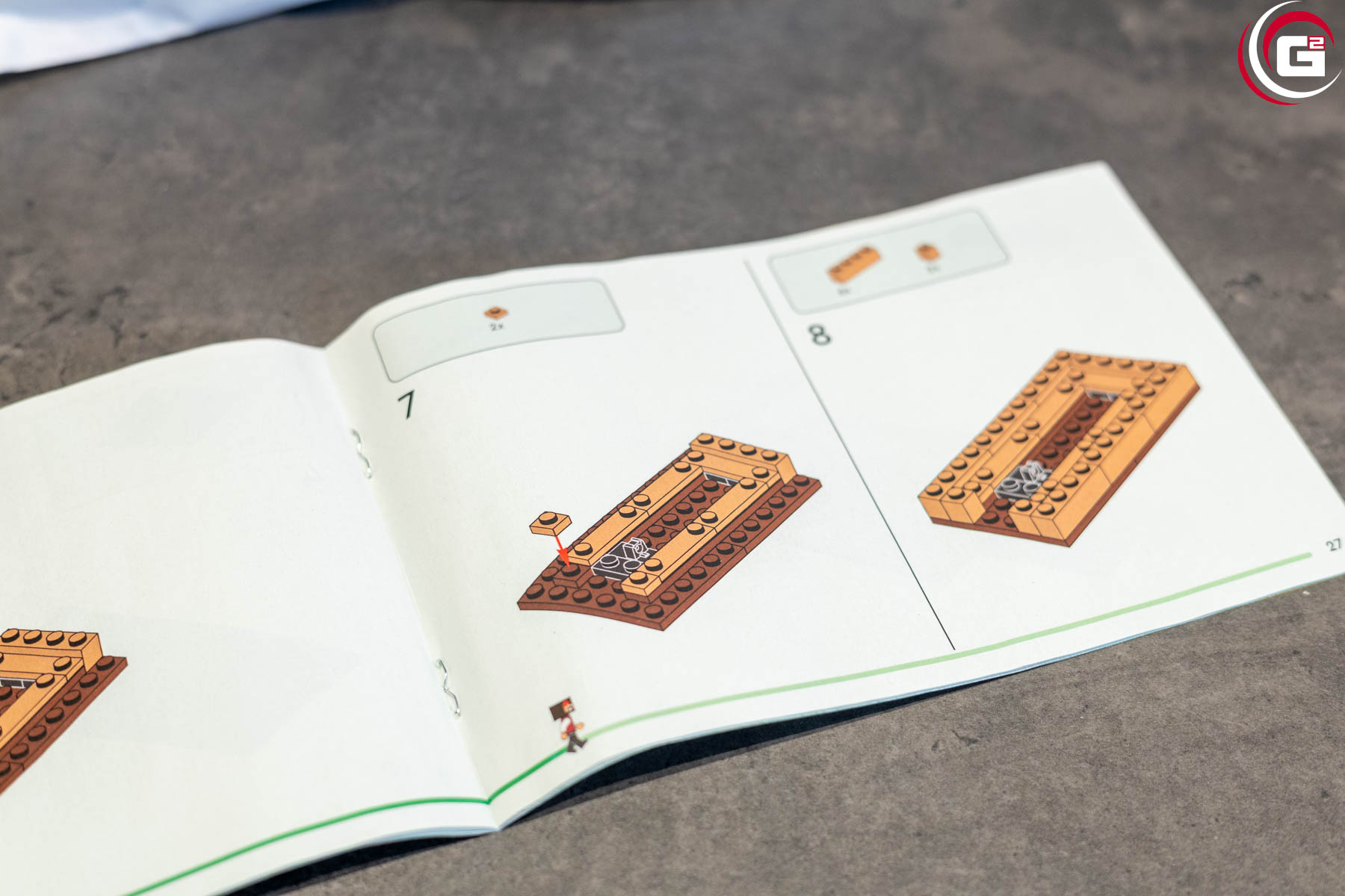 Der Aufbau ist entsprechend der zwei Papiertüten in zwei Baustufen unterteilt. Die beiden enthaltenen Figuren sind auf beide Baustufen aufgeteilt. Im ersten Bauabschnitt findet man einen der beiden Piraten, das Dromedar, den Oktopus und man baut den kleinen Anleger auf.