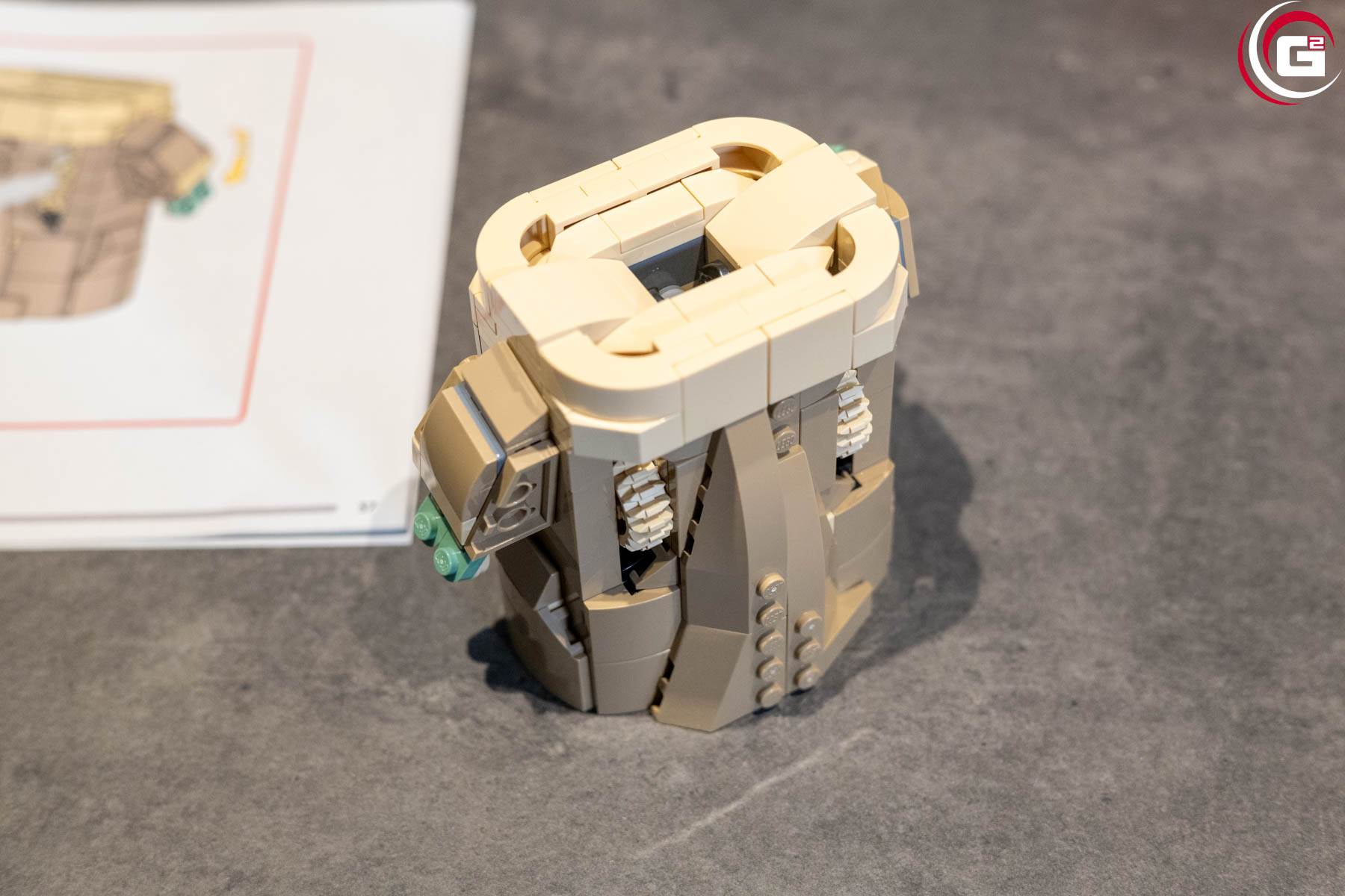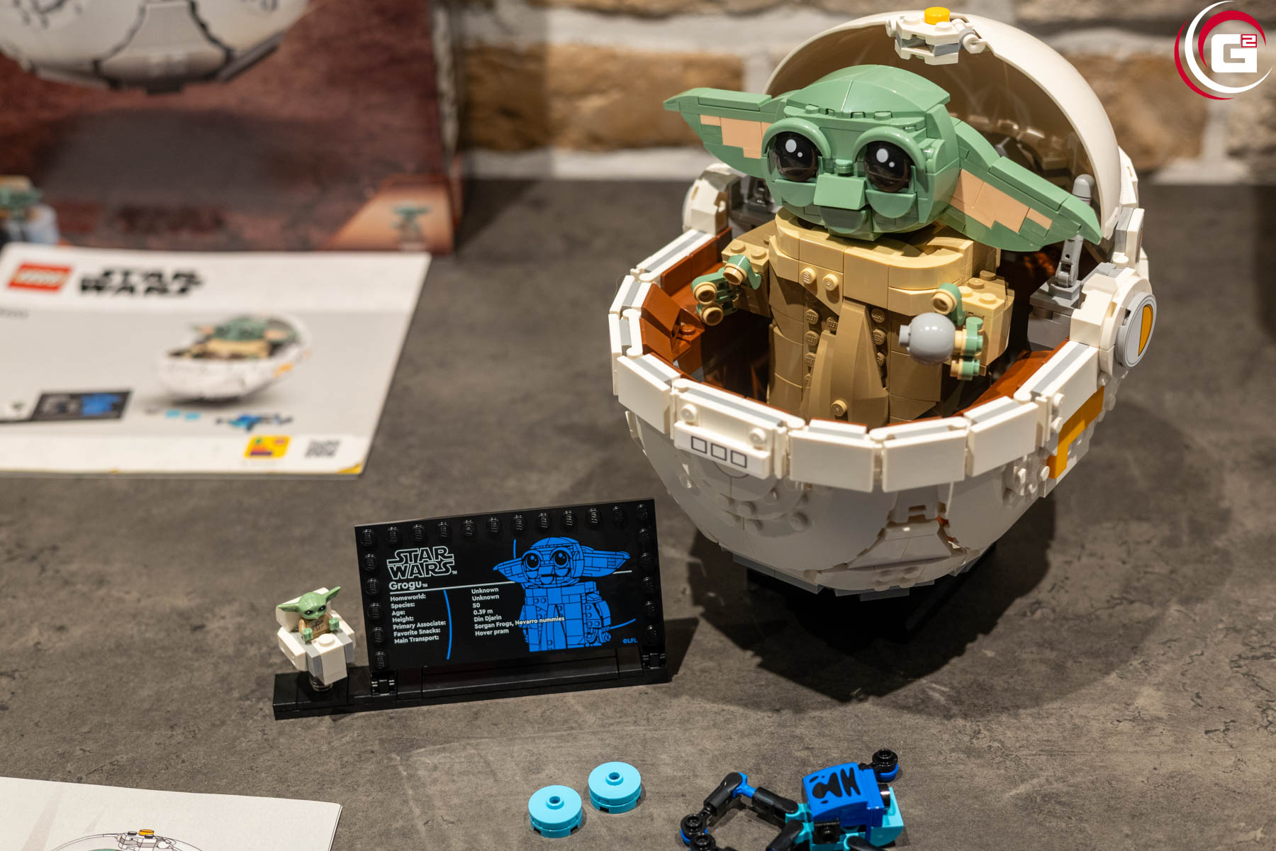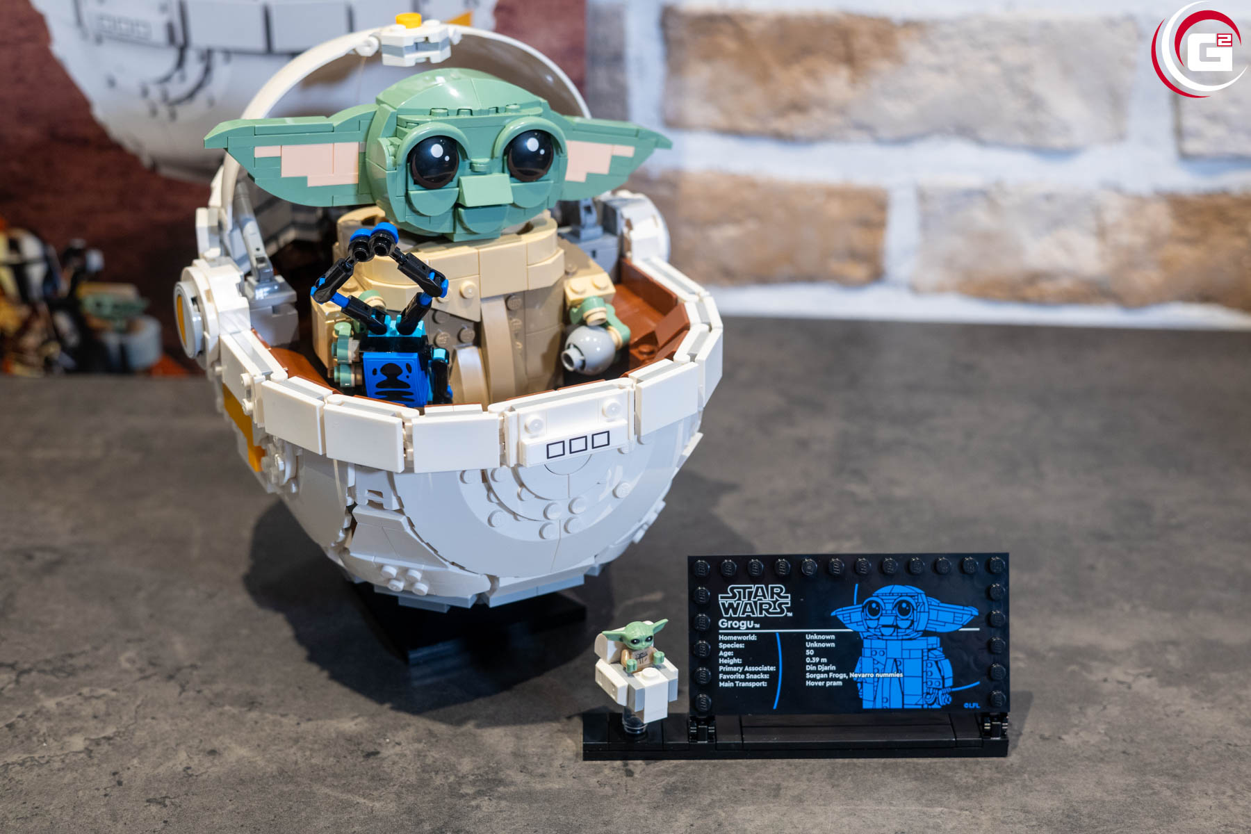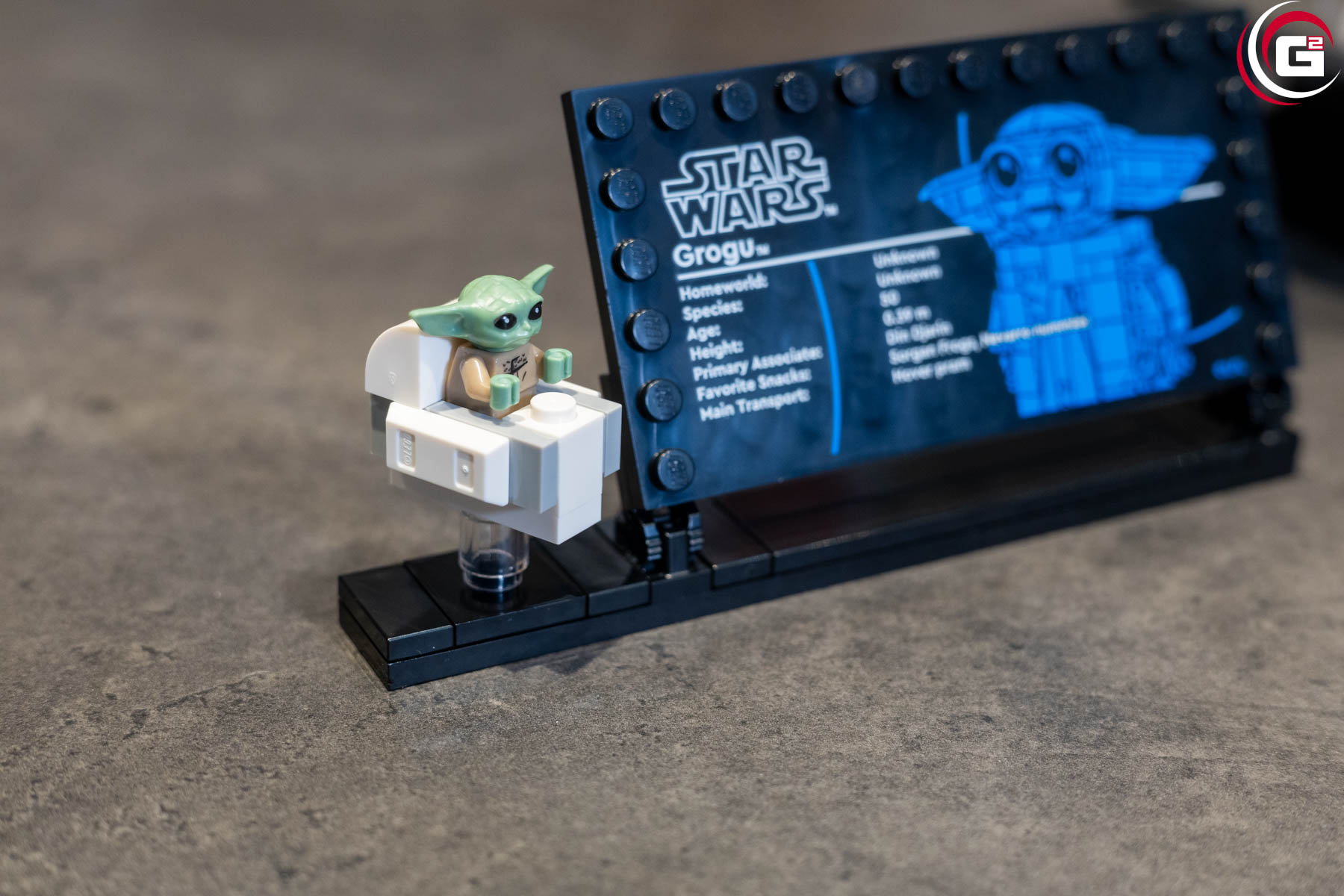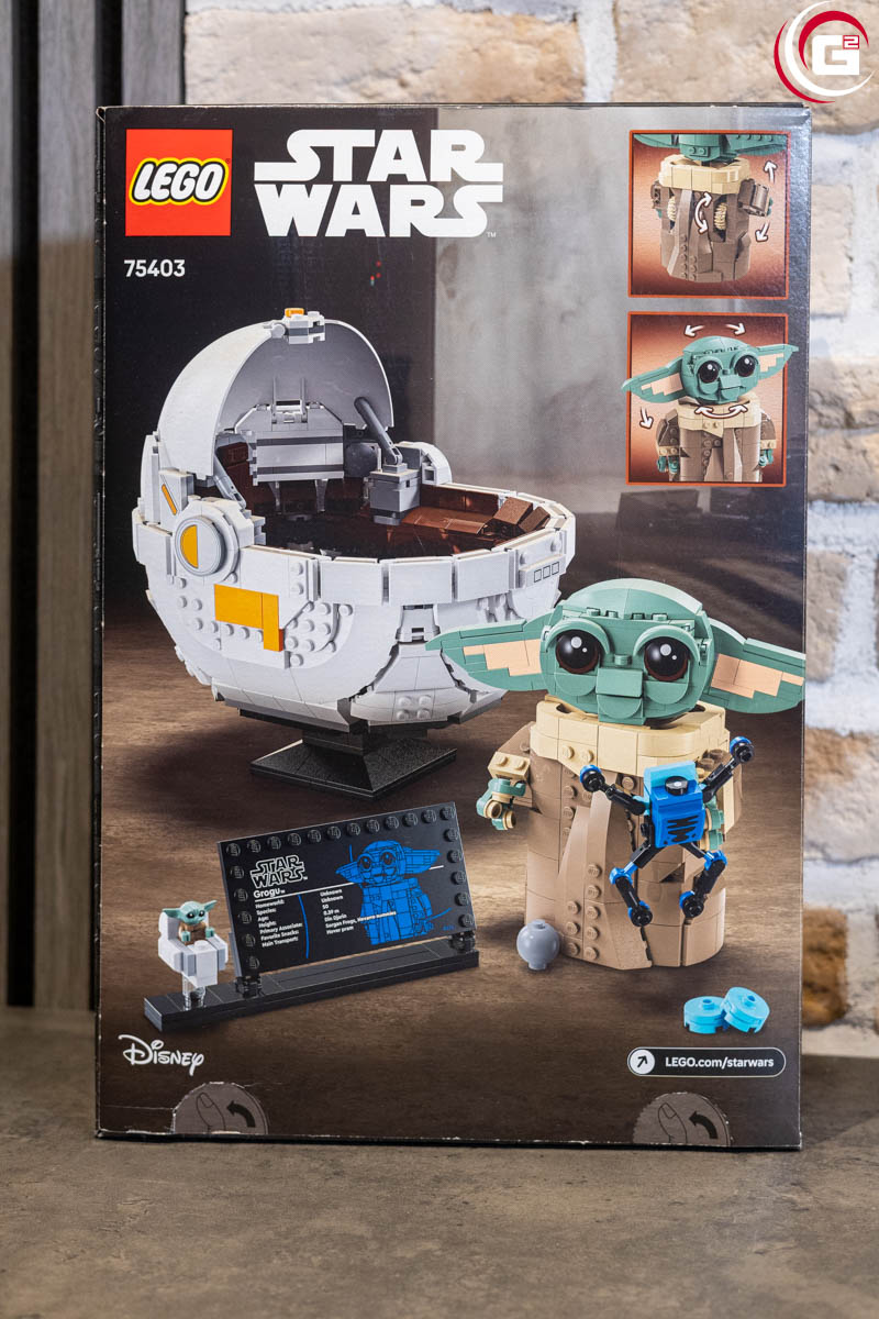 Das Set enthält eine detaillierte Mini-Minifigur von Grogu in einer kleinen Version der Repulsorwiege. Auf der seitlichen Tafel finden sich einige Details zu Grogu.