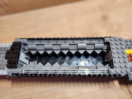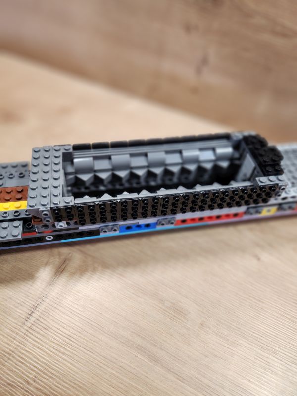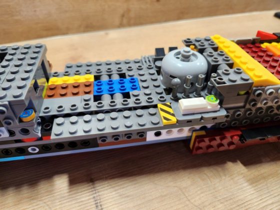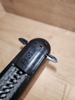 Die Montage der äußeren Rumpfsegmente war dagegen wieder ein Wechselspiel aus Faszination und Fummelei. Besonders die großen Außenhüllen-Elemente sitzen extrem straff, der VLS-Deckel (die Abdeckung der Raketensilos) etwa ließ sich nur mit Nachdruck einsetzen. Gleichzeitig gab es auch amüsante Fehltritte, wie den Hinweis, die Sichtfenster auf der falschen Seite des Turms zu montieren. Glücklicherweise sind solche Patzer leicht zu korrigieren. Ein Lichtblick zum Schluss: Der Display-Ständer. Dieser Abschnitt baut sich einfach, ist stabil und bietet einen sicheren Halt für das massive Modell. Hier kann man entspannt durchatmen, im wahrsten Sinne des Wortes.