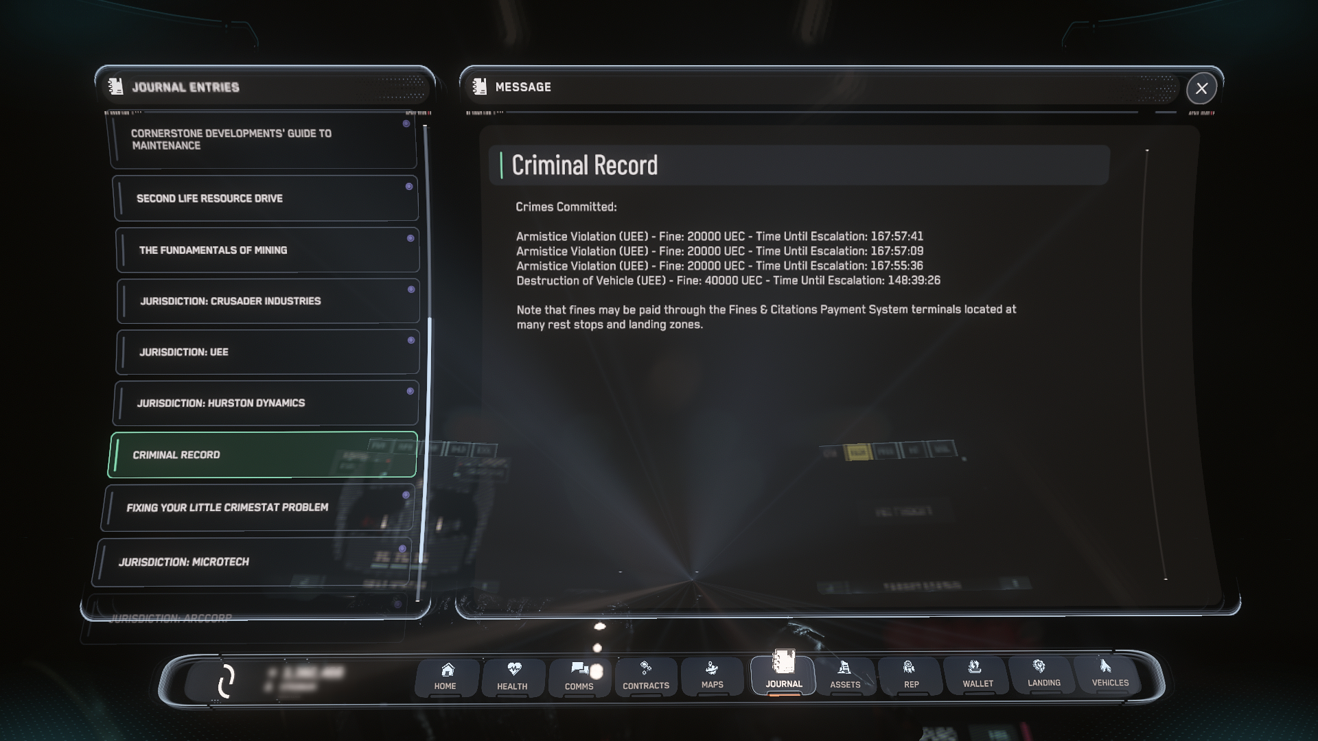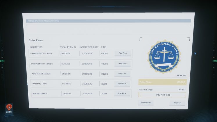 Leichte Verbrechen, die dir einen Crimestat von 1 oder 2 einhandeln, haben erstmal keine weitreichenden Folgen, können diese auch schnell einmal jemandem passieren. Du kannst in diesem Stadium einfach bei der nächsten Station oder einem Spaceport landen und an Terminals des “Office of Imperial Justice” deine Strafe bezahlen.