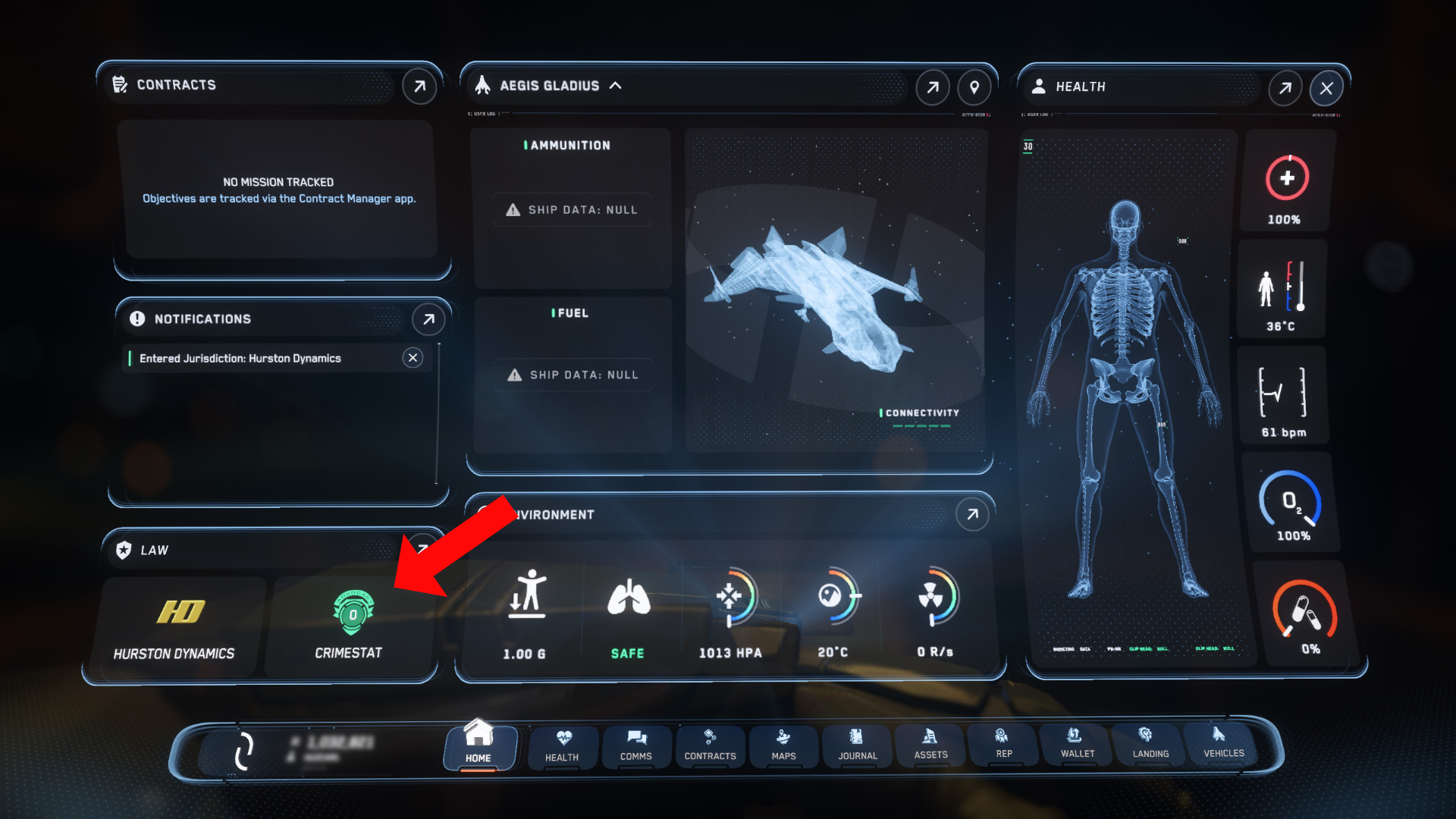 Es gibt insgesamt fünf Stufen auf der Crimestat-Skala. Deine aktuelle Stufe wird dir im Mobiglas, im Reiter “Home”, im unteren, linken Bereich, sowie auch direkt im HUD angezeigt.