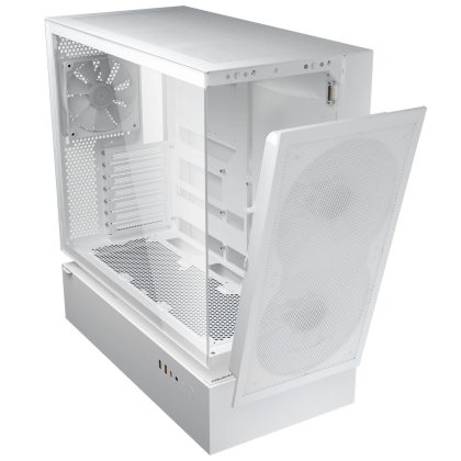 Das CFV235 Mesh setzt ebenfalls auf die CFV-Struktur, kombiniert sie jedoch mit einem vorinstallierten 3-in-1-Frontmodul bestehend aus Mesh-Front, zwei 160-mm-ARGB-PWM-Lüftern und einem Staubfilter. Die Verbindung erfolgt über Pogo-Pins, wodurch Kabel im Frontbereich weitgehend entfallen, das erleichtert sowohl den Einbau als auch die Reinigung. Die GPU-Länge liegt hier bei 400 mm, alle weiteren Kompatibilitäts- und Anschlussdaten entsprechen dem Standardmodell.