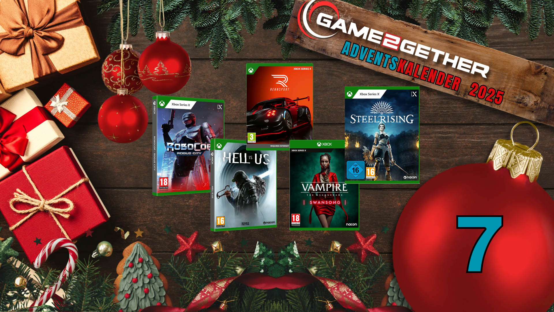 Heute öffnen wir das siebte Türchen des Game2Gether Adventskalender 2025! Heute erwartet euch ein Bundle aus den besten Spielen des Publishers Nacon für die Xbox. Im Paket enthalten sind: Retail-Editionen von Hell is Us, RoboCop: Rogue City, Steelrising, Vampire: The Masquerade – Swansong sowie ein Code für die digitale Edition von Rennsport.
