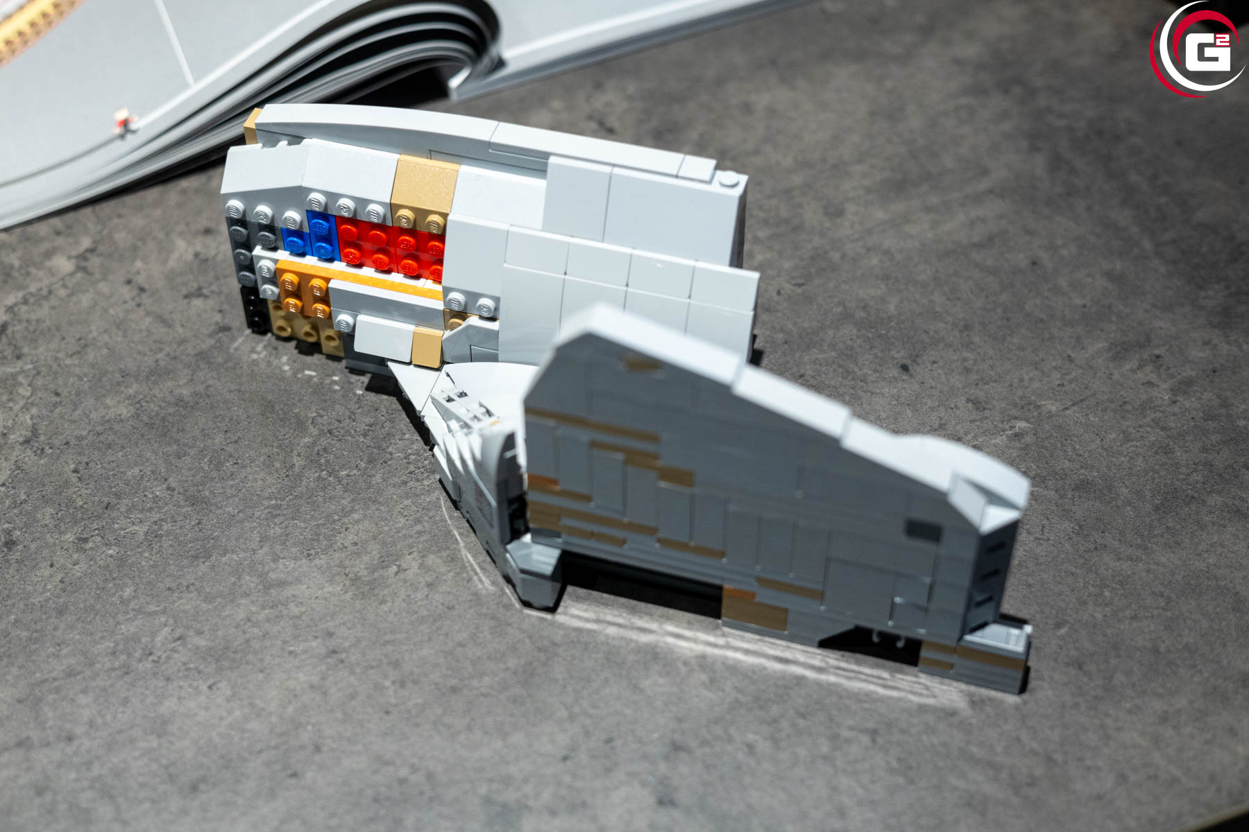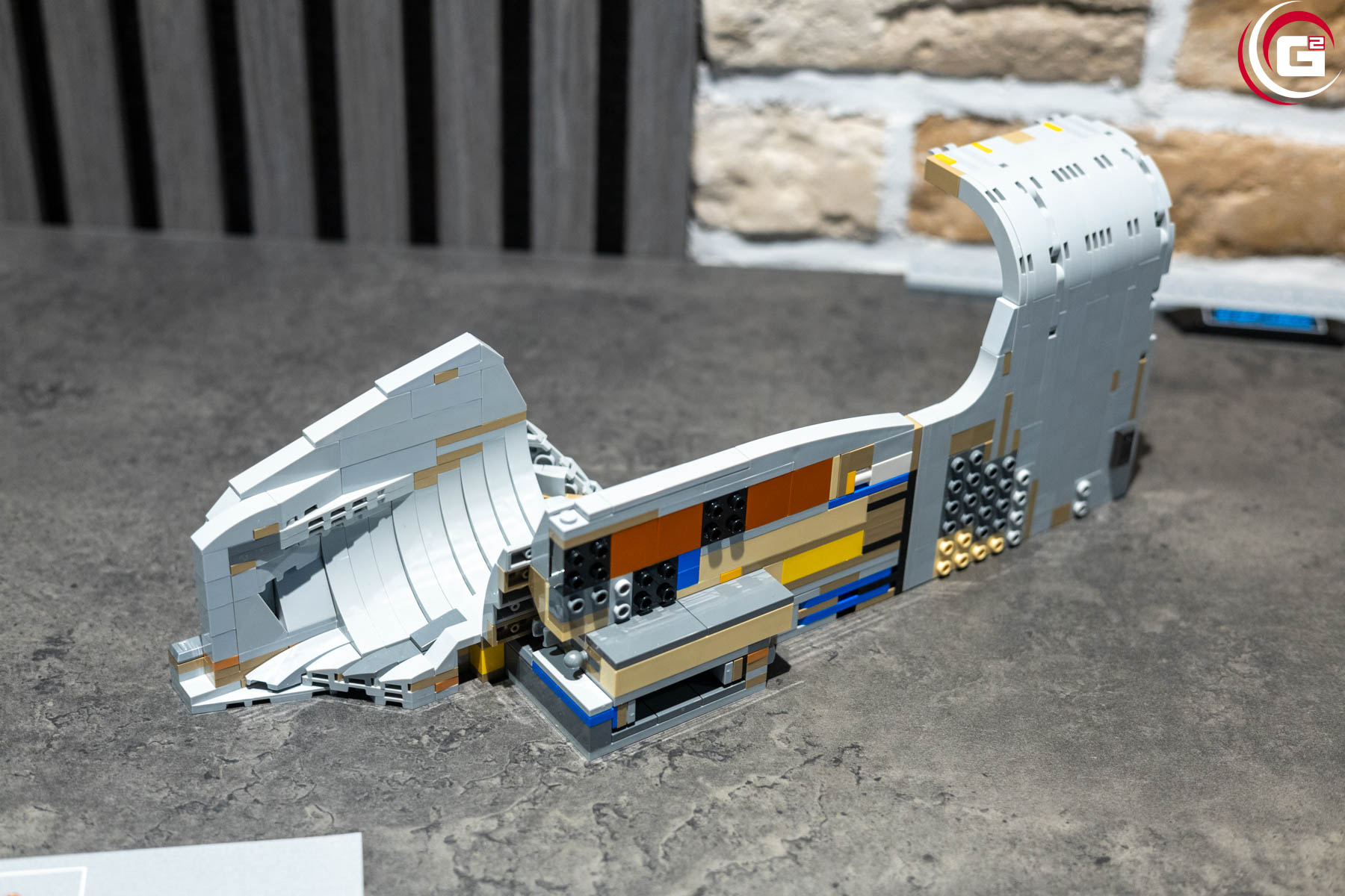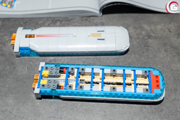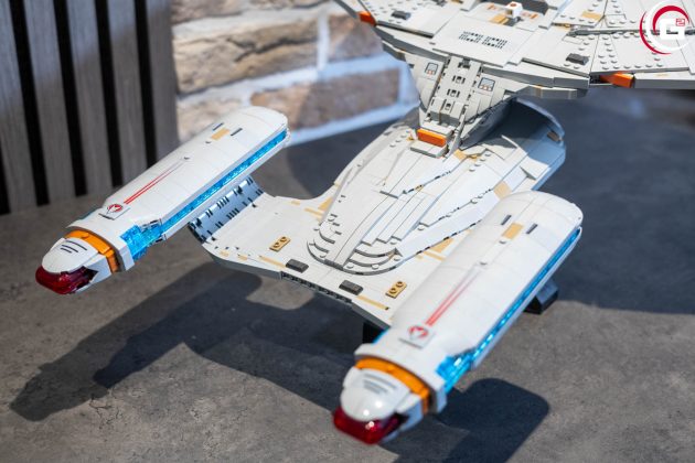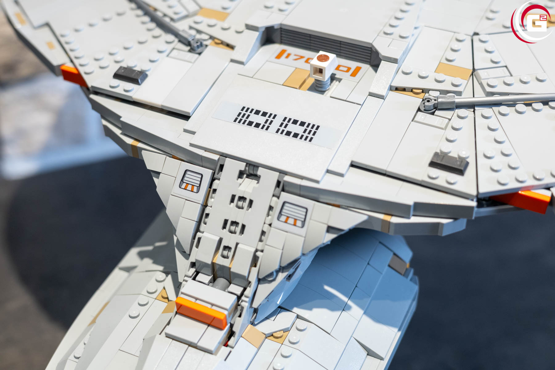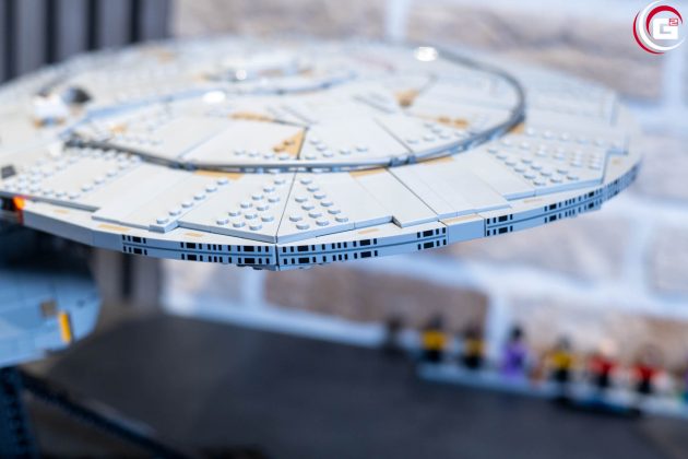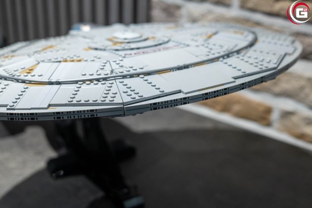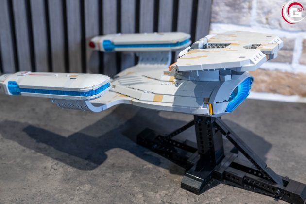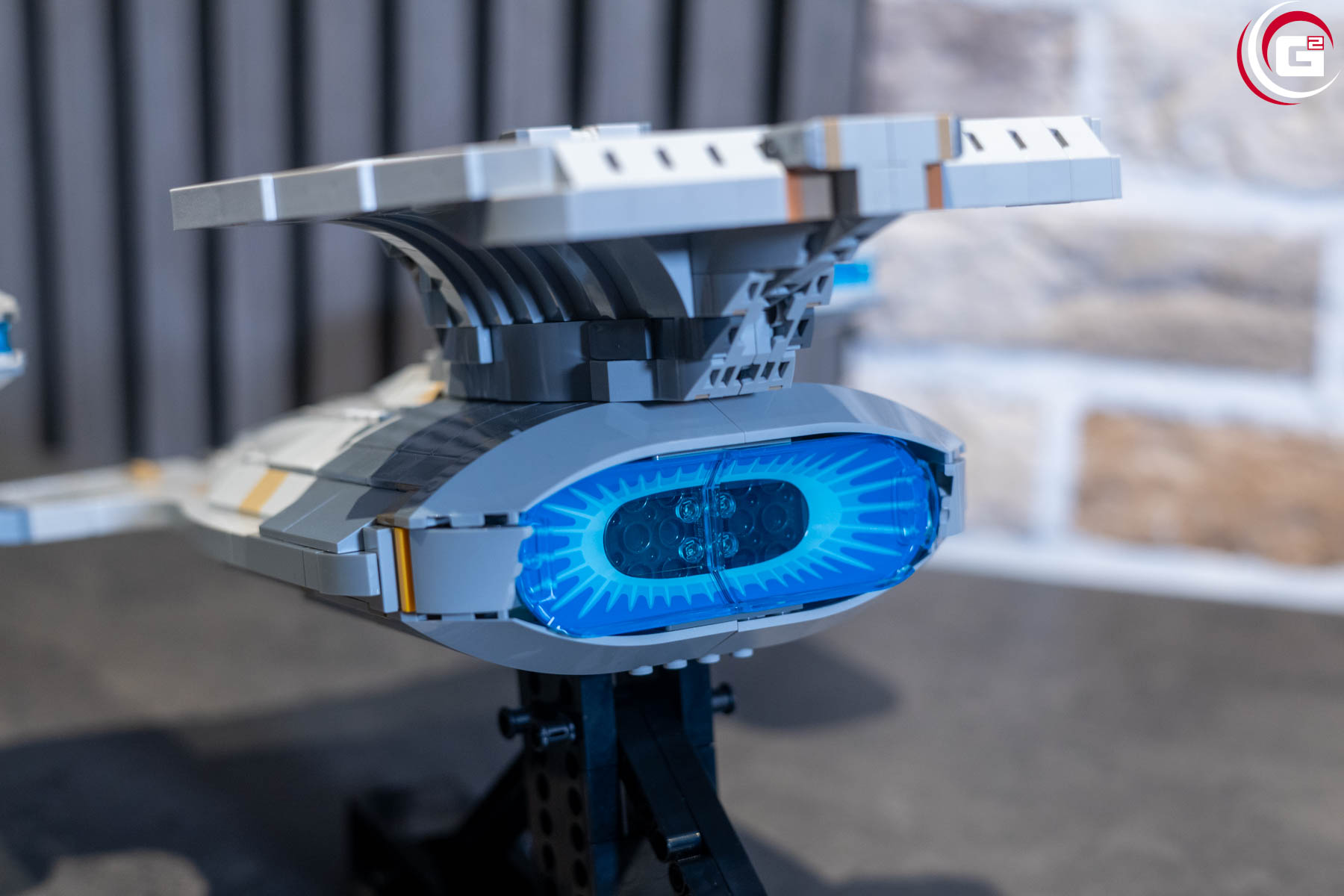 Der Detaillierungsgrad des Modells ist extrem gut gelungen. Zudem sorgt eine sehr elegante Kombination von Steinen und Bautechniken für eine wirklich ovale Untertassensektion und geschwungene Konturen an der Antriebssektion. Obwohl das Modell zerlegbar ist, sind beide Sektionen bombenfest miteinander verbunden und lassen sich durch den eleganten Arretierungsmechanismus dennoch leicht lösen.