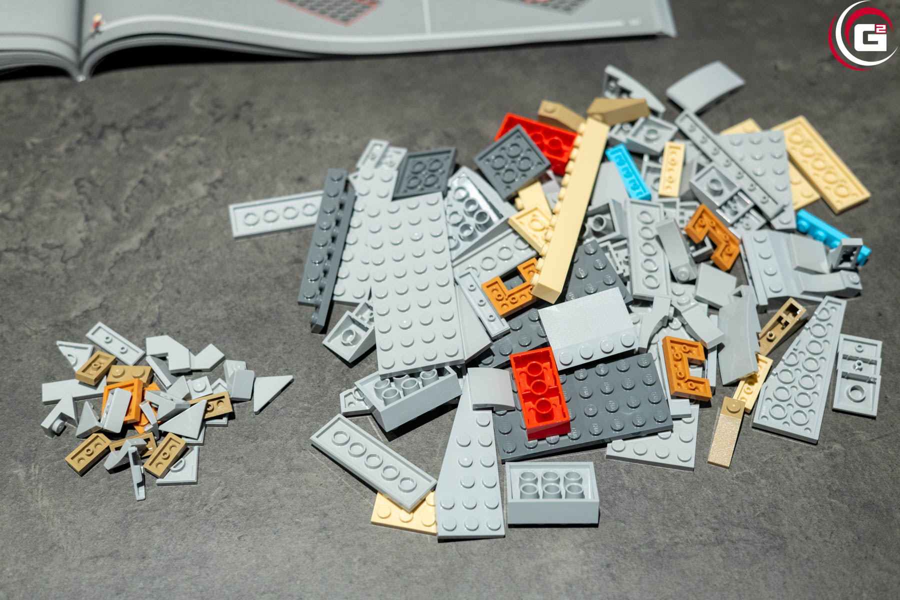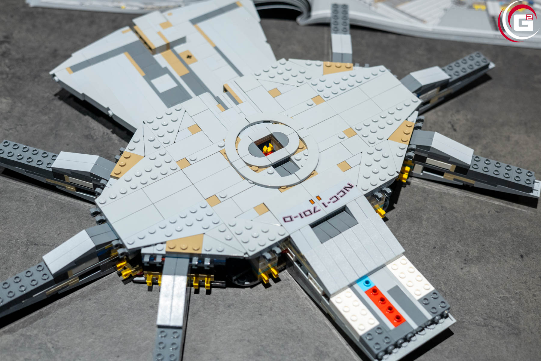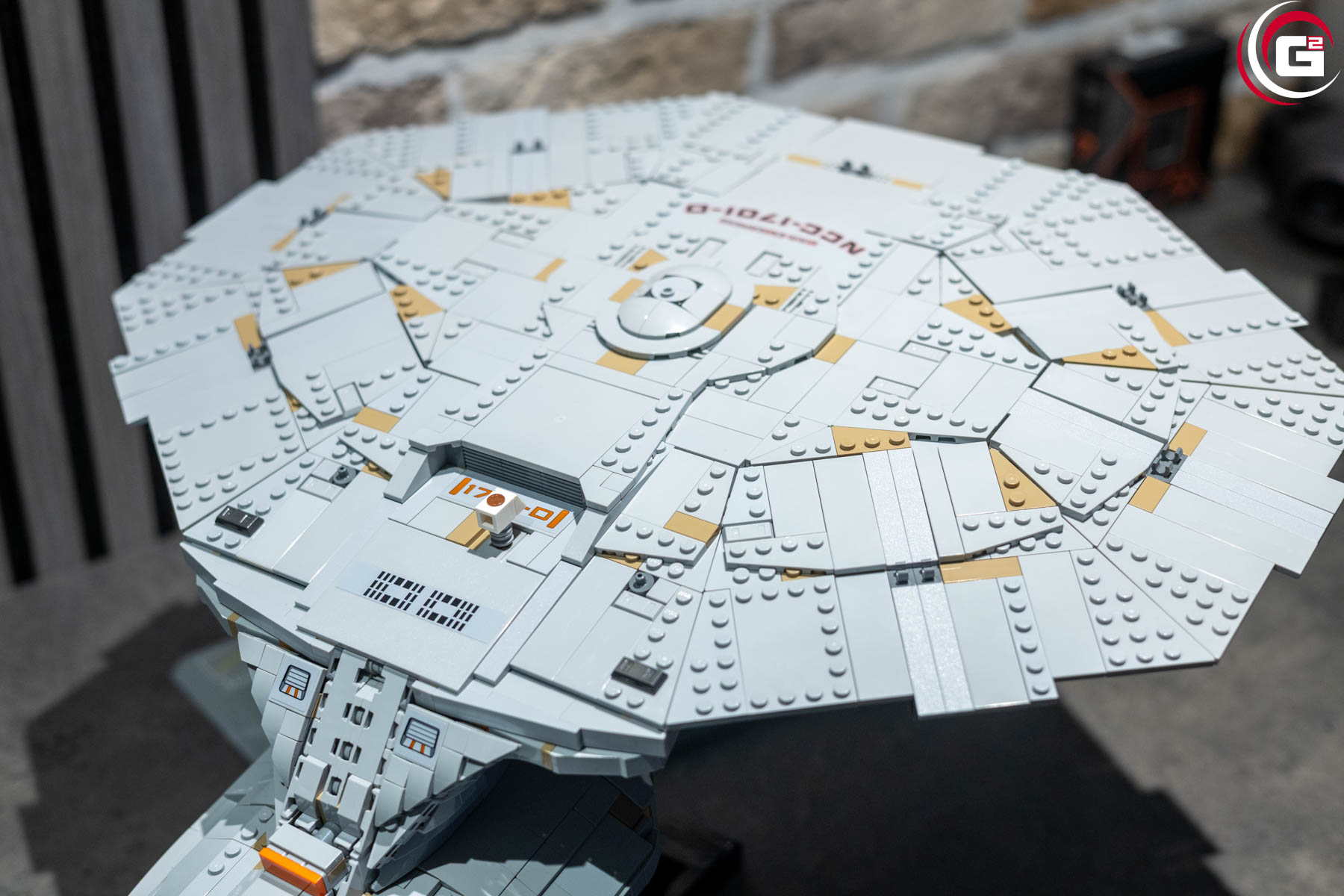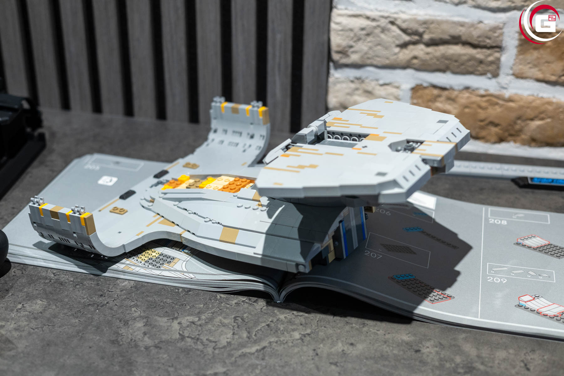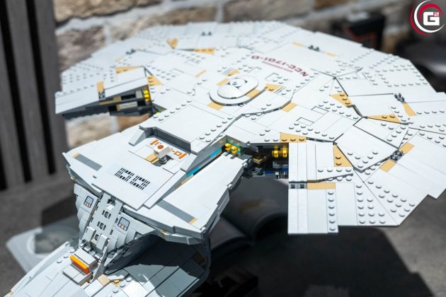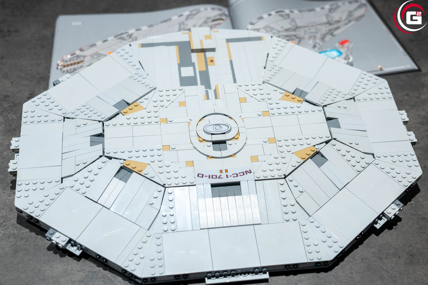 Wie man es von LEGO kennt, sind die Qualität der Bausteine und die Passgenauigkeit hervorragend, auch die Farbgebung ist homogen. Gestaltung und Detaillierung sind hier auf einem extrem hohen Niveau angesiedelt. Es kommen sehr viele bedruckte Teile zum Einsatz, insbesondere an den besonders markanten Stellen. Es gibt jedoch auch einige Sticker, die man ruhig durch weitere bedruckte Teile hätte ersetzen können. Durch seine Größe besitzt das Modell natürlich ein durchaus beeindruckendes Gewicht. Dank der extrem stabilen Konstruktion stellt dies kein Problem dar und auch der Modellständer ist so konzipiert, dass er das Modell stets stabil hält. Hierbei wurde auch berücksichtigt, dass das Modell nicht das Gleichgewicht verlieren darf, wenn man die Untertassensektion abnimmt. Zum Tragen wird in der Anleitung darauf hingewiesen, wie man das Modell am besten greifen kann, ohne etwas zu beschädigen.