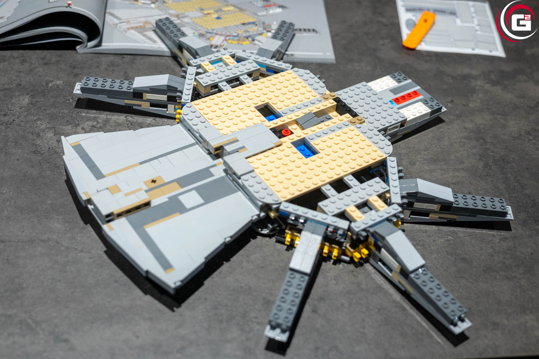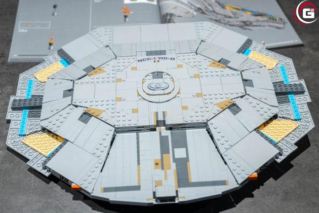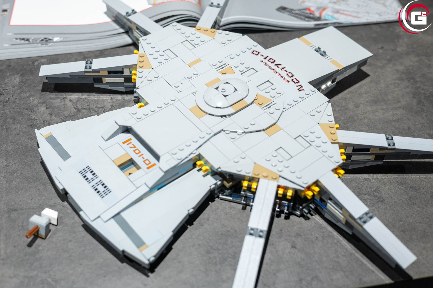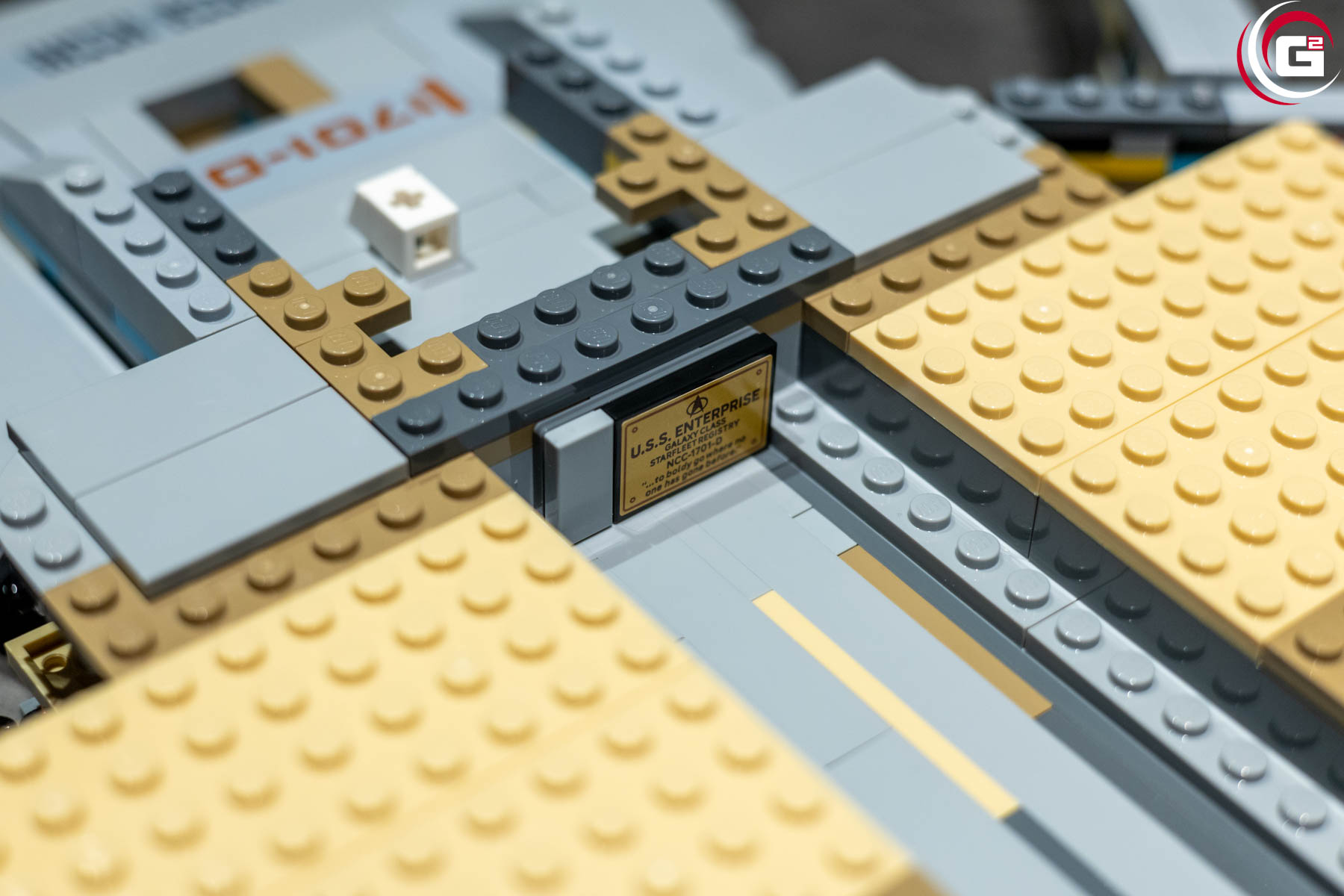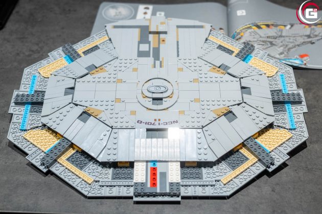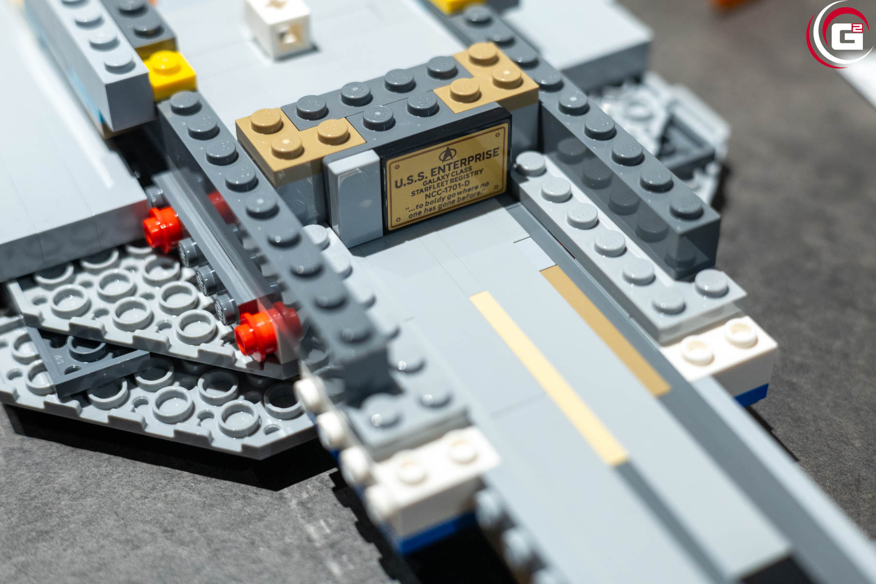 Wie man es von LEGO kennt, sind die Qualität der Bausteine und die Passgenauigkeit hervorragend, auch die Farbgebung ist homogen. Gestaltung und Detaillierung sind hier auf einem extrem hohen Niveau angesiedelt. Es kommen sehr viele bedruckte Teile zum Einsatz, insbesondere an den besonders markanten Stellen. Es gibt jedoch auch einige Sticker, die man ruhig durch weitere bedruckte Teile hätte ersetzen können. Durch seine Größe besitzt das Modell natürlich ein durchaus beeindruckendes Gewicht. Dank der extrem stabilen Konstruktion stellt dies kein Problem dar und auch der Modellständer ist so konzipiert, dass er das Modell stets stabil hält. Hierbei wurde auch berücksichtigt, dass das Modell nicht das Gleichgewicht verlieren darf, wenn man die Untertassensektion abnimmt. Zum Tragen wird in der Anleitung darauf hingewiesen, wie man das Modell am besten greifen kann, ohne etwas zu beschädigen.