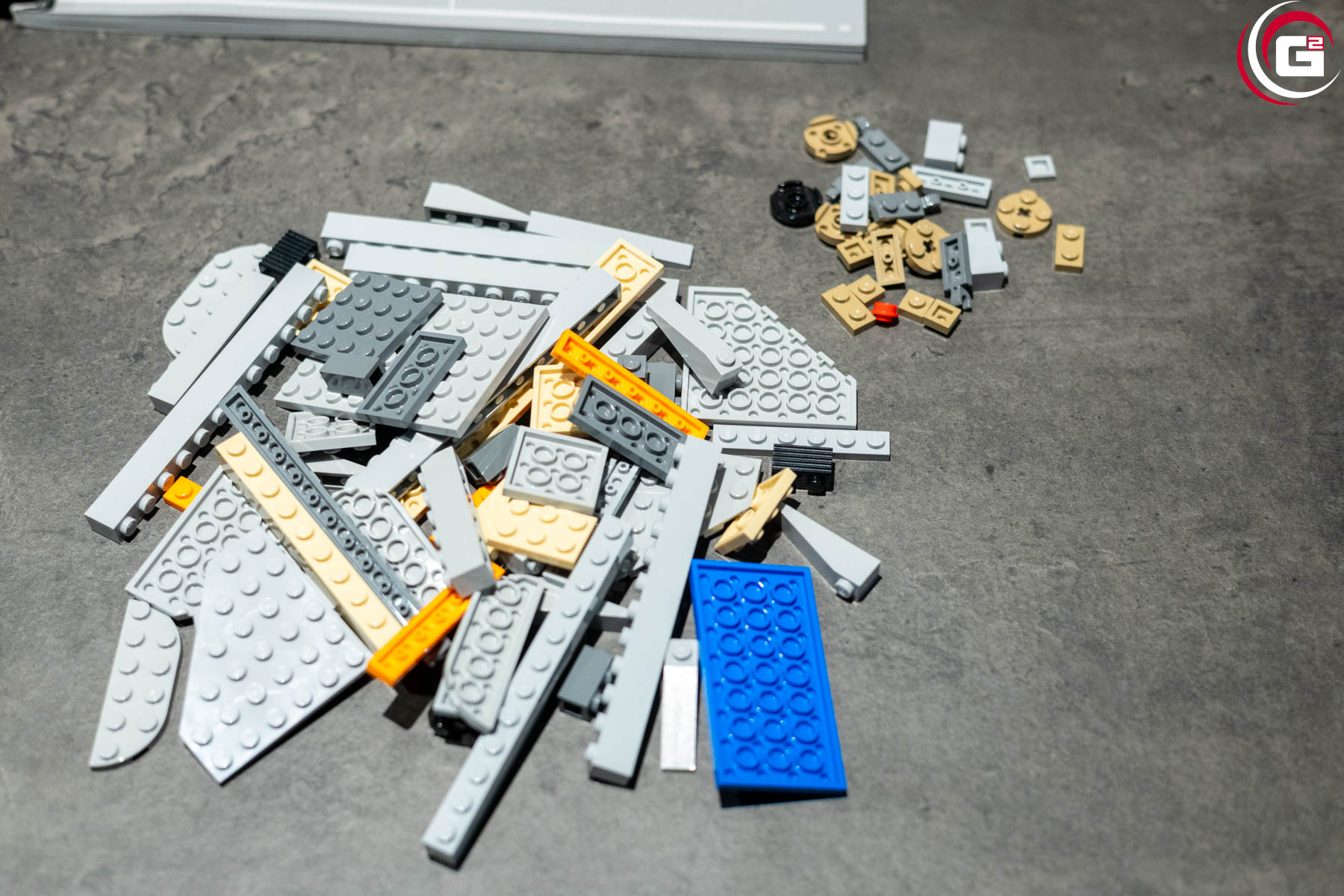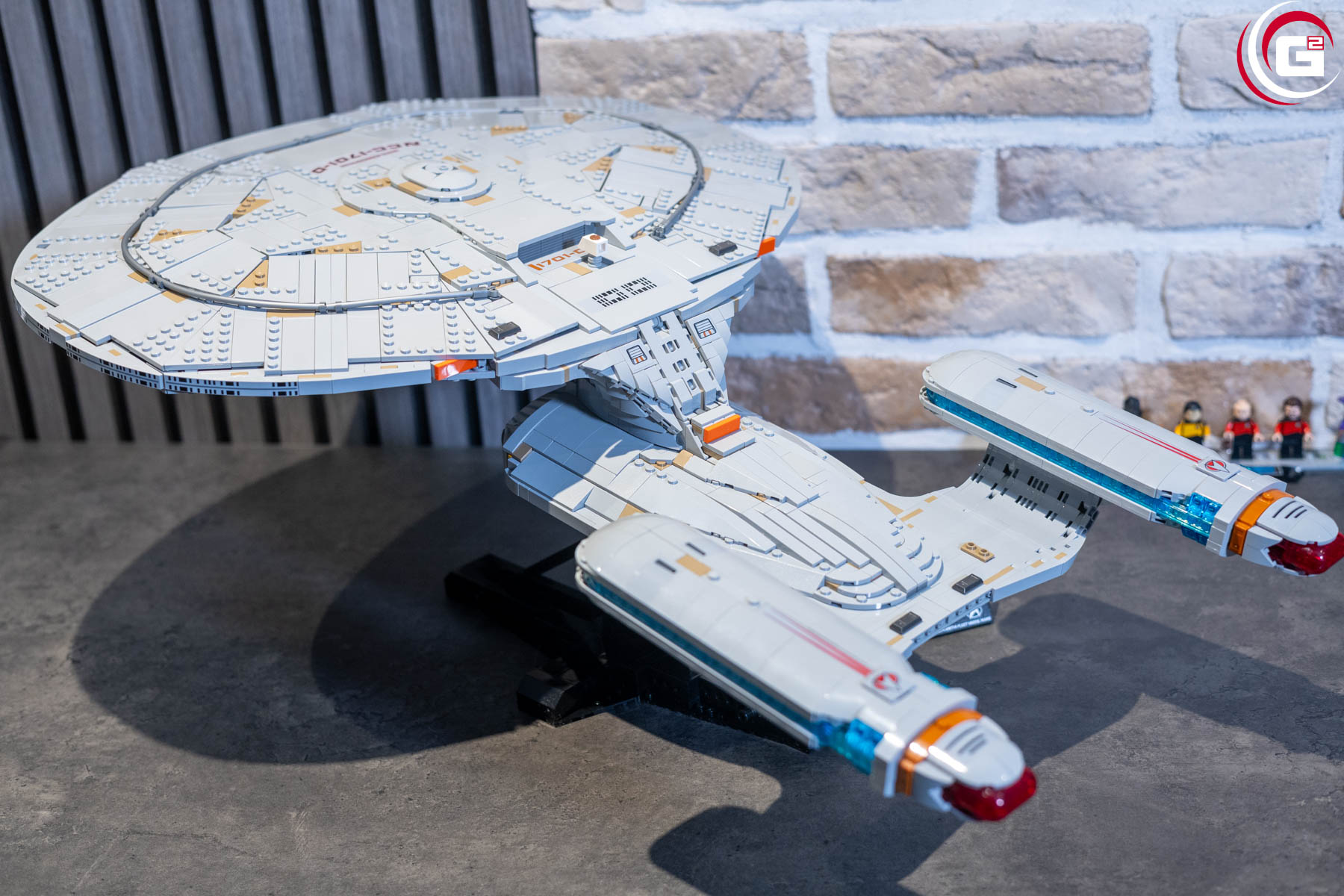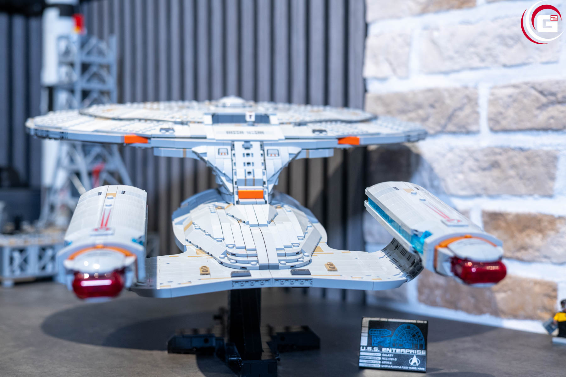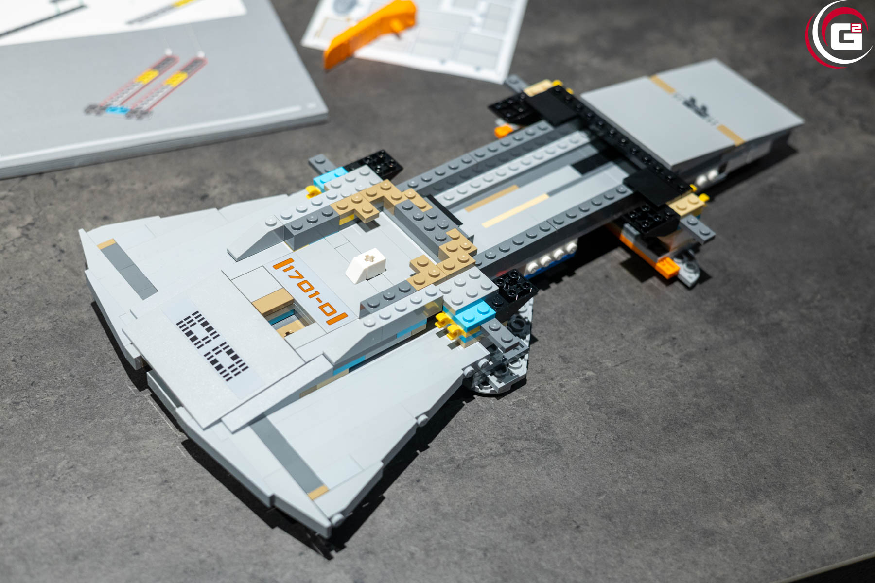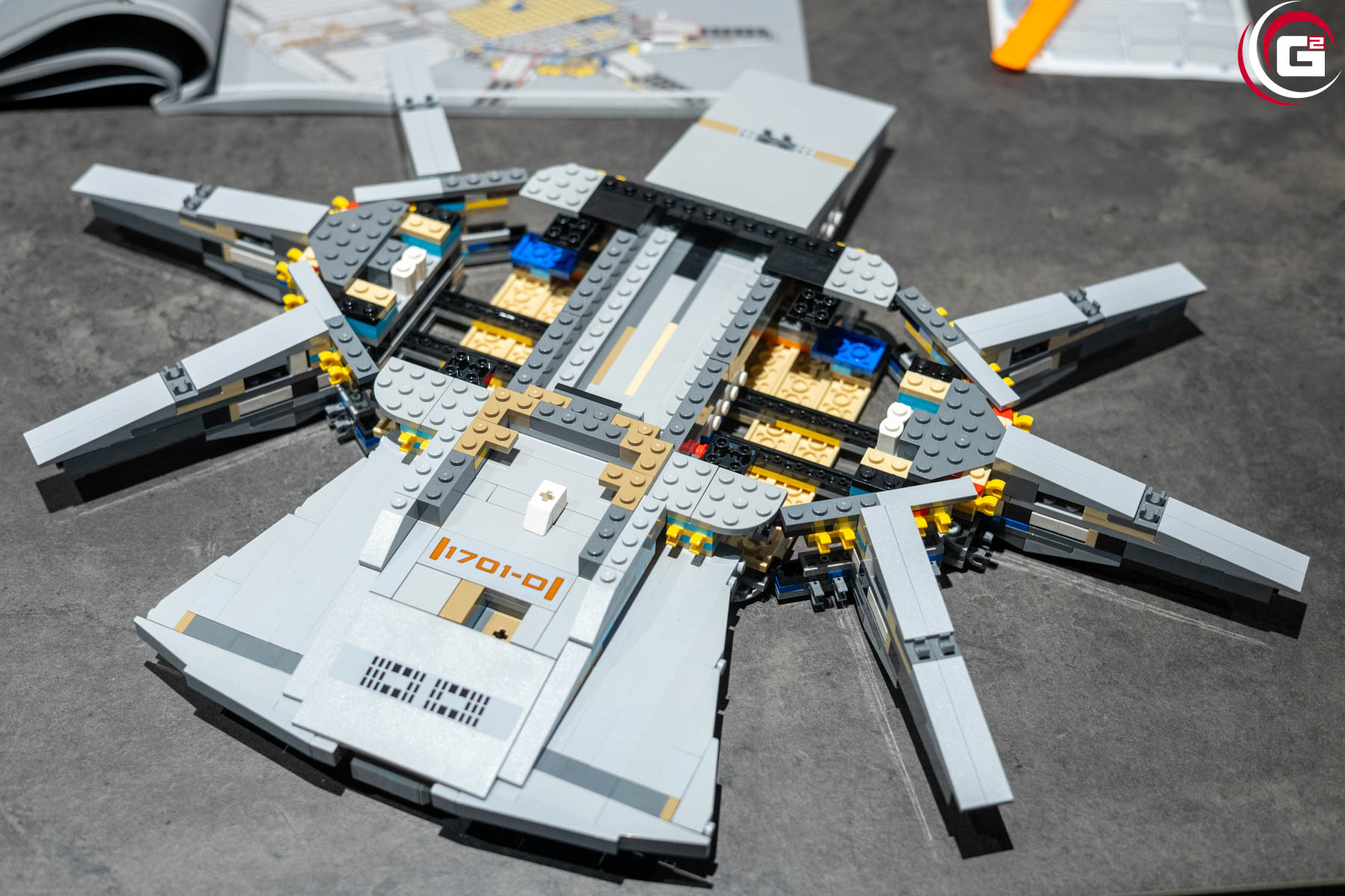 Wie man es von LEGO kennt, sind die Qualität der Bausteine und die Passgenauigkeit hervorragend, auch die Farbgebung ist homogen. Gestaltung und Detaillierung sind hier auf einem extrem hohen Niveau angesiedelt. Es kommen sehr viele bedruckte Teile zum Einsatz, insbesondere an den besonders markanten Stellen. Es gibt jedoch auch einige Sticker, die man ruhig durch weitere bedruckte Teile hätte ersetzen können. Durch seine Größe besitzt das Modell natürlich ein durchaus beeindruckendes Gewicht. Dank der extrem stabilen Konstruktion stellt dies kein Problem dar und auch der Modellständer ist so konzipiert, dass er das Modell stets stabil hält. Hierbei wurde auch berücksichtigt, dass das Modell nicht das Gleichgewicht verlieren darf, wenn man die Untertassensektion abnimmt. Zum Tragen wird in der Anleitung darauf hingewiesen, wie man das Modell am besten greifen kann, ohne etwas zu beschädigen.