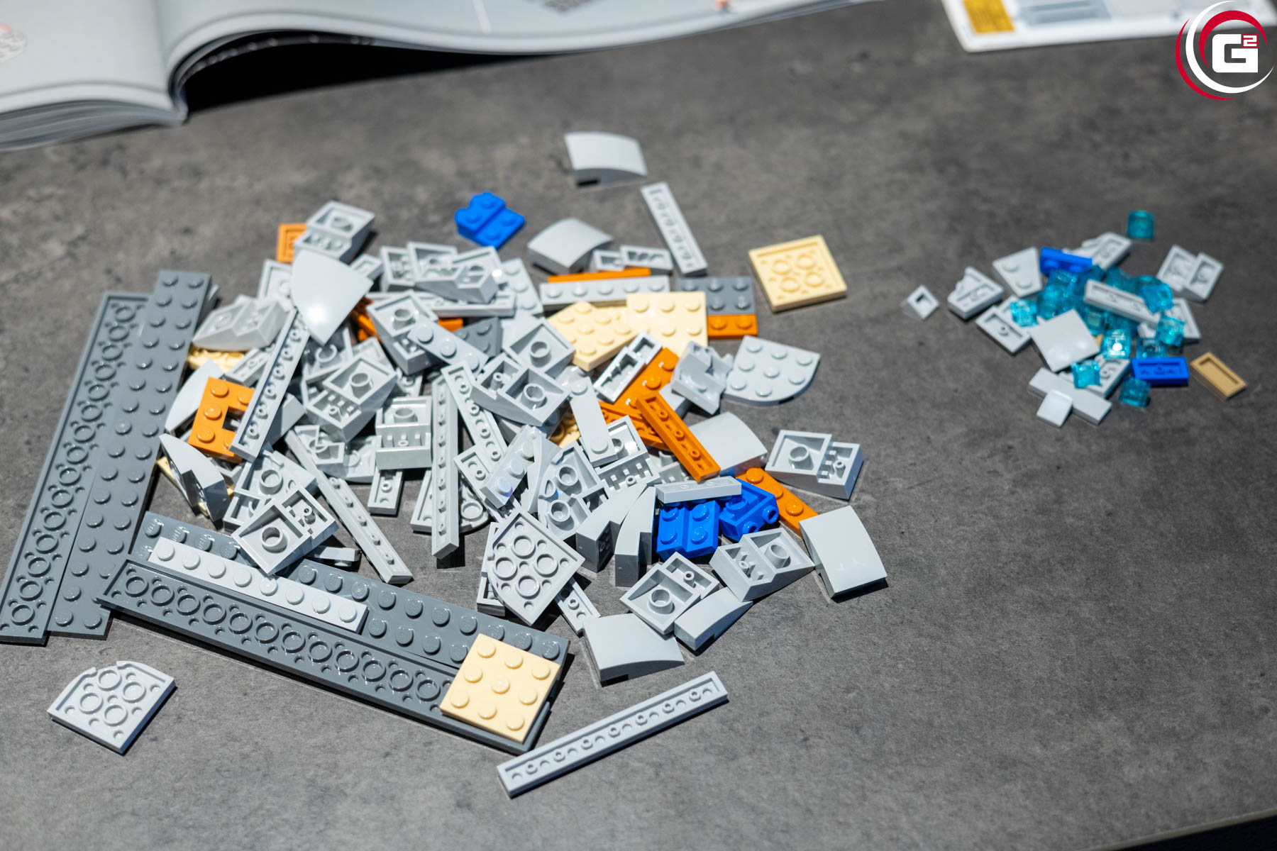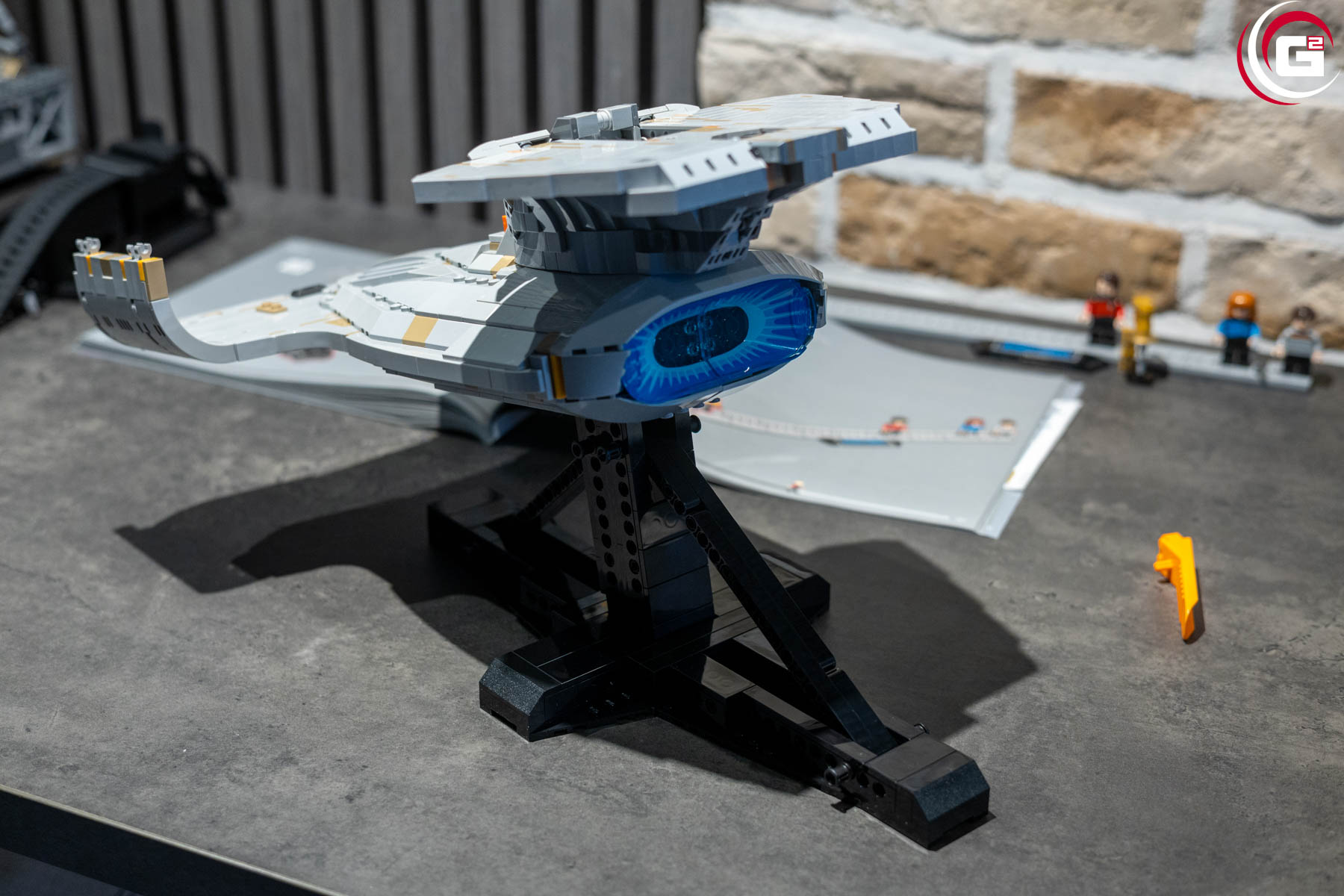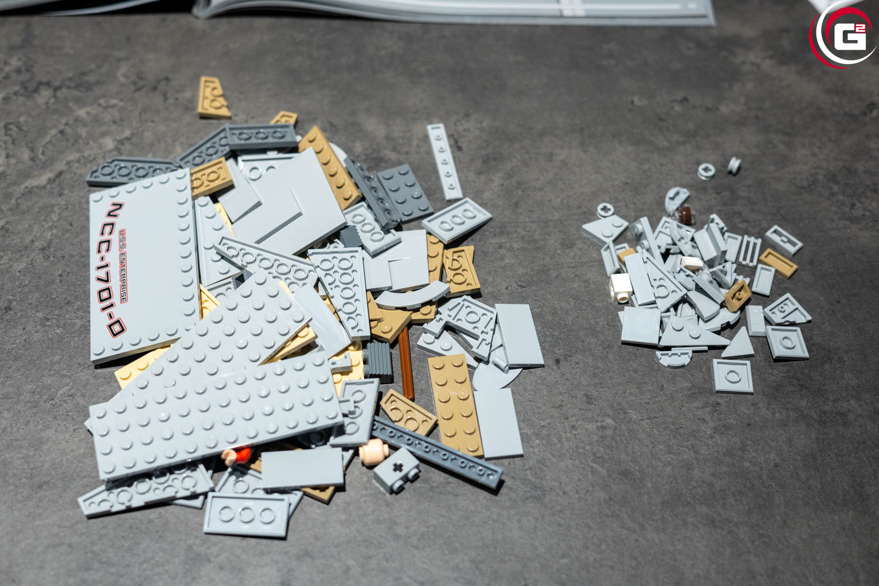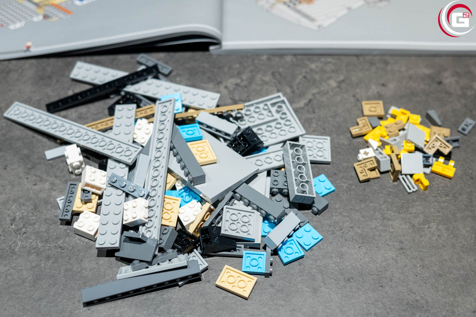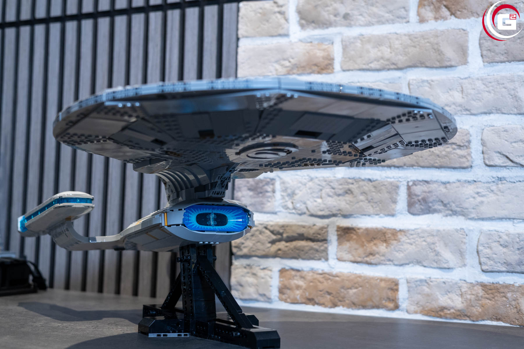 Wie man es von LEGO kennt, sind die Qualität der Bausteine und die Passgenauigkeit hervorragend, auch die Farbgebung ist homogen. Gestaltung und Detaillierung sind hier auf einem extrem hohen Niveau angesiedelt. Es kommen sehr viele bedruckte Teile zum Einsatz, insbesondere an den besonders markanten Stellen. Es gibt jedoch auch einige Sticker, die man ruhig durch weitere bedruckte Teile hätte ersetzen können. Durch seine Größe besitzt das Modell natürlich ein durchaus beeindruckendes Gewicht. Dank der extrem stabilen Konstruktion stellt dies kein Problem dar und auch der Modellständer ist so konzipiert, dass er das Modell stets stabil hält. Hierbei wurde auch berücksichtigt, dass das Modell nicht das Gleichgewicht verlieren darf, wenn man die Untertassensektion abnimmt. Zum Tragen wird in der Anleitung darauf hingewiesen, wie man das Modell am besten greifen kann, ohne etwas zu beschädigen.
